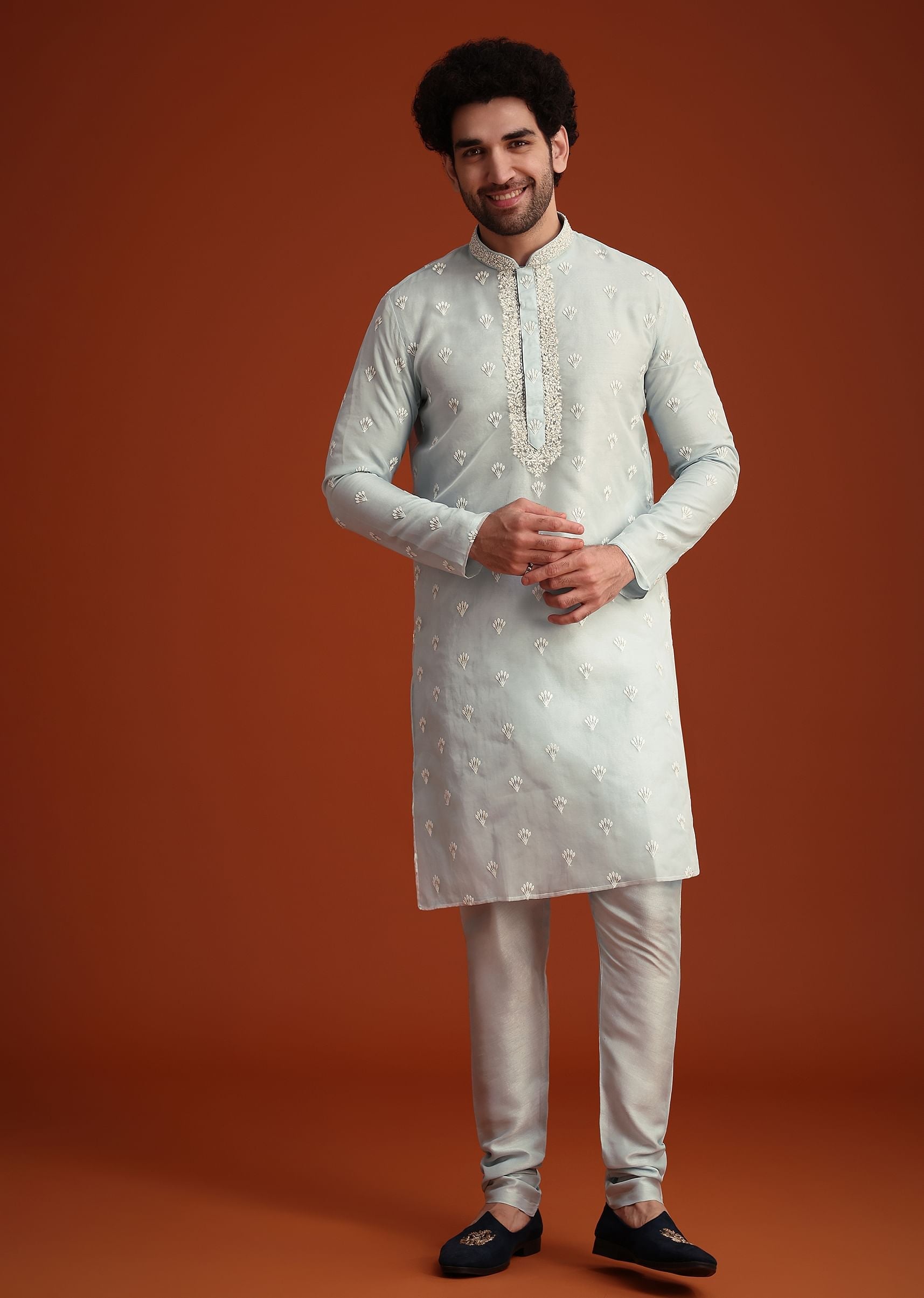 - This blue organza Aligarhi kurta boasts intricate zari embroidery that adds a regal touch.