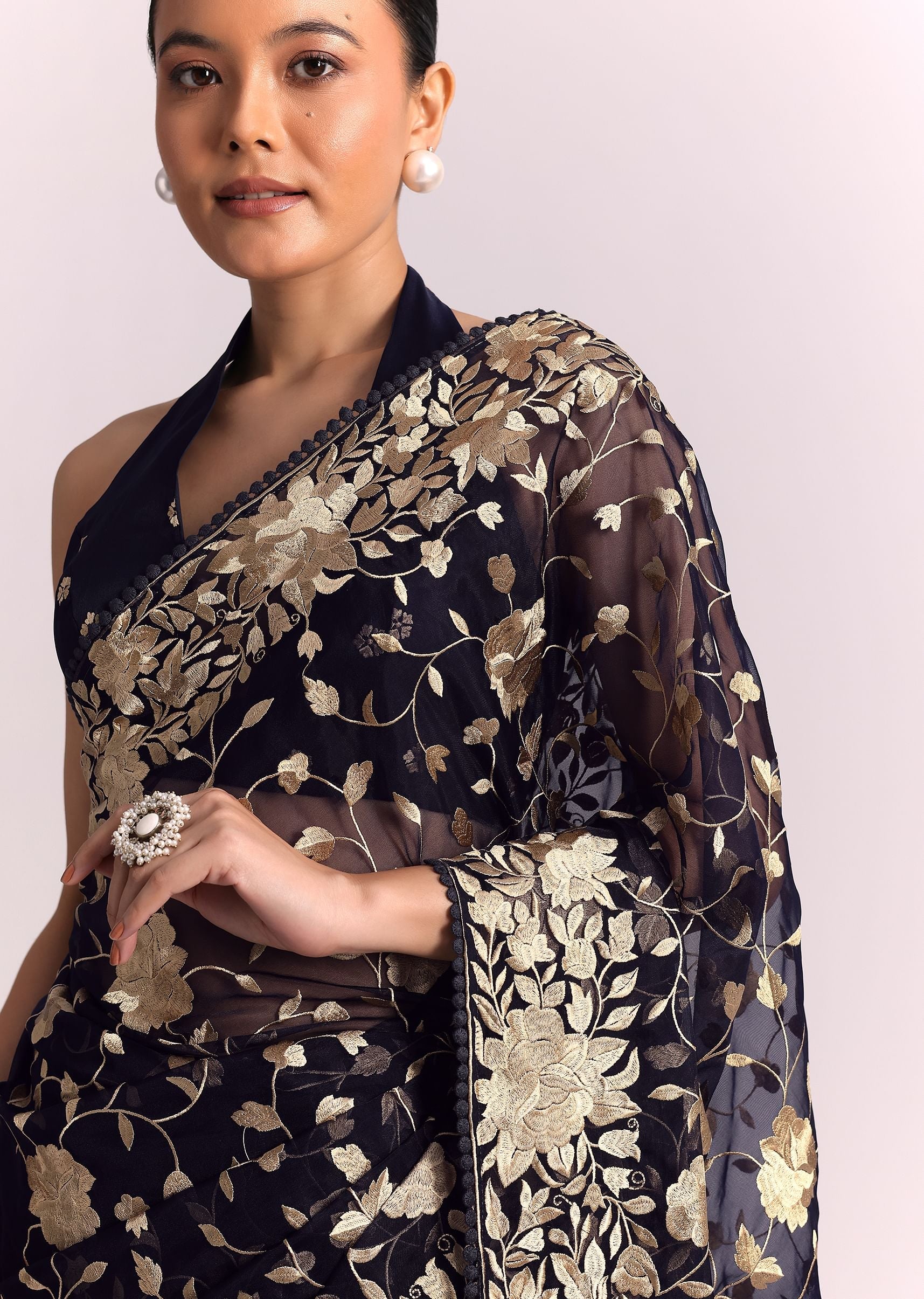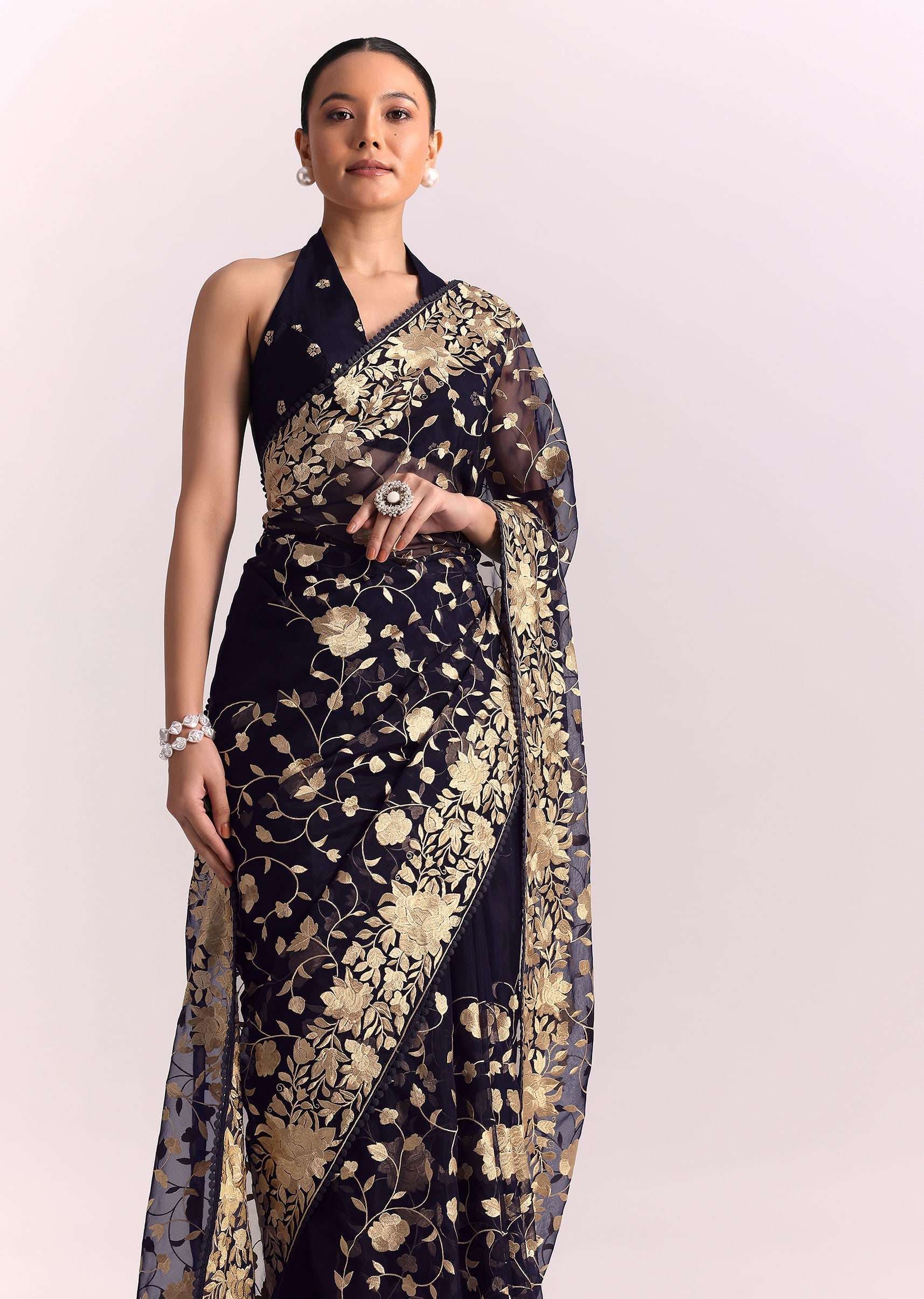 Step into a world of luxury and glamour with this breathtaking sheer organza saree. Featuring detailed parsi gara embroidery in hues of gold that add a touch of opulence to its sensous silhouette. Ideal for cocktail parties and celebrations this saree will help you embrace your aesthetic with finesse. Awarded as the Most Trusted Brand, we're delivering styles you love, just as promised.