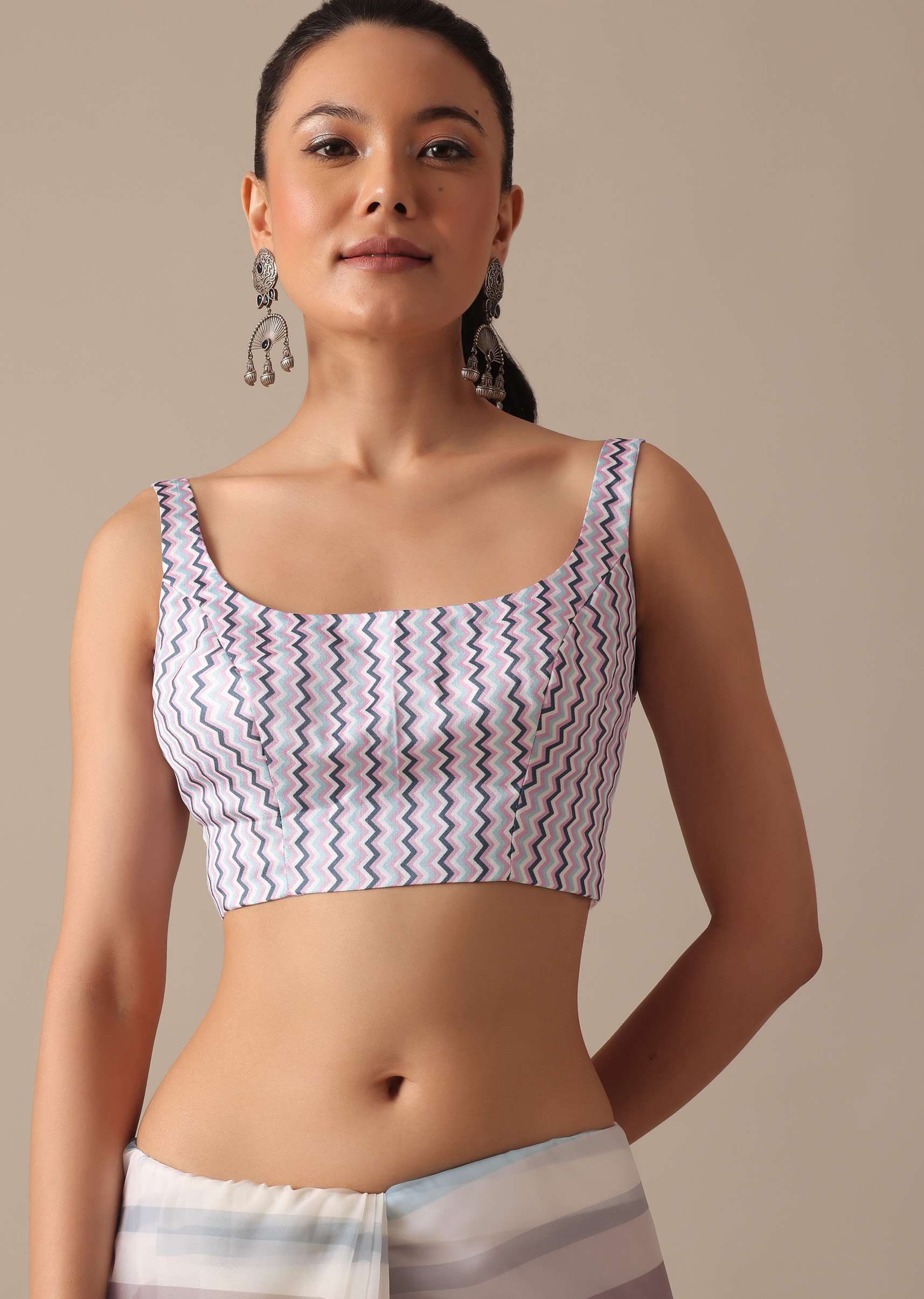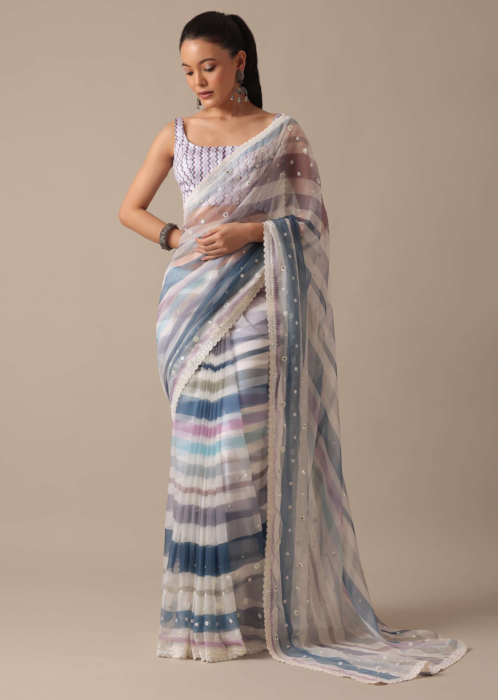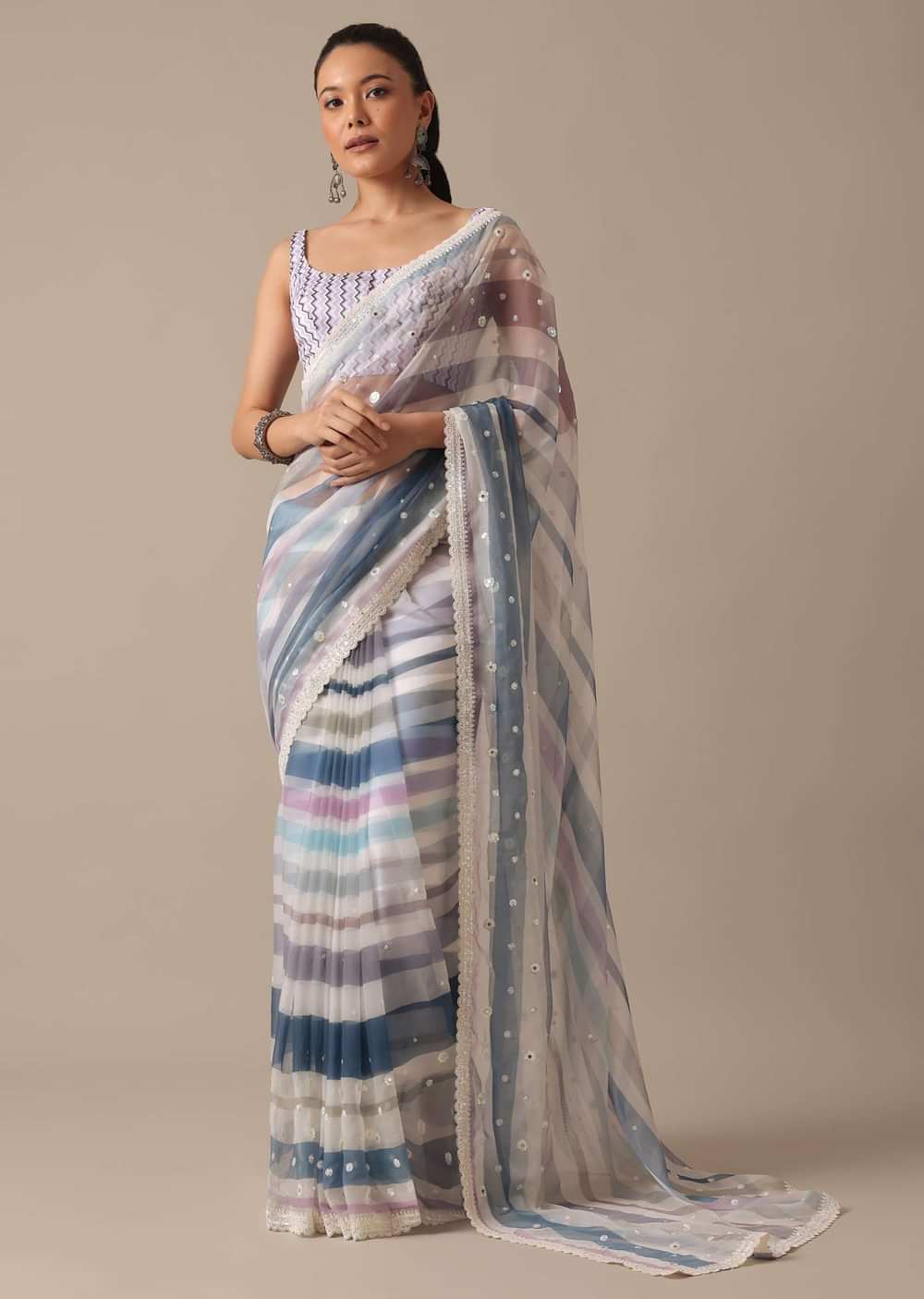 Shine as bright as your personality with this gorgeous organza saree. Prettified with multi-stripes, it comes decked in glistening mirrors all over. The balance of stunning hues and glimmering embellishments... More Product Details