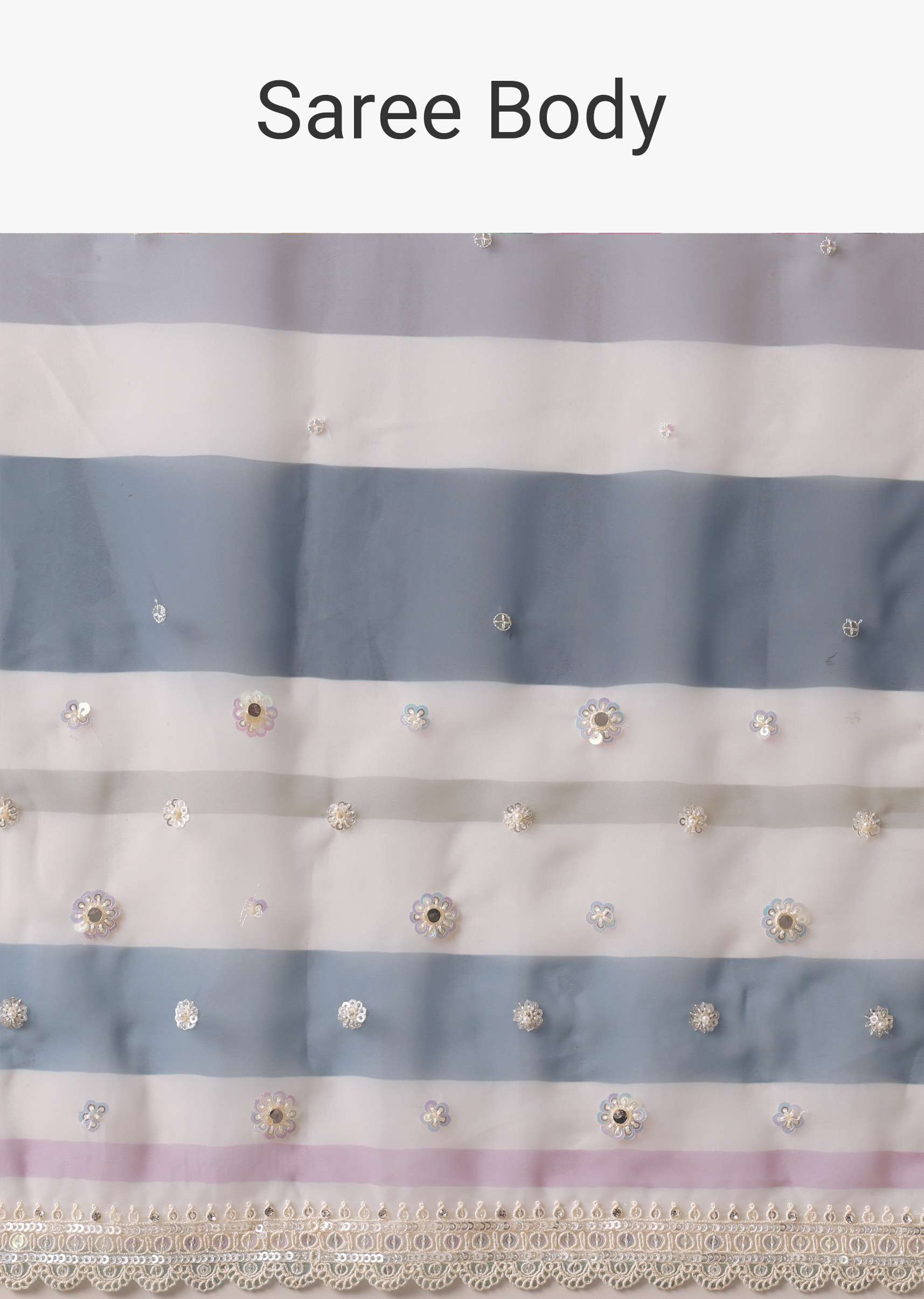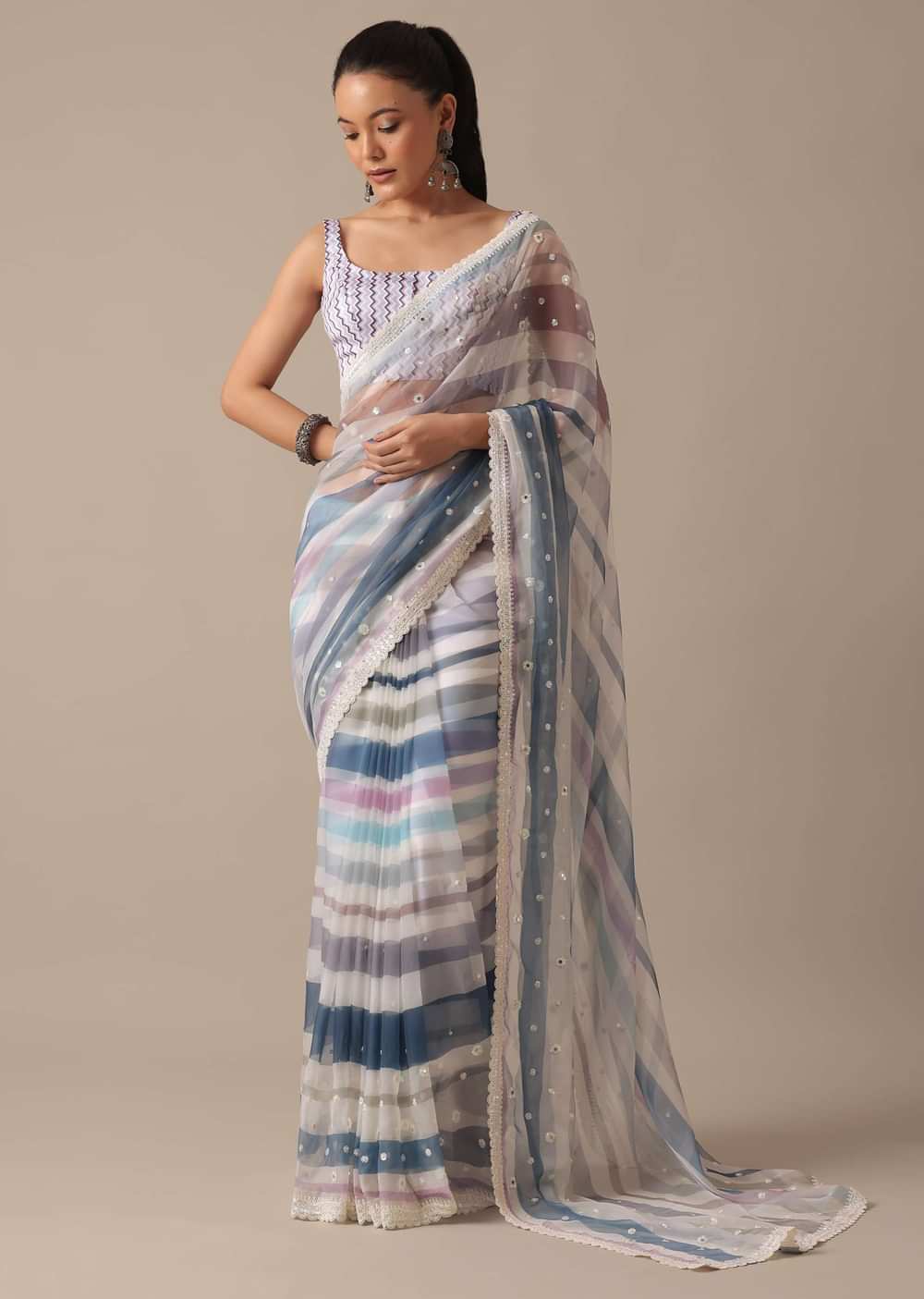Blue Organza Striped Saree With Mirror Work And Unstitched Blouse Piece