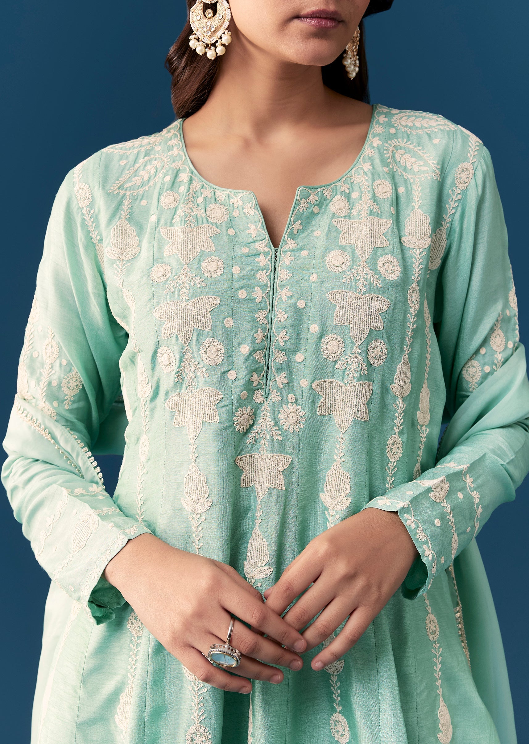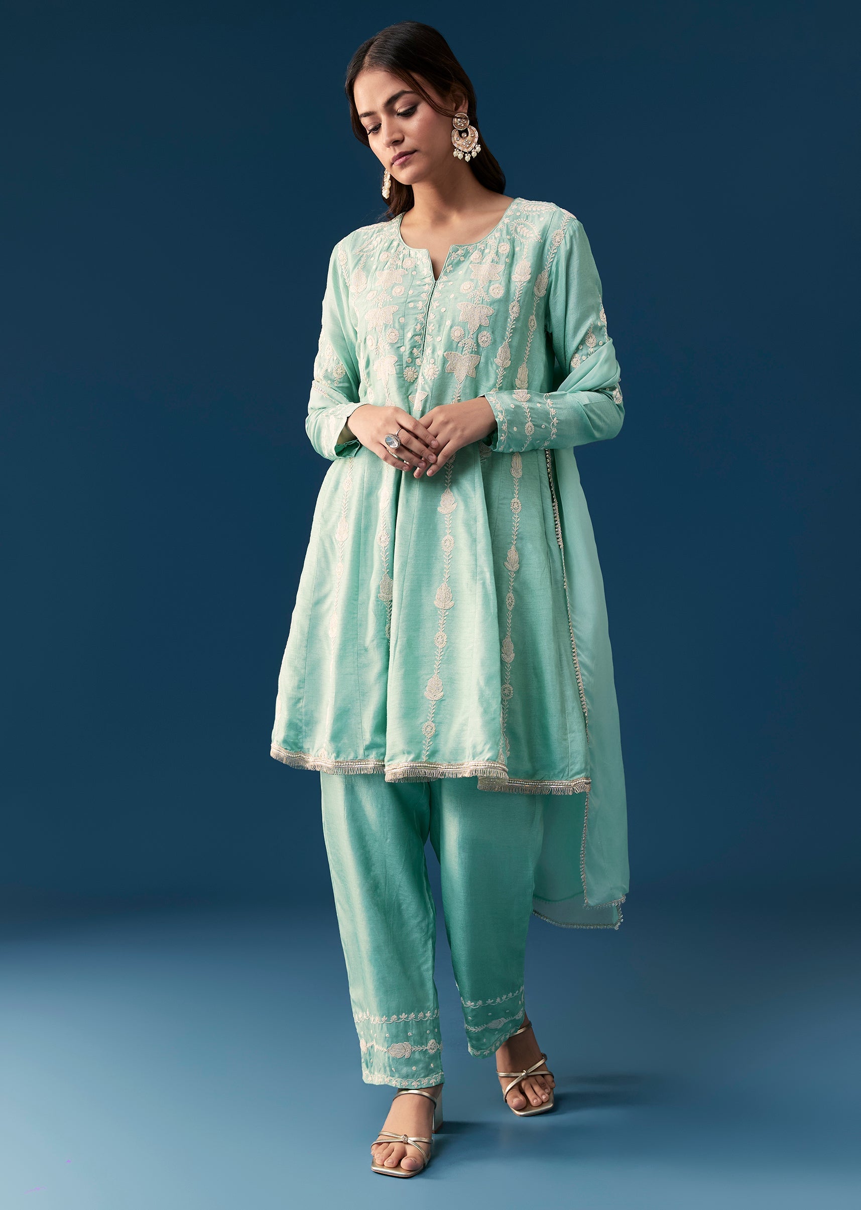 This blue anarkali suit showcases a unique peplum silhouette inspired by Pakistani style, crafted in luxe silk material and elevated with fine thread work embroidery. The set features three fourth... More Product Details