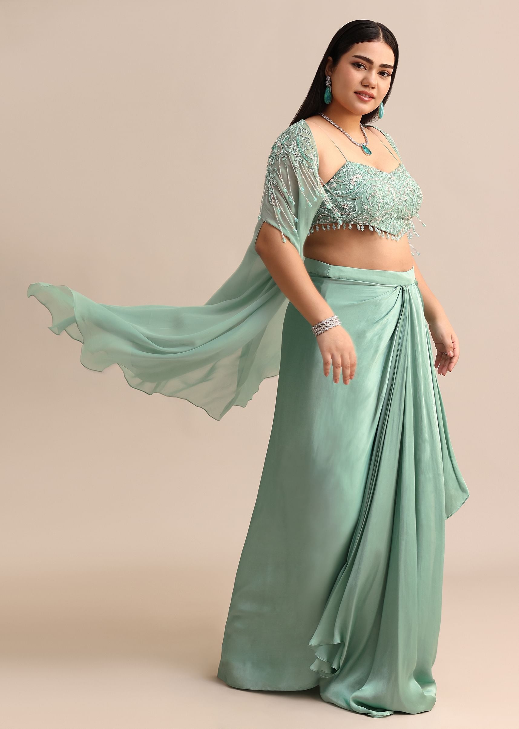 Pack Contains: 1 BLOUSE, 1 PLEATED DRAPE SKIRT AND 1CAPE