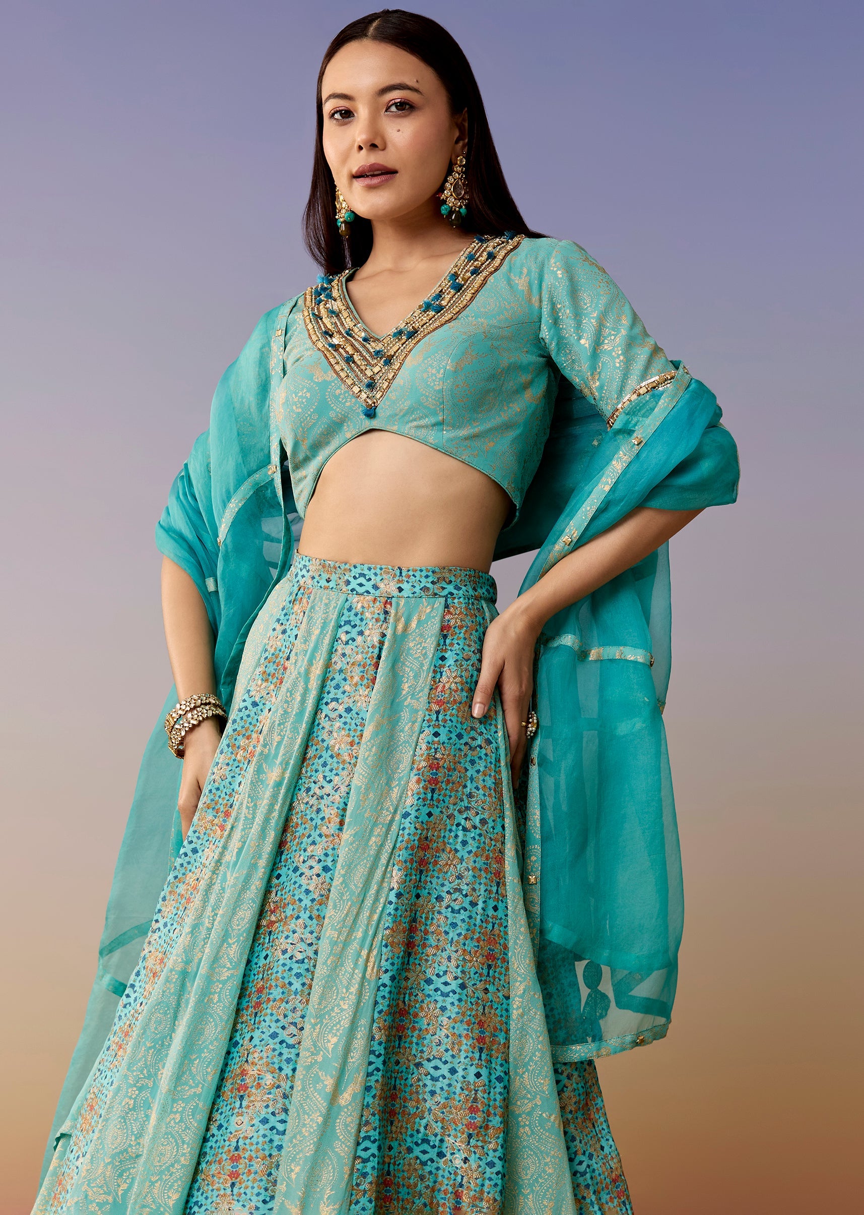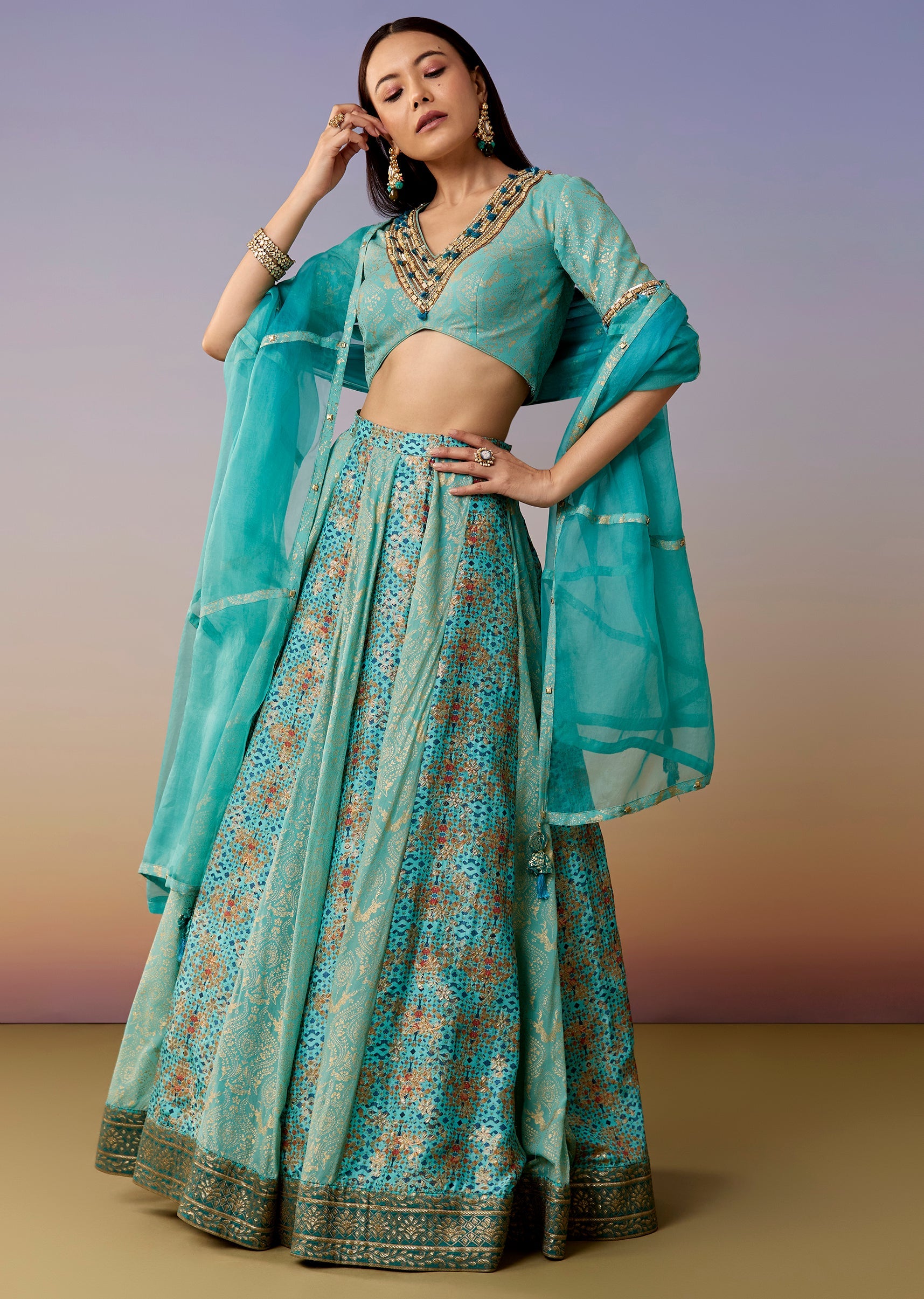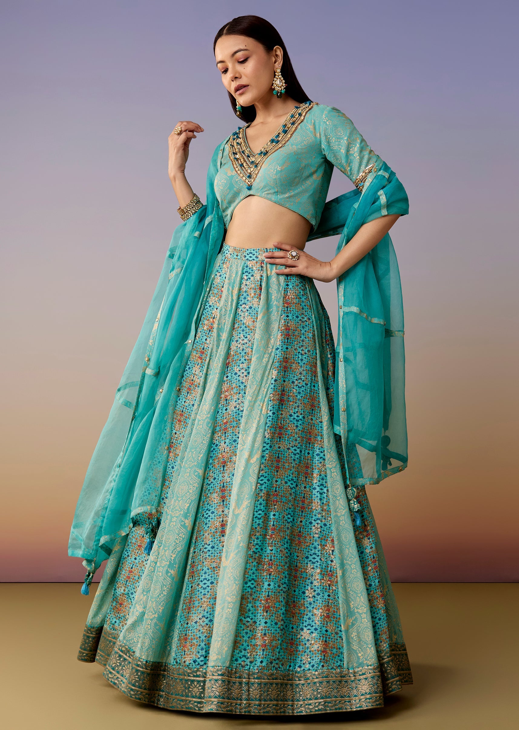 A festive blue lehenga set featuring a half-sleeve V-neck georgette jacquard choli, paired with a printed/jacquard kalidar flared lehenga and dupatta. Made for mehendi, haldi, sangeet, and engagement functions. Awarded... More Product Details