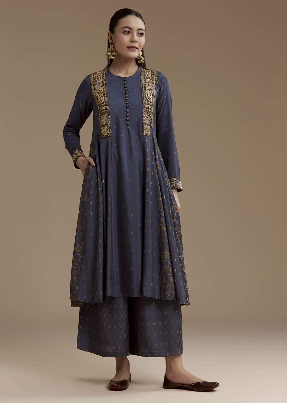 Style Tips: Pair this look with oxidized earrings, velvet mojaris, and a sleek bun for a refined finish. Fit Tips: The flared kurta drapes gracefully over the body, while the palazzo pants ensures breezy comfort throughout the day.