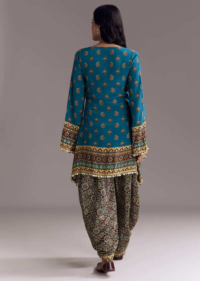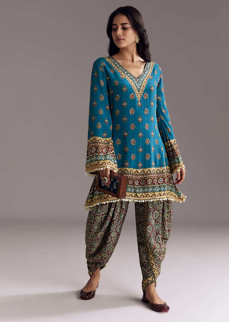 A vibrant crepe kurta and dhoti set in blue featuring bold Ajrakh prints for a festive look with an edge. The kurta features flared sleeves and a flattering V-neckline, adding... More Product Details