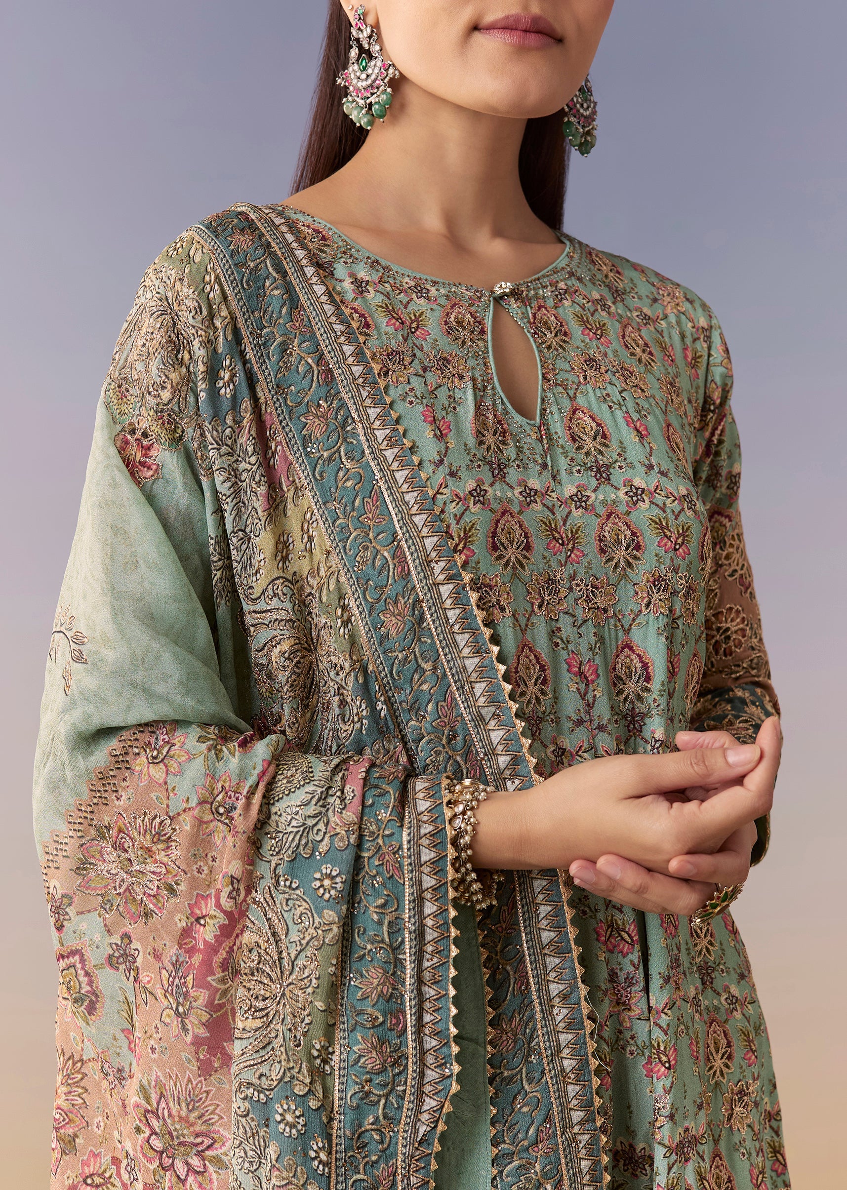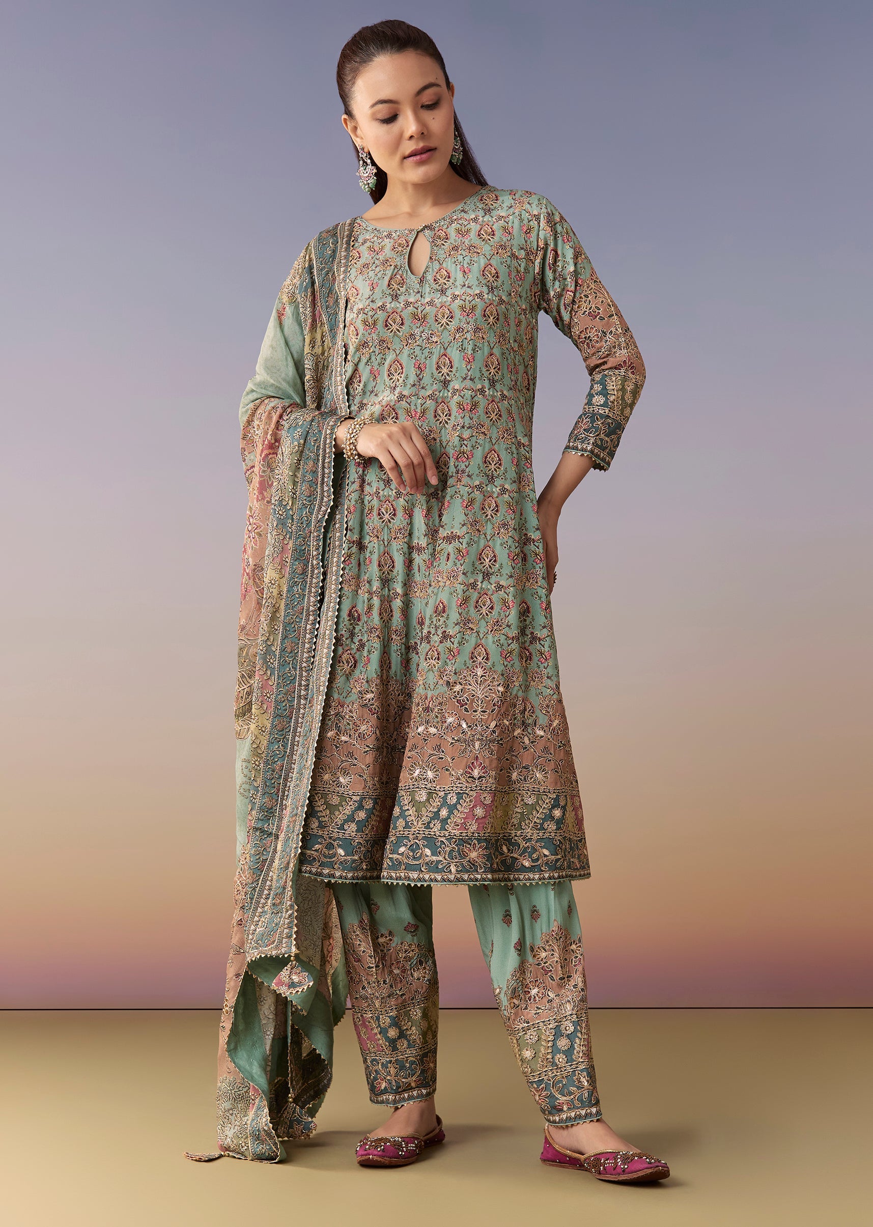 Crafted in soft crepe, this A-line printed kurta is highlighted with gotta lace detailing. Designed with a keyhole neckline, 3/4th sleeves and side zip closure, it is paired with straight-fit... More Product Details
