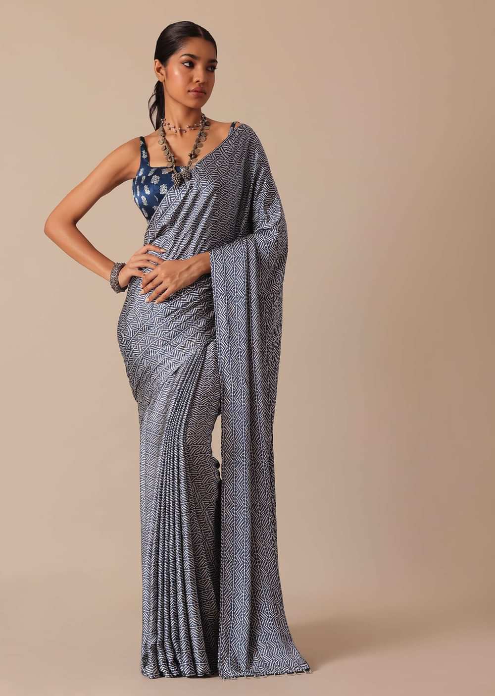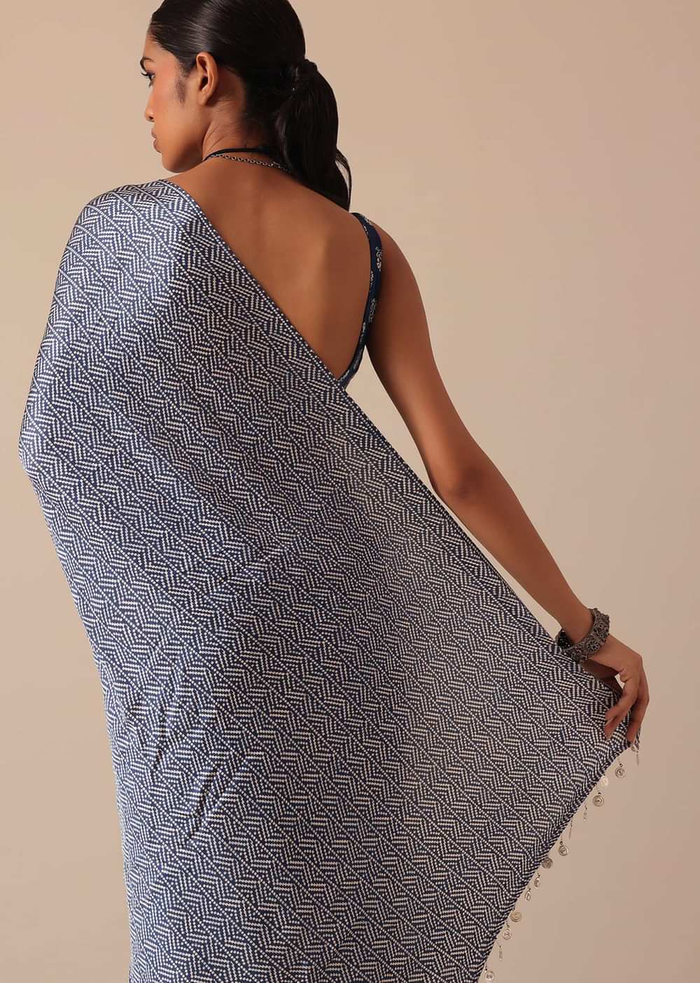 Give your traditional collection a fashionable upgrade with this stunning addition. Accentuated with allover patterns and playful tassels this saree will glide beautifully into your family soirées. Decked with exquisite prints on a luxe satin base this blue drape comes paired with an unstitched blouse piece.WASH CARE INSTRUCTIONS. Awarded As The Most Trusted Brand We'Re Delivering Styles You Love Just As Promised.