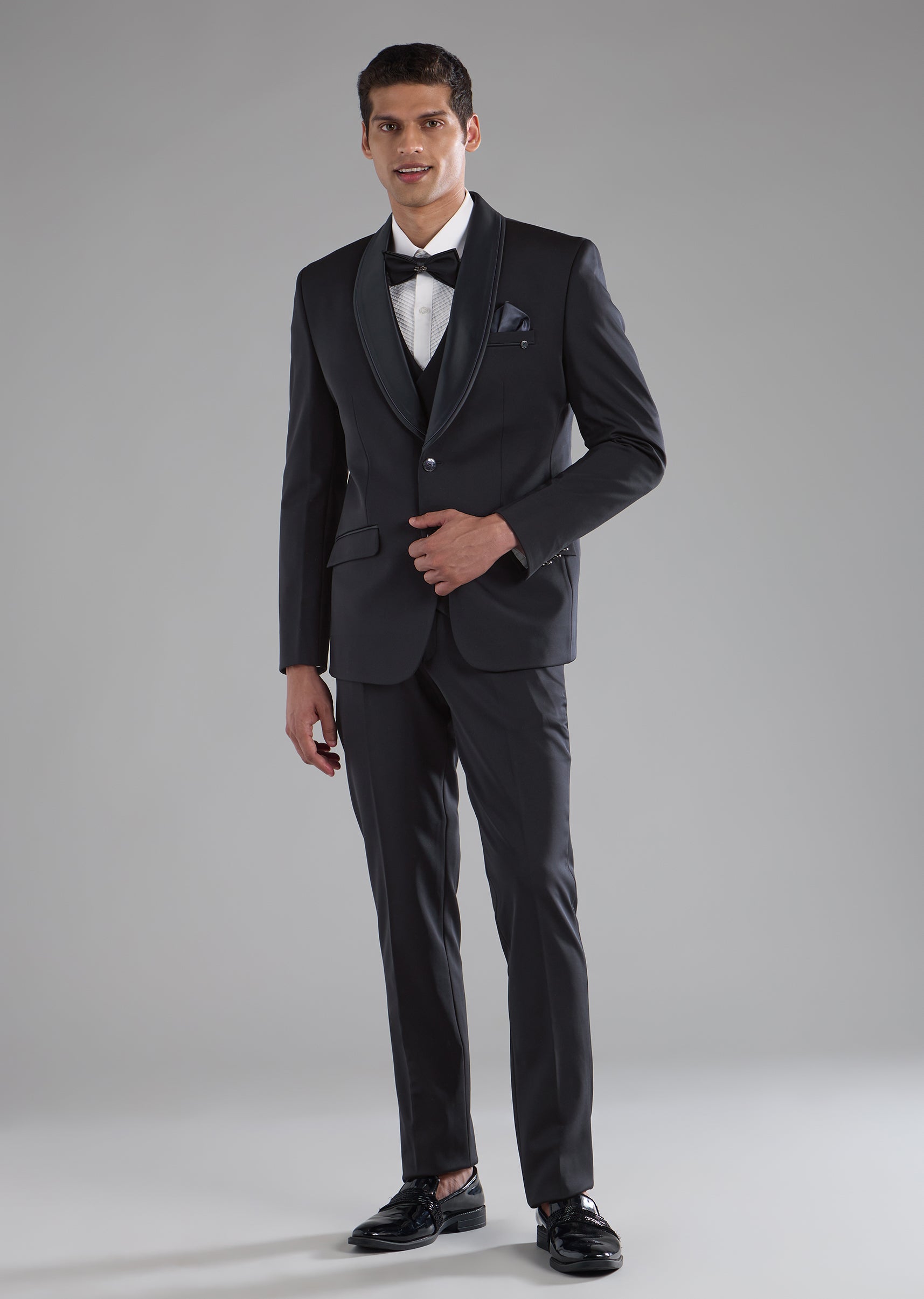 Pair with classic formal shoes and a sleek hairstyle to maintain a sharp, modern tuxedo appearance.