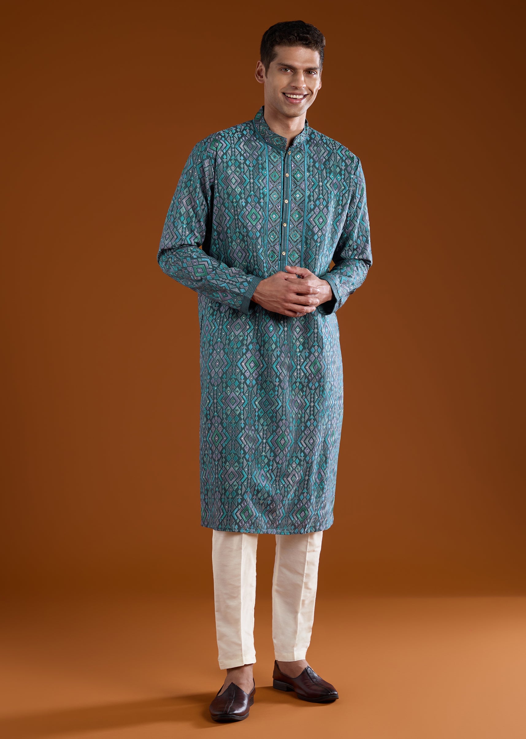 Match it with embroidered juttis and a simple watch for a sleek understated finish.