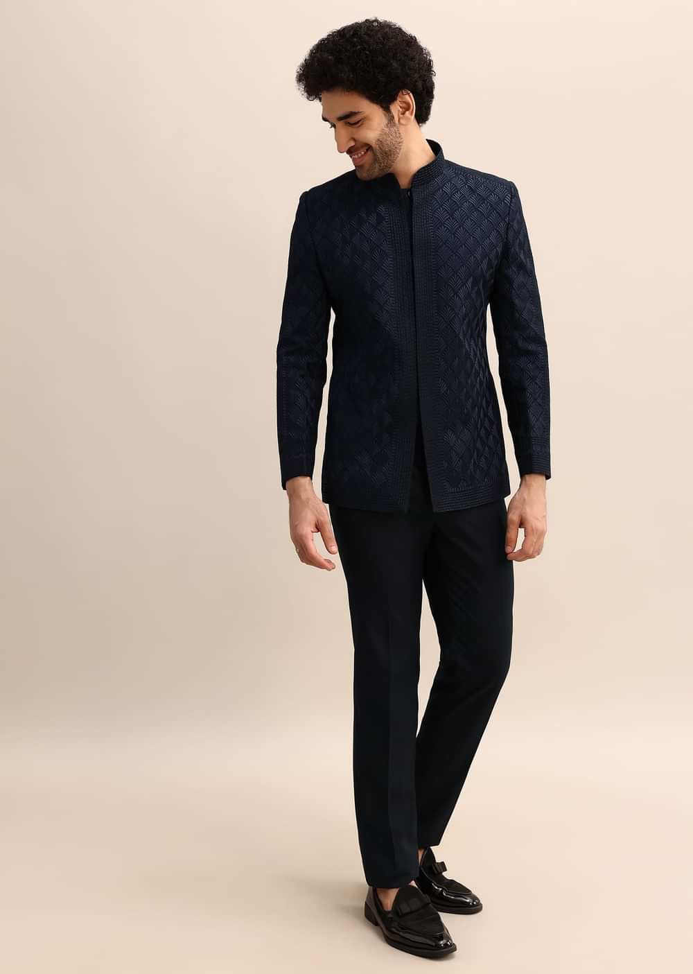 Impress at the reception with a regal air in a royal blue Jodhpuri suit. Shimmering resham embroidery adds a touch of opulence, while the tailored cut flatters your form for a truly unforgettable look.Button design, shape, and size may vary as per availability. Awarded as the Most Trusted Brand, we're delivering styles you love, just as promised.