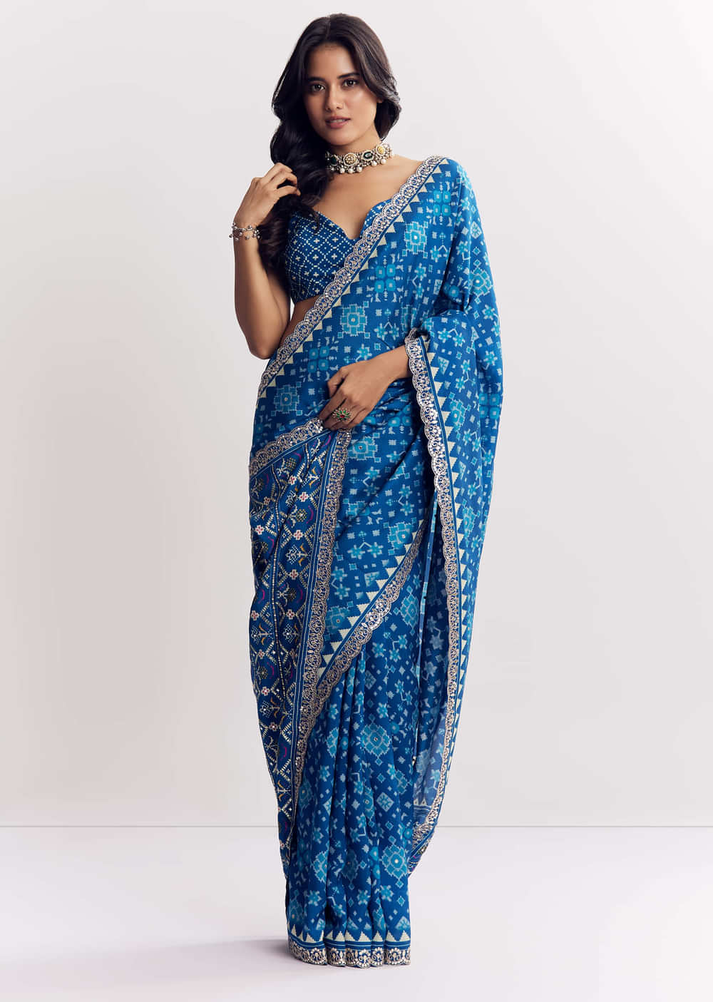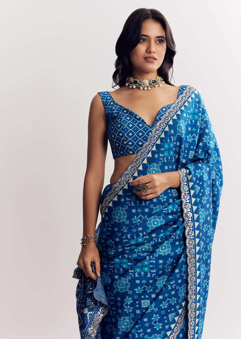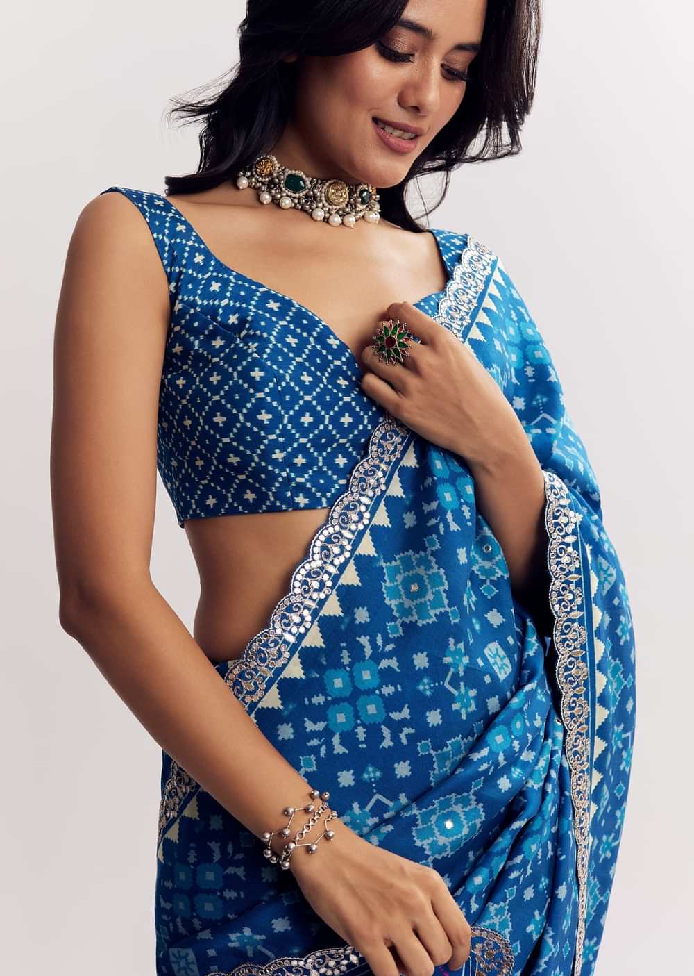 Blue Satin Ikat Printed Saree With Gota And Mirror Embroidery