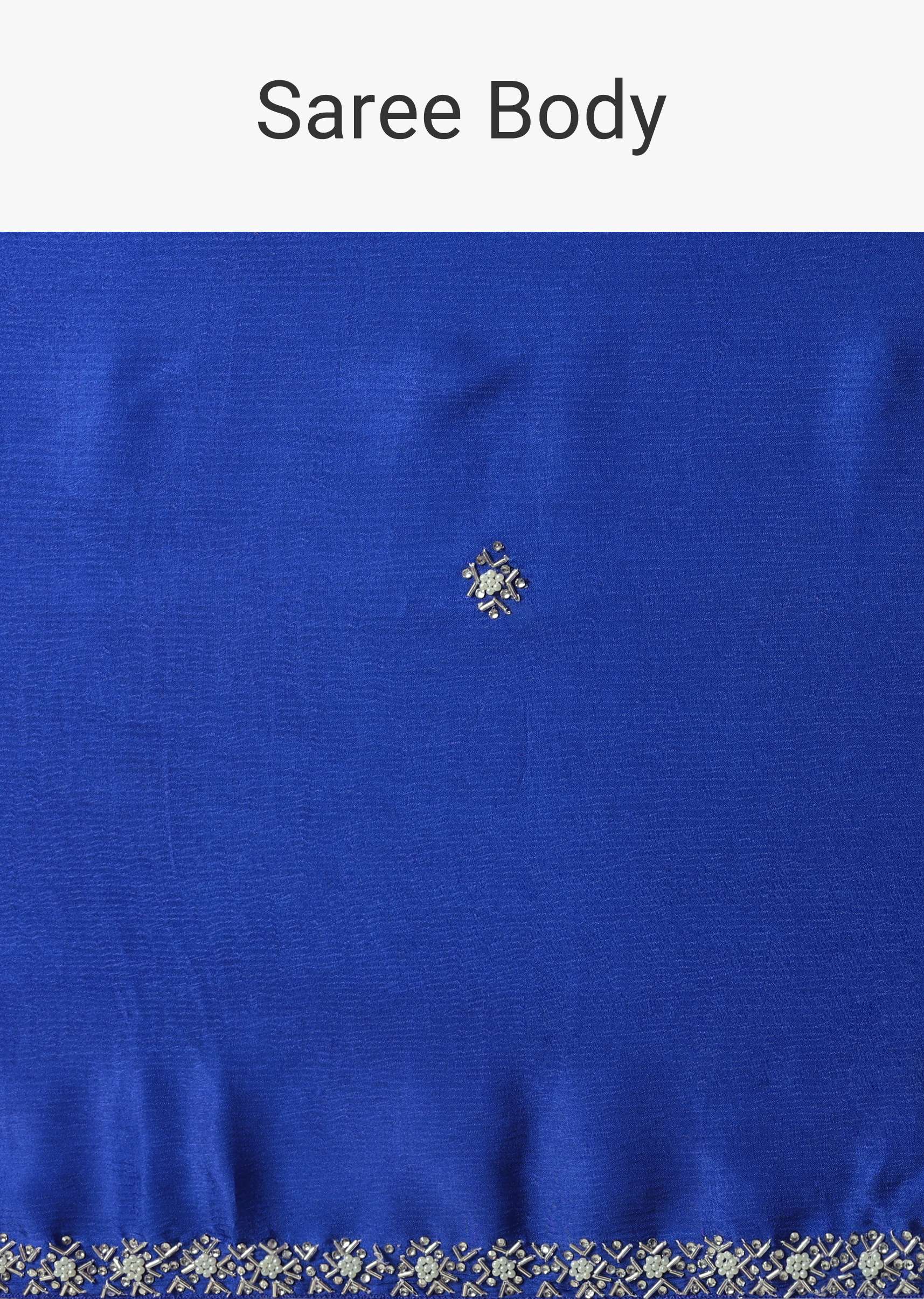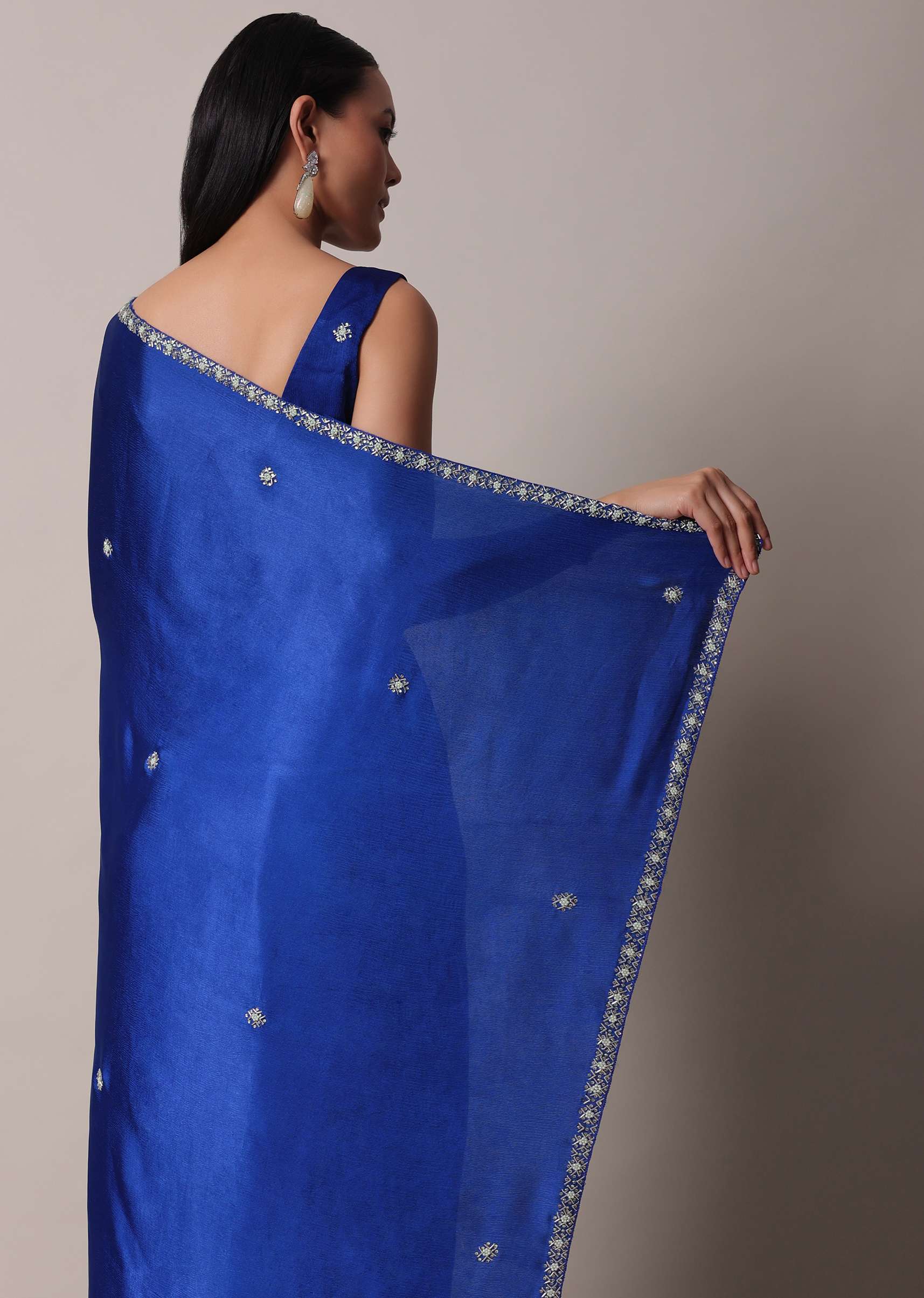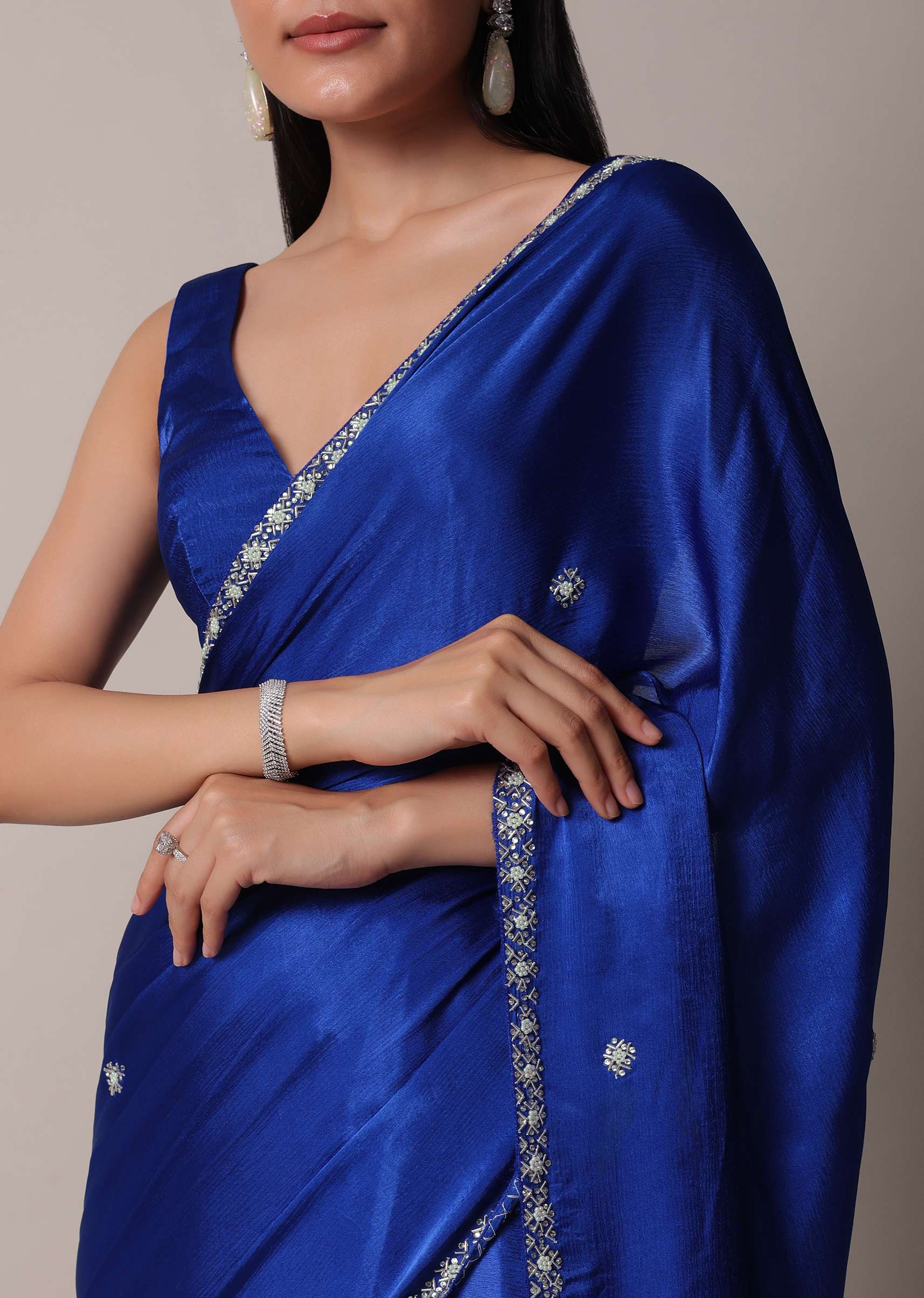 Blue Satin Saree With Stone Embellished Border And Unstitched Blouse Piece