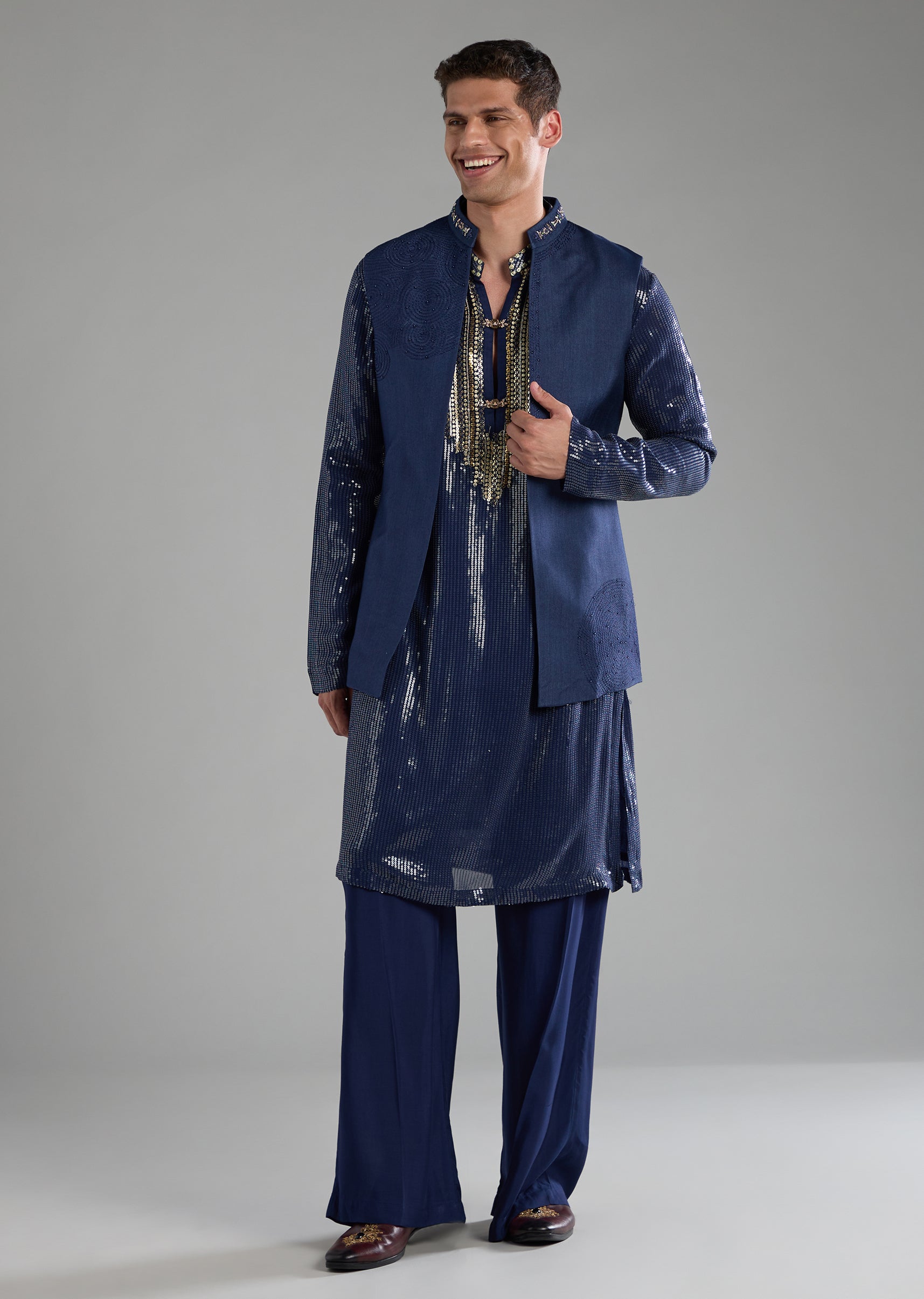 Blue Sequin Embellished Mens Jacket Kurta Set