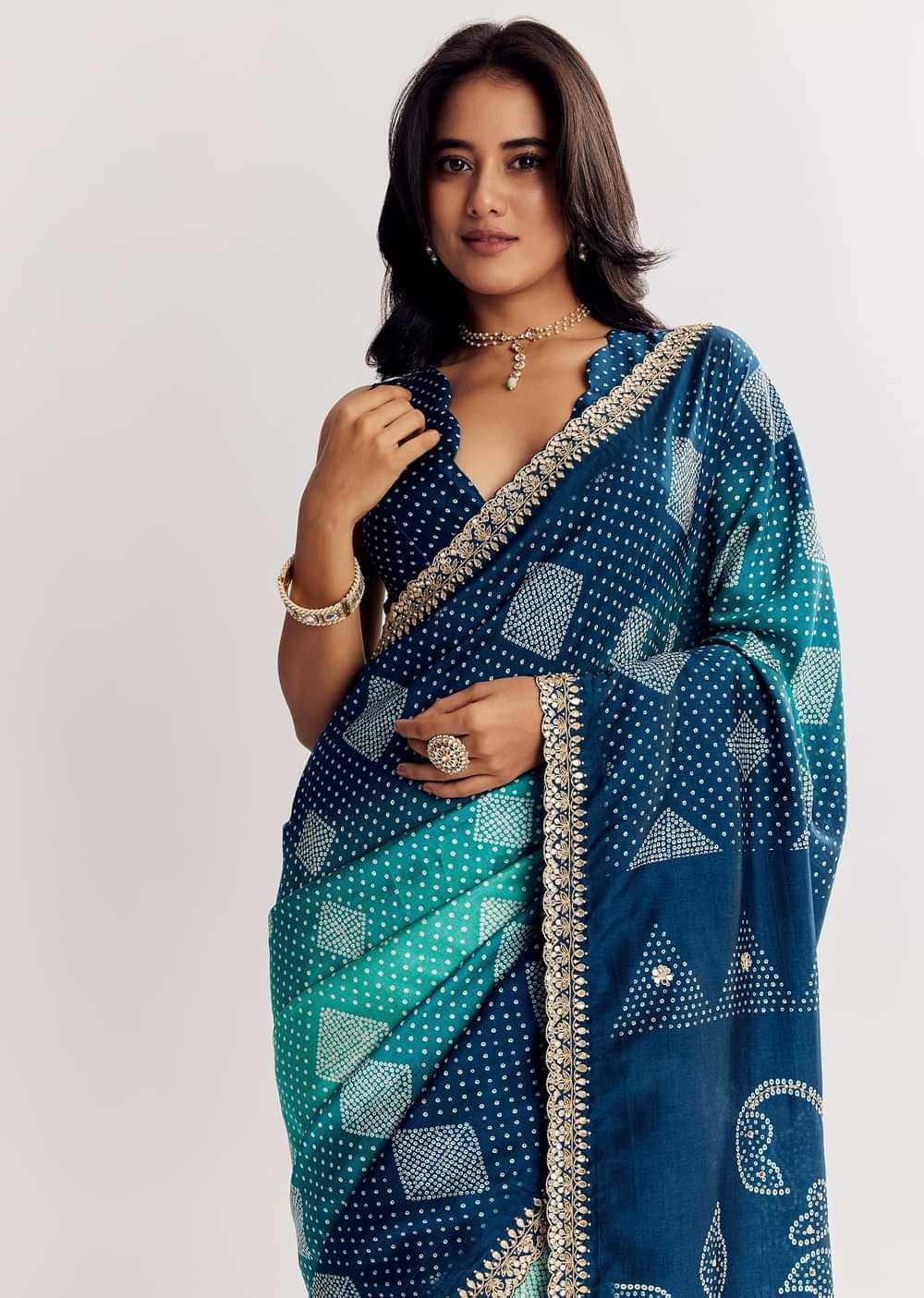Like waves at dusk, this blue shaded muslin saree shimmers with gota, mirror, zari, and sequins embroidery set in a scalloped border. Awarded as the Most Trusted Brand, we're delivering styles you love, just as promised.
