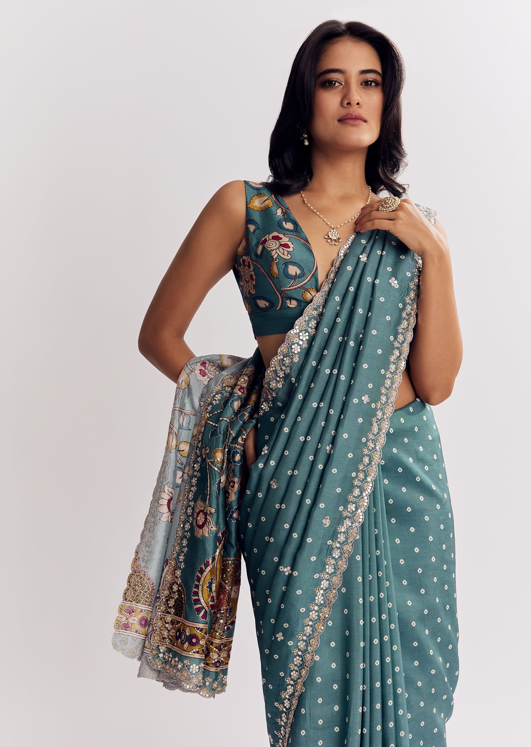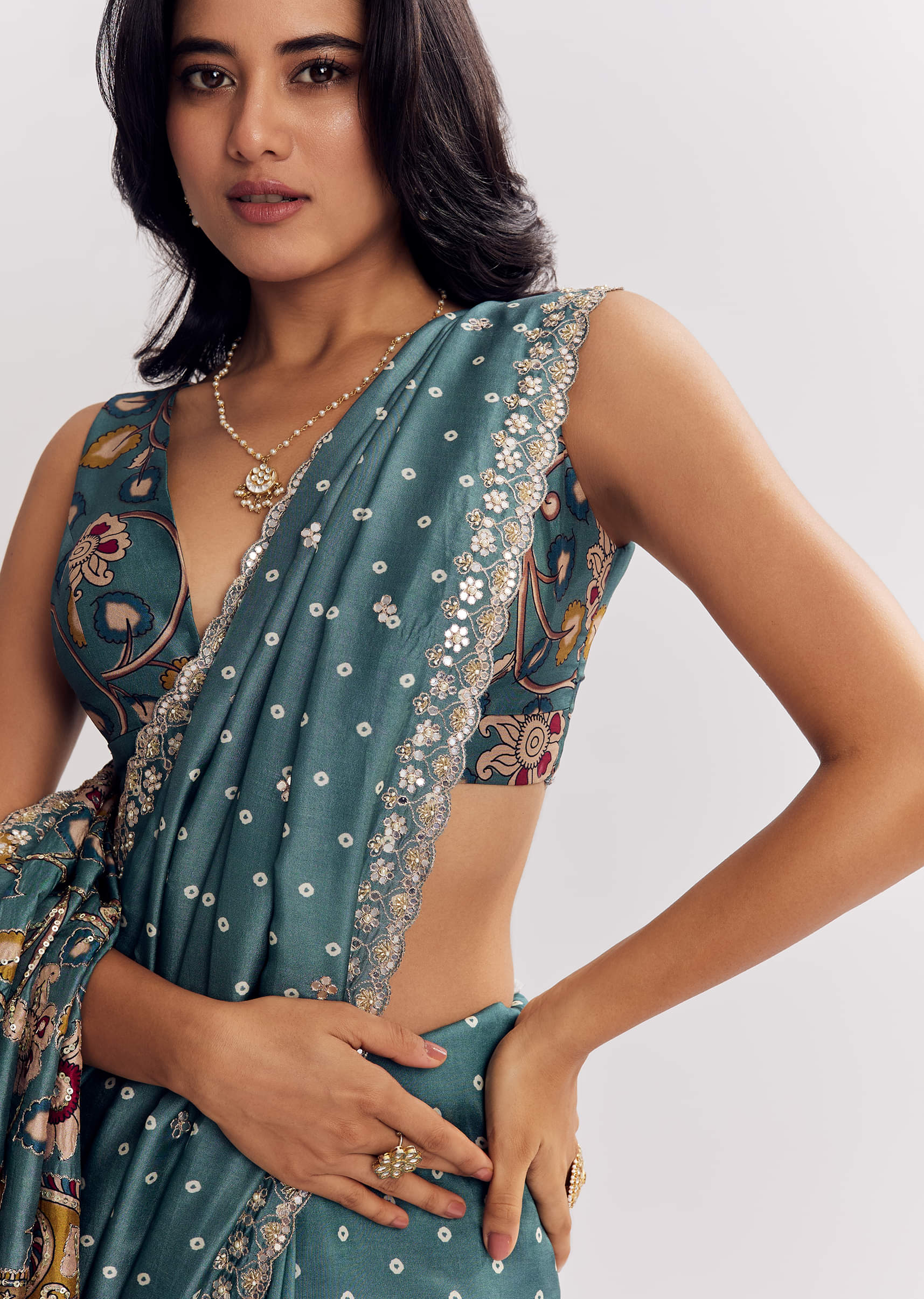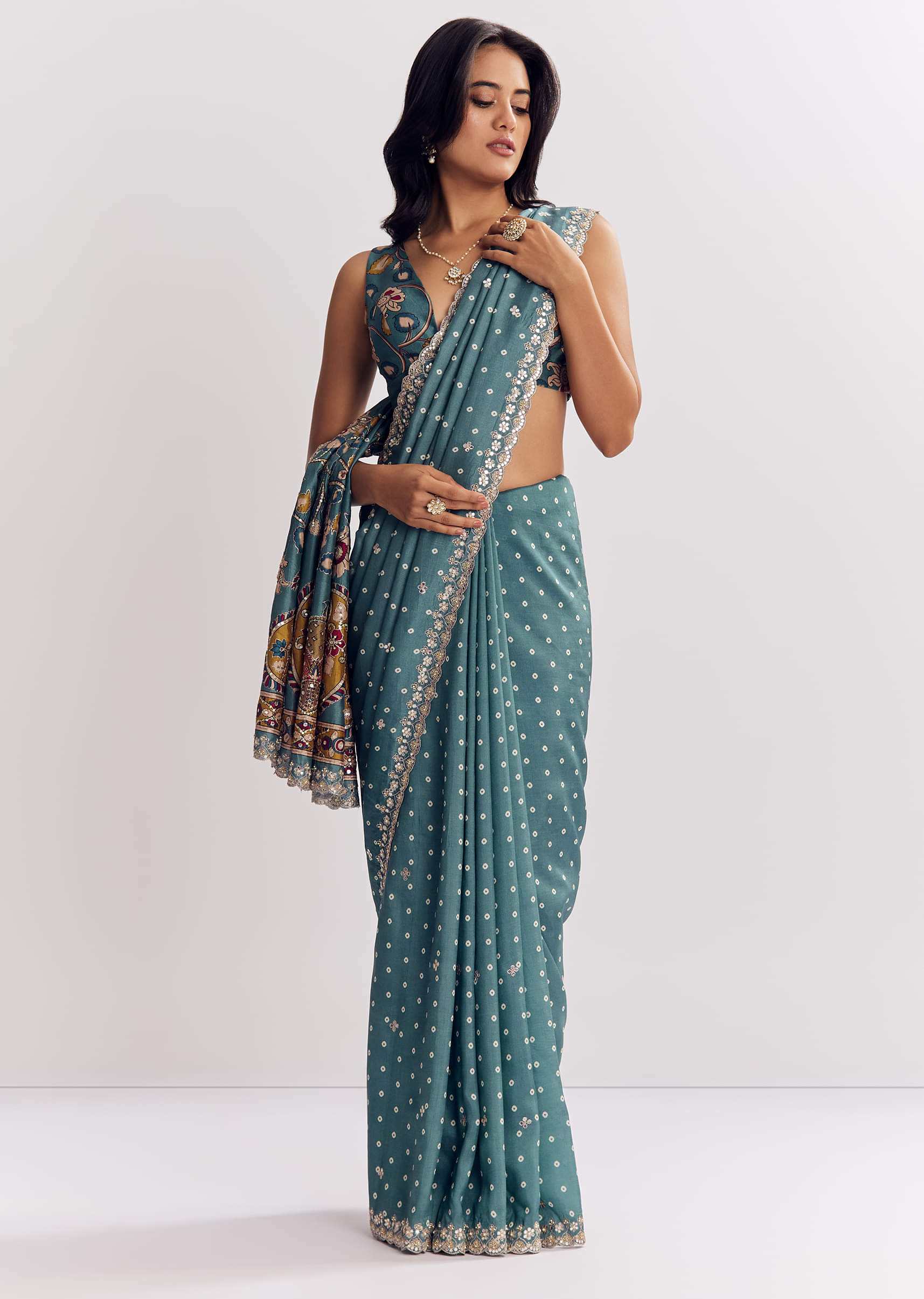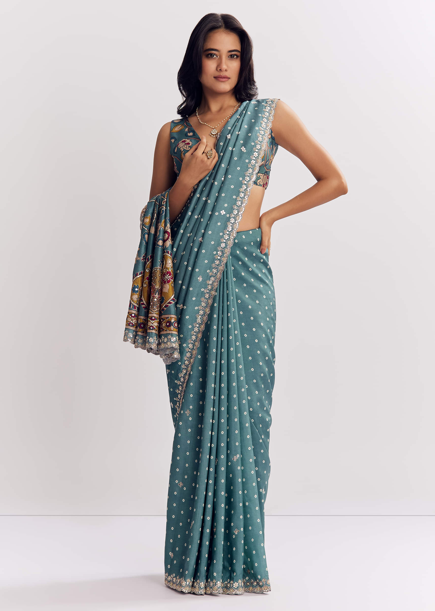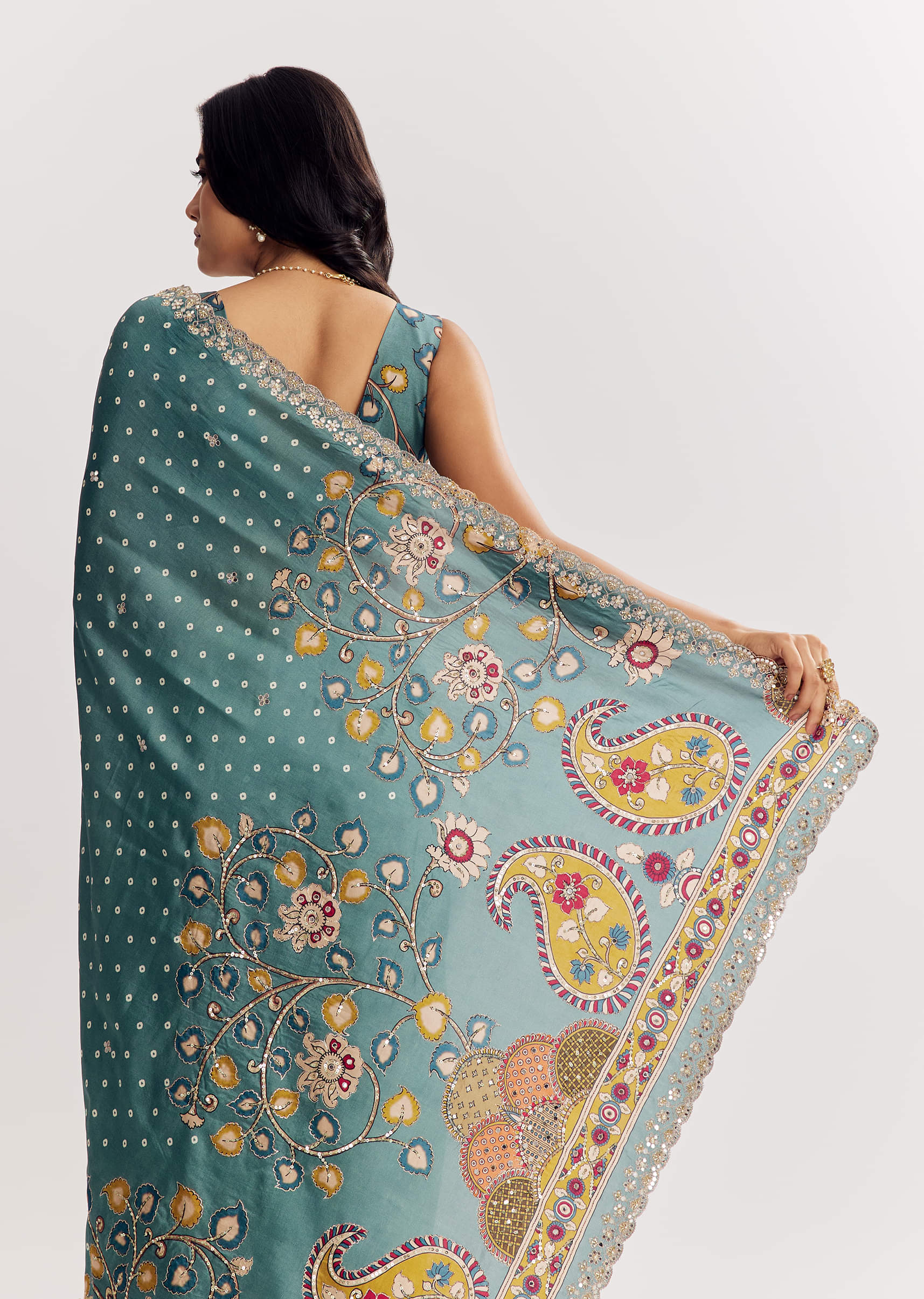 A dreamy cascade in blue shades, this muslin printed saree gleams with mirror, gota, zari, and sequins along a scalloped border for luminous elegance. Awarded as the Most Trusted Brand, we're delivering styles you love, just as promised.