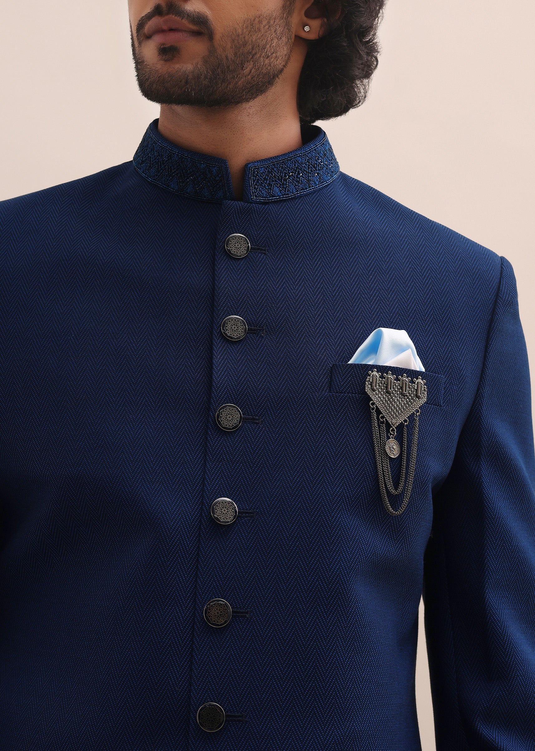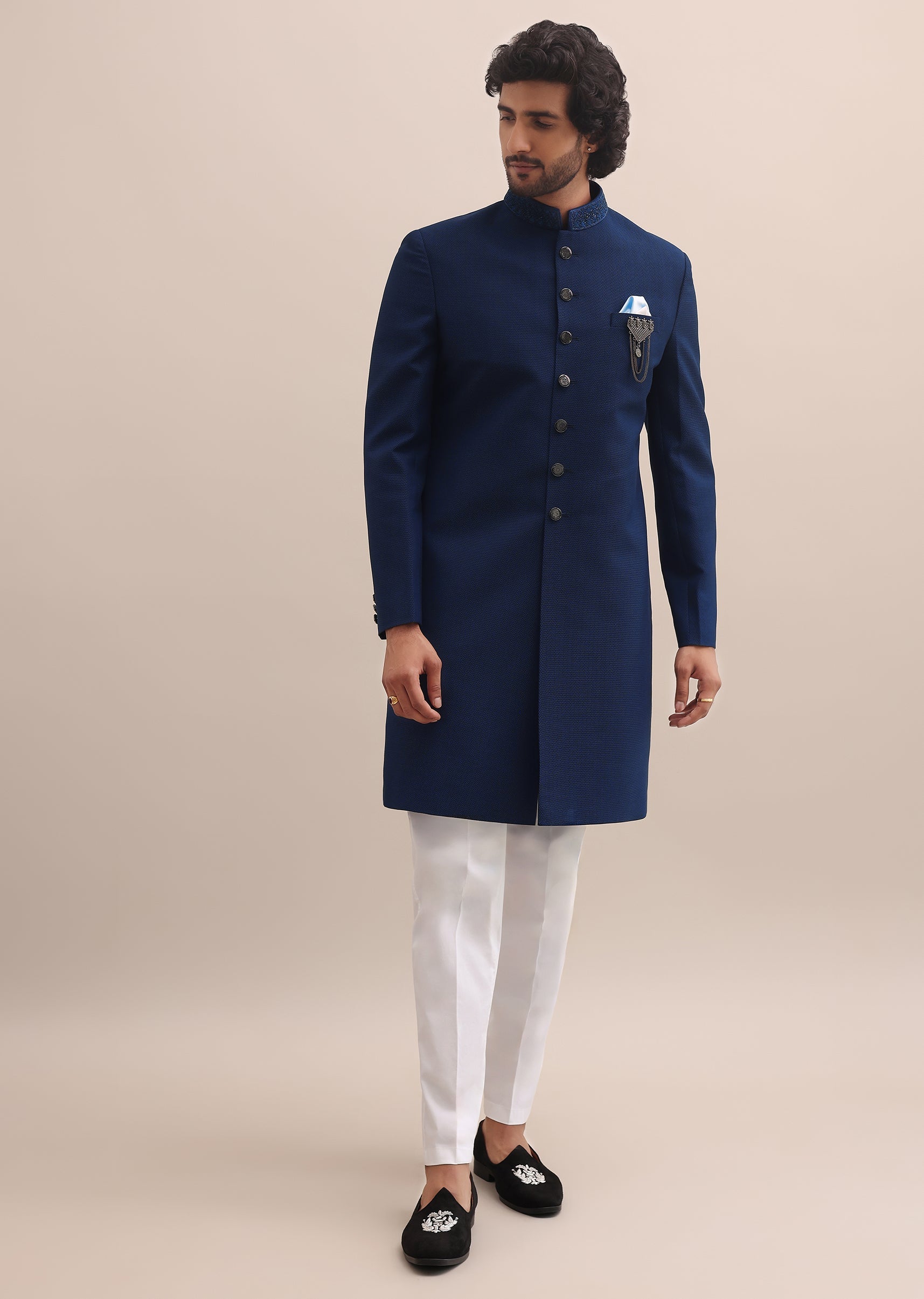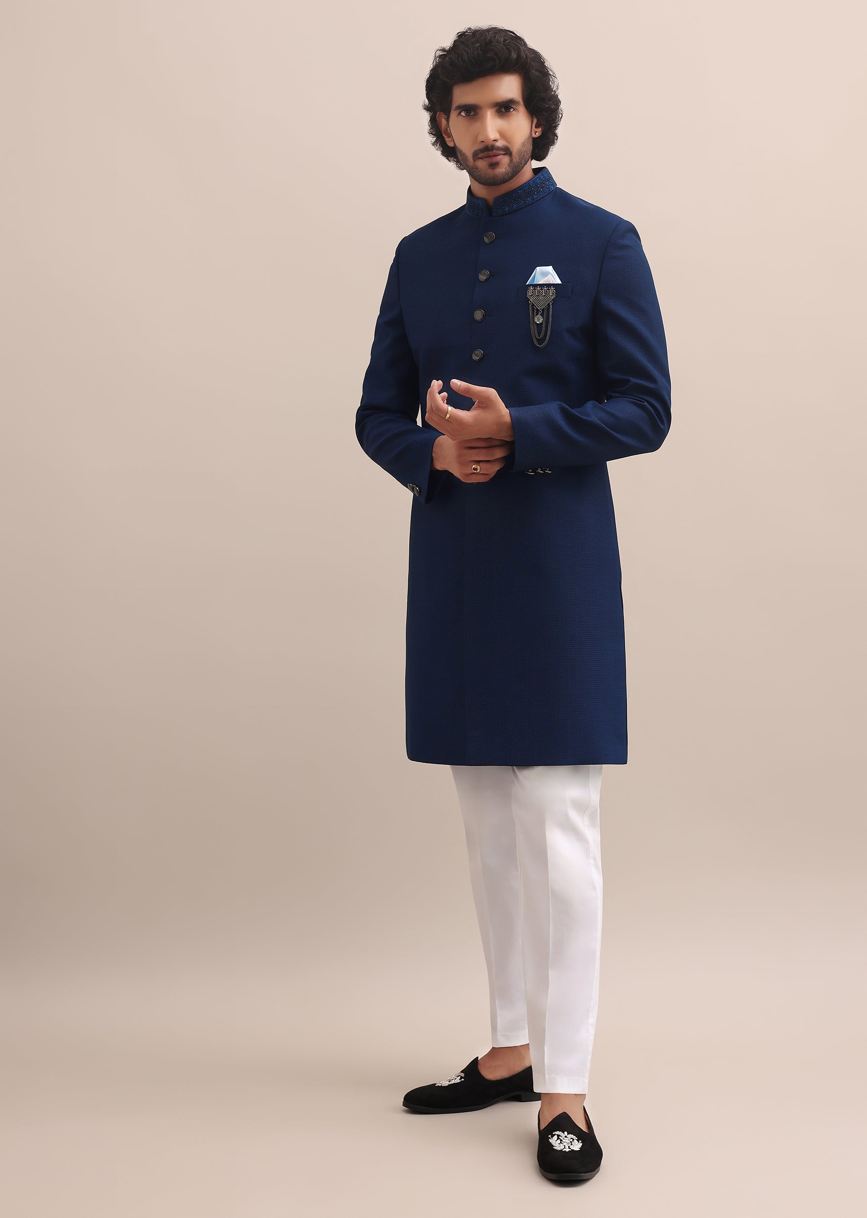 Presenting the blue embroidered sherwani.Fabricated in polyester, and adorned with self embroidered detailing on the neckline. Opt for this set at wedding occasions and sangeet functions.This sherwani is paired with a bottom.Button design, shape, and size may vary as per availability. Awarded as the Most Trusted Brand, we're delivering styles you love, just as promised.