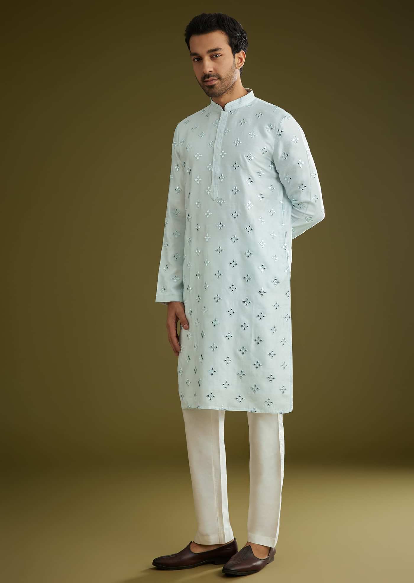 A festive blue kurta set in smooth silk blend, highlighted by delicate mirror accents on the placket. The tone is perfect for both evening lights and crisp day events. Awarded... More Product Details