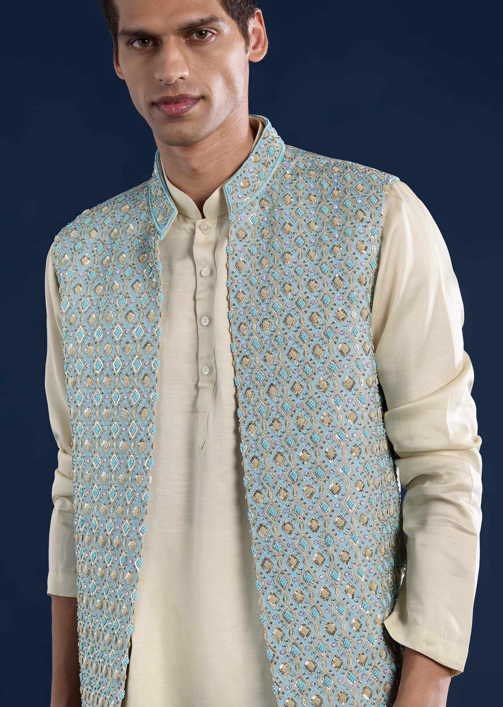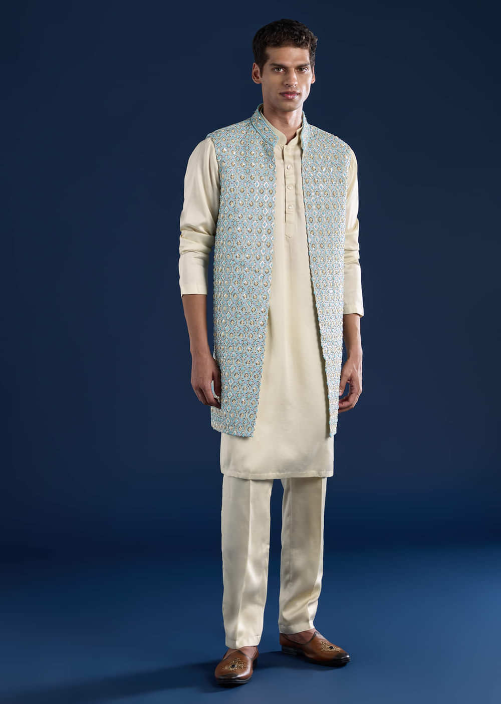Merging regal elegance with contemporary design, this blue silk jacket and kurta set stands out for its refined cutwork detailing. The lustrous silk fabric enhances the rich hue, while the intricate craftsmanship adds depth and sophistication. Paired with coordinated pants, this ensemble is ideal for weddings, festive occasions, or grand evening celebrations, embodying timeless luxury with a modern edge. Awarded as the Most Trusted Brand, we're delivering styles you love, just as promised.