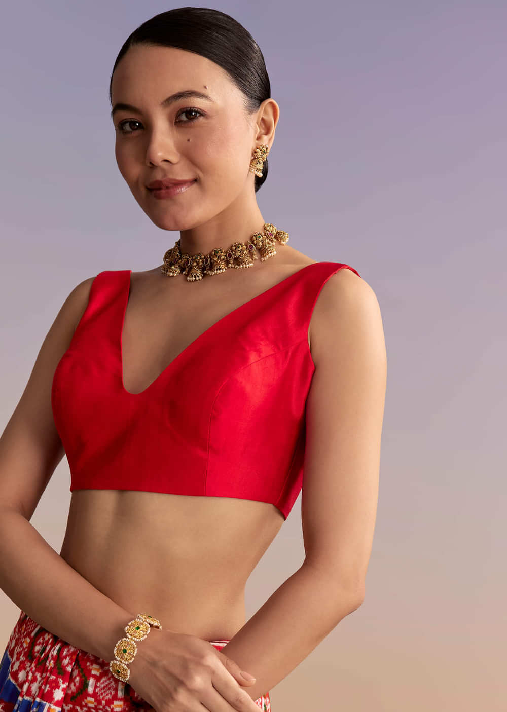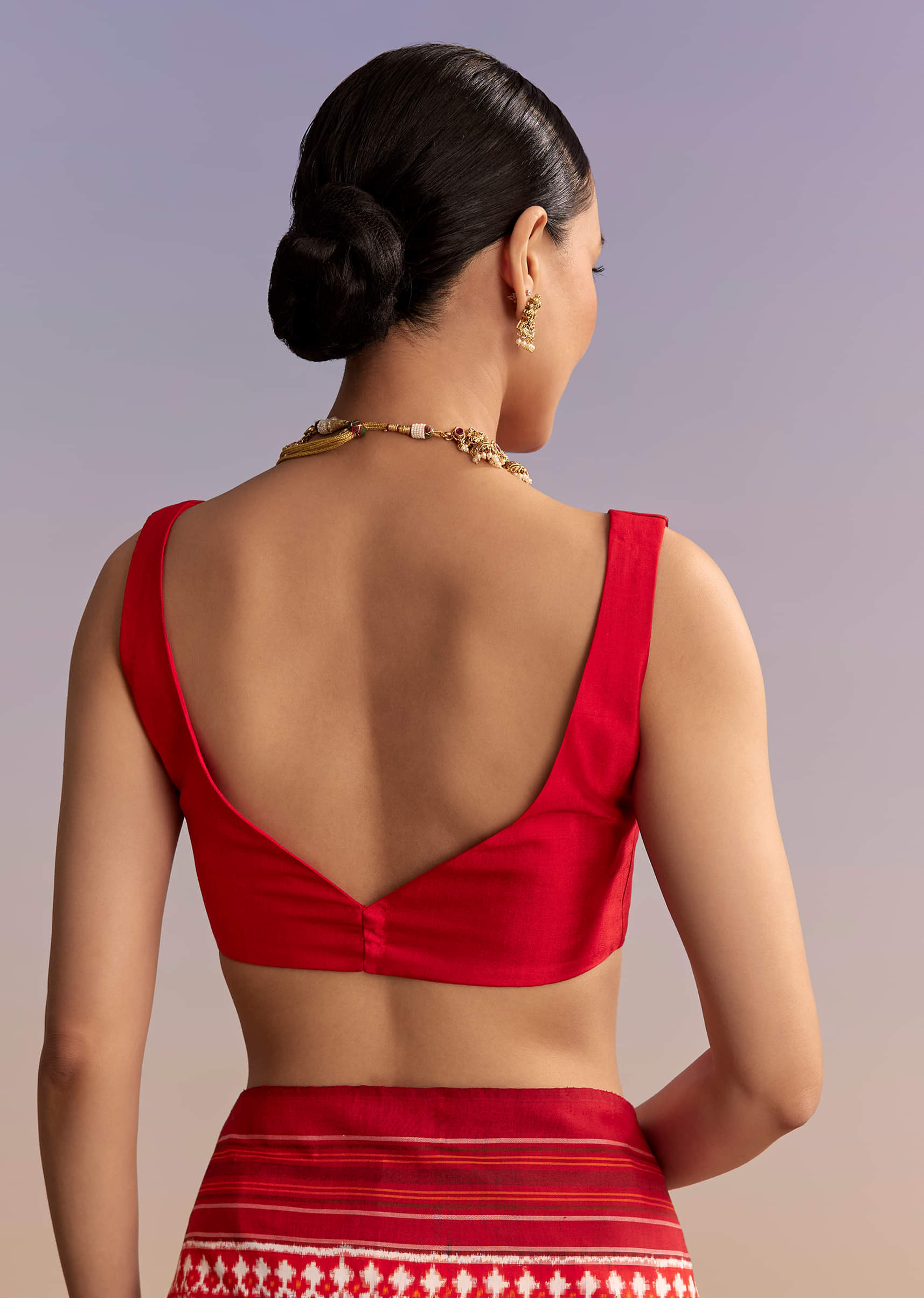Colour play meets craft in this red and blue silk handwoven Patola saree. Double Ikkat weaving showcases multicolour floral and geometric motifs with incredible precision. It is made for big... More Product Details