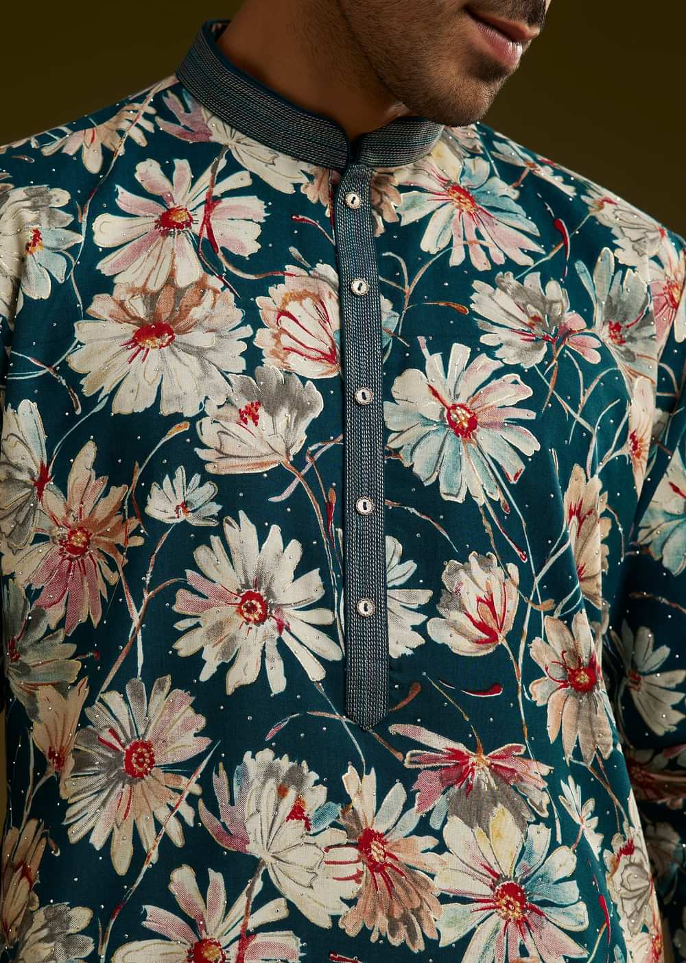 This teal green silk floral printed kurta set is decorated with subtle stone work offering a refined and luxurious appeal. The mandarin collar and full sleeves provide a modern yet... More Product Details