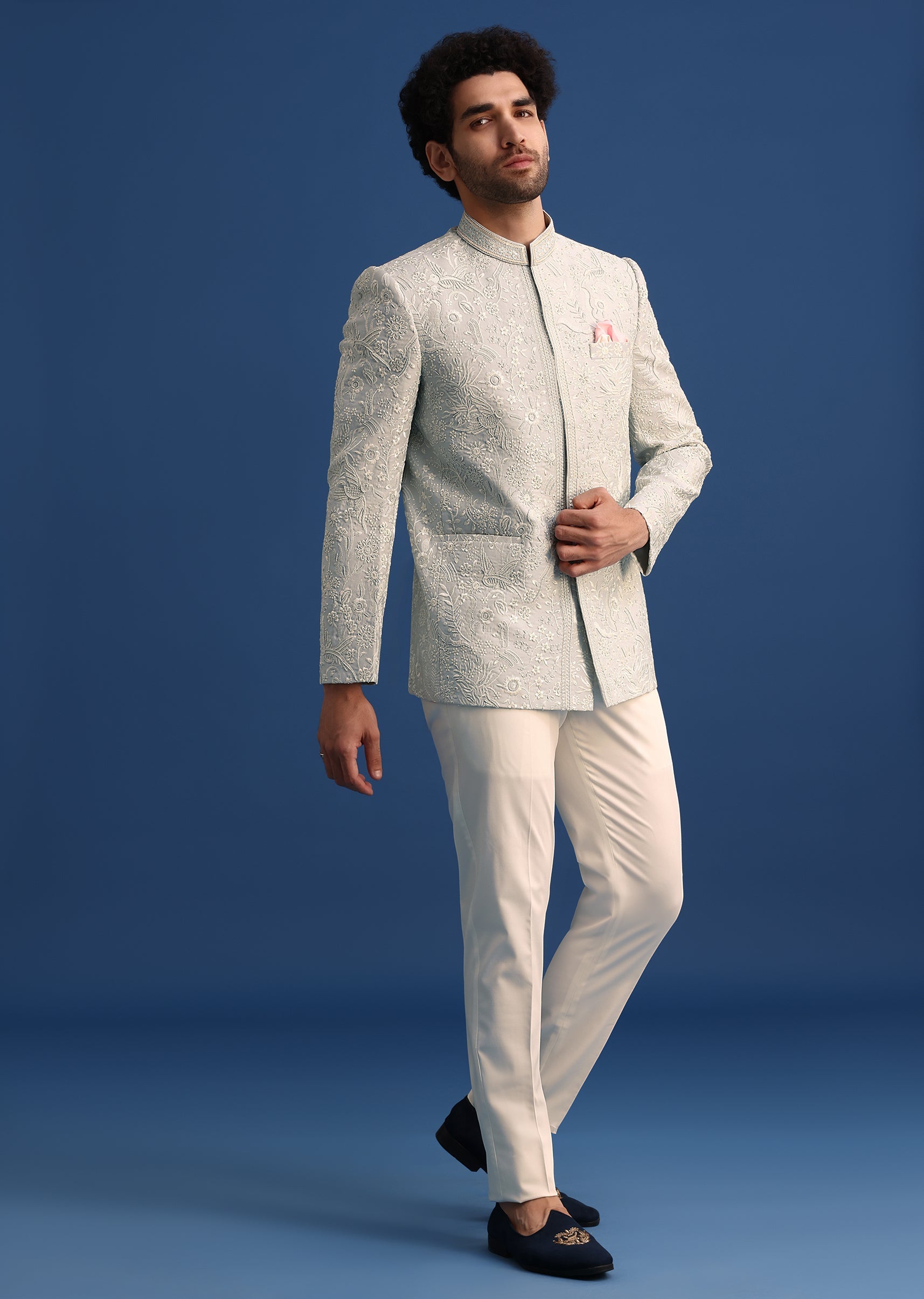 - Featuring a classic mandarin collar, front hook-eye placket and full sleeves design, the soothing sky blue hue and luxe silk base display expert craftsmanship.