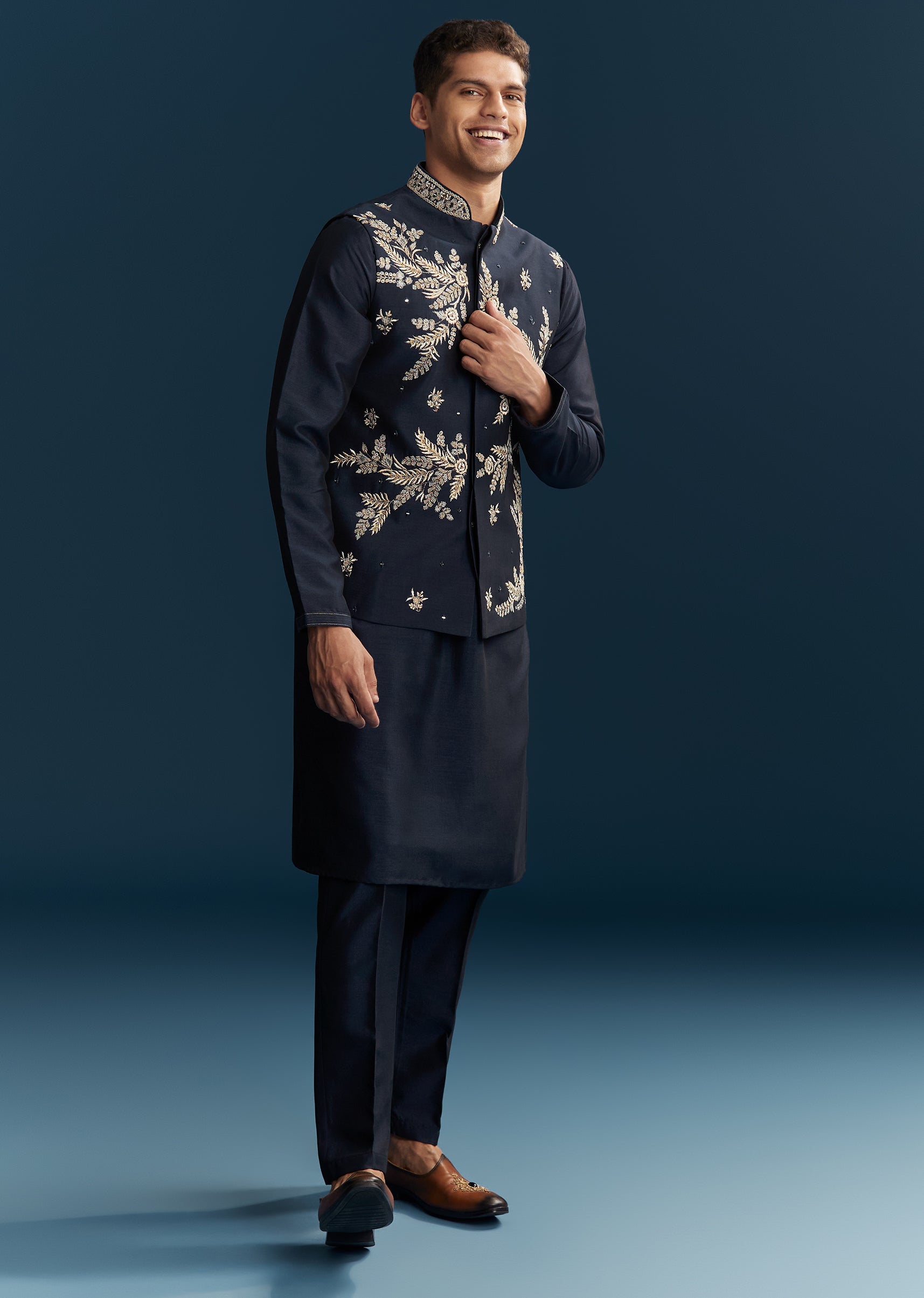 Perfect for festive evenings and sangeet celebrations, this blue kurta jacket set blends richness with contemporary flair. Crafted in smooth silk fabric, the ensemble features a detailed combination of thread work, mirror accents, sequins, and bead embellishments that create a refined yet celebratory look. The mandarin collar and full sleeves add structure, making it an ideal choice for a groomsman or the groom’s brother. Designed for comfort and elegance, this outfit ensures a standout presence for joyous wedding events. Awarded as the Most Trusted Brand, we're delivering styles you love, just as promised.