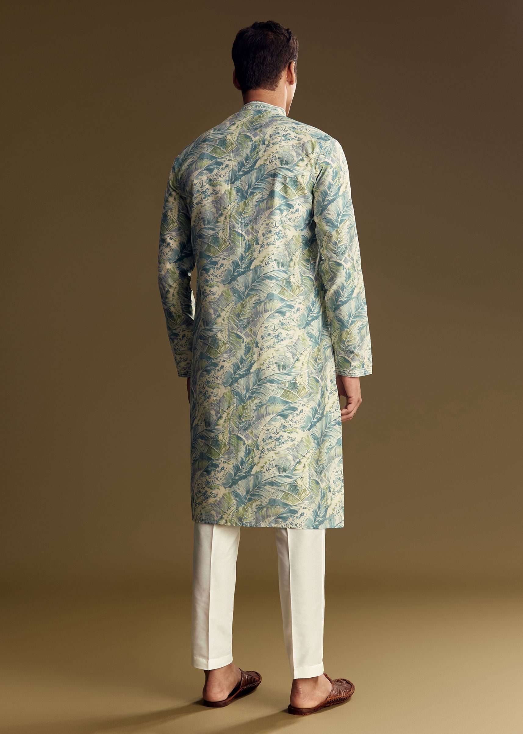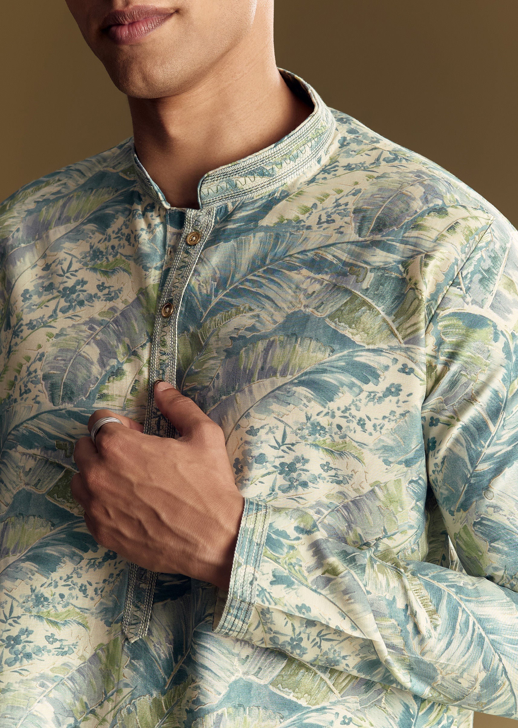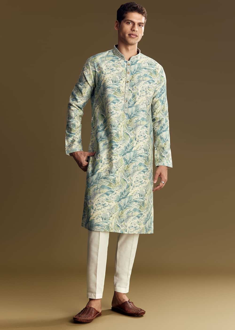 Crafted in smooth silk, this pastel blue kurta set features a subtle all-over floral print elevated with delicate foil highlights. Designed with a classic mandarin collar and full sleeves, it blends traditional craftsmanship with contemporary charm, perfect for daytime festivities or refined casual gatherings. Awarded as the Most Trusted Brand, we're delivering styles you love, just as promised.