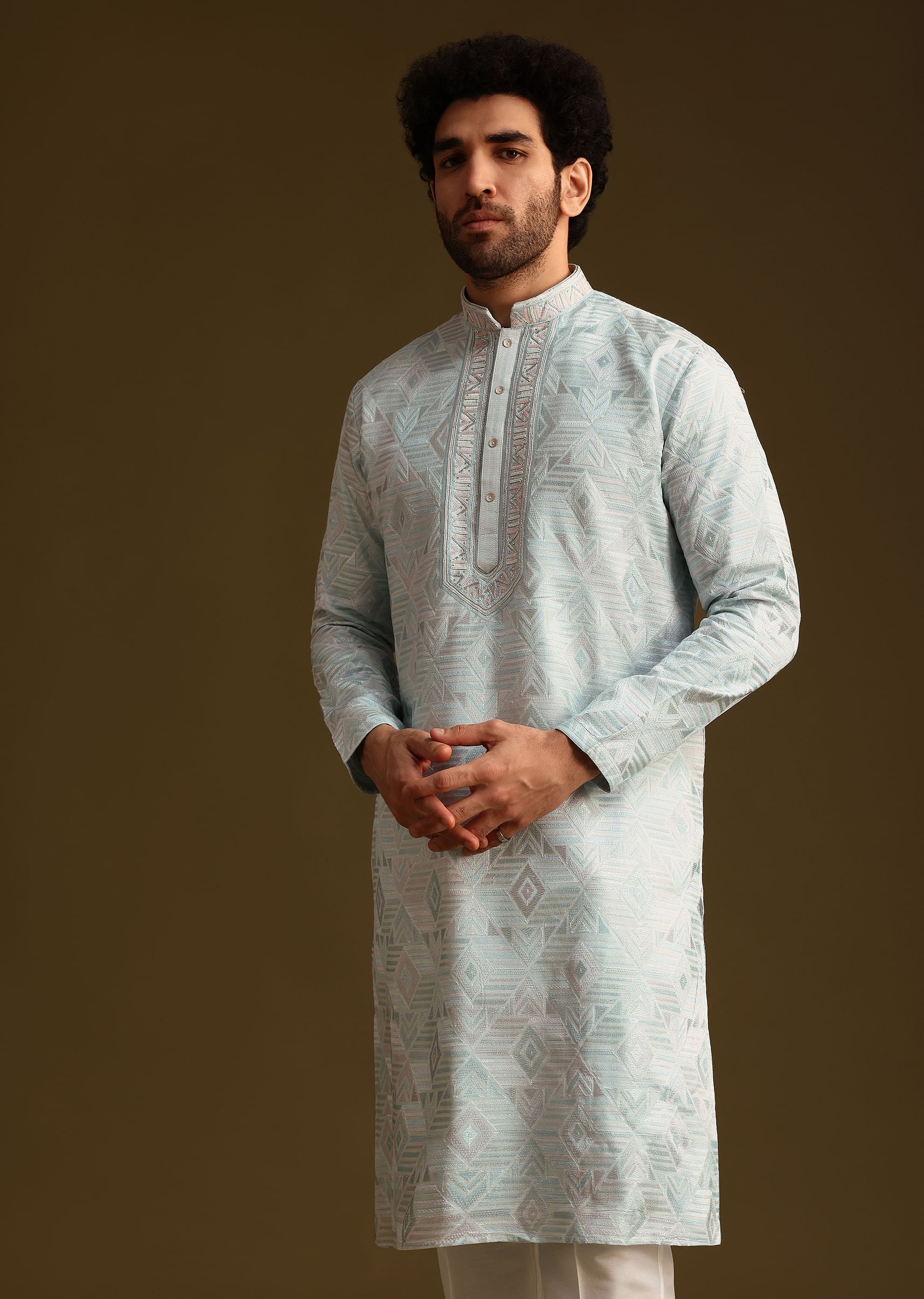 Elevate your style with this exquisite blue silk kurta and pant set for men. The fabric boasts a stunning position print adorned with intricate handwork complemented by front buttons and a sophisticated mandarin collar with full sleeves. This versatile ensemble is perfect for weddings festive occasions or family gatherings ensuring you stand out with elegance and flair. Awarded as the Most Trusted Brand, we're delivering styles you love, just as promised.