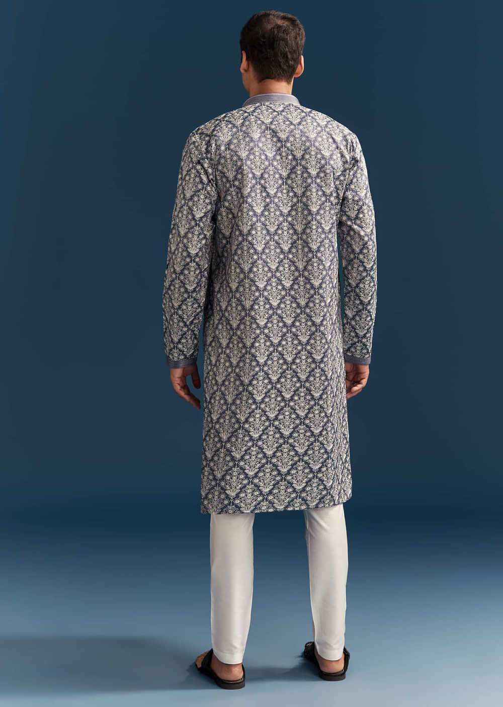 Blue Silk Printed Kurta Set For Men With Thread Embroidery