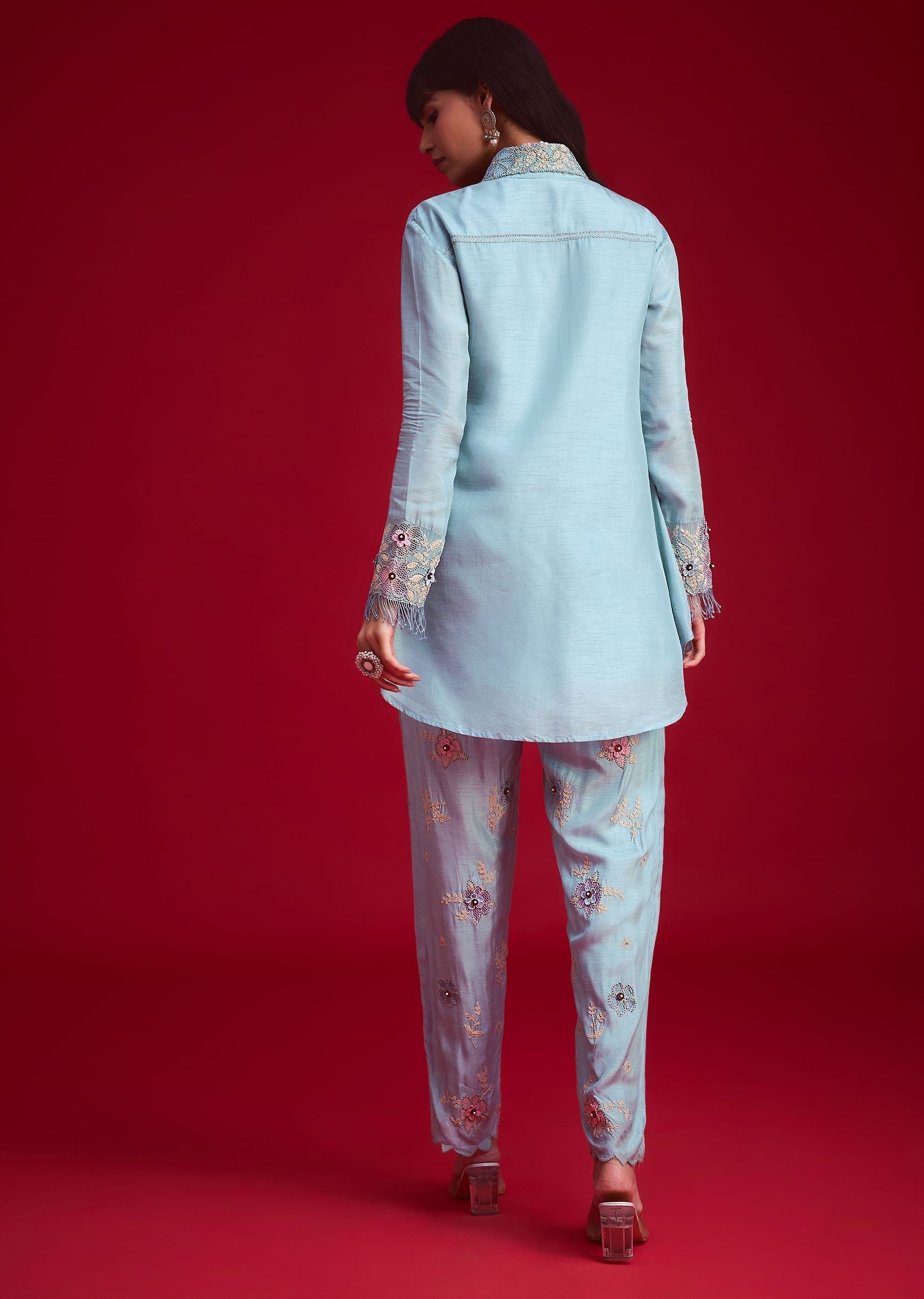- This sky-blue silk co-ord set blends casual charm with festive flair