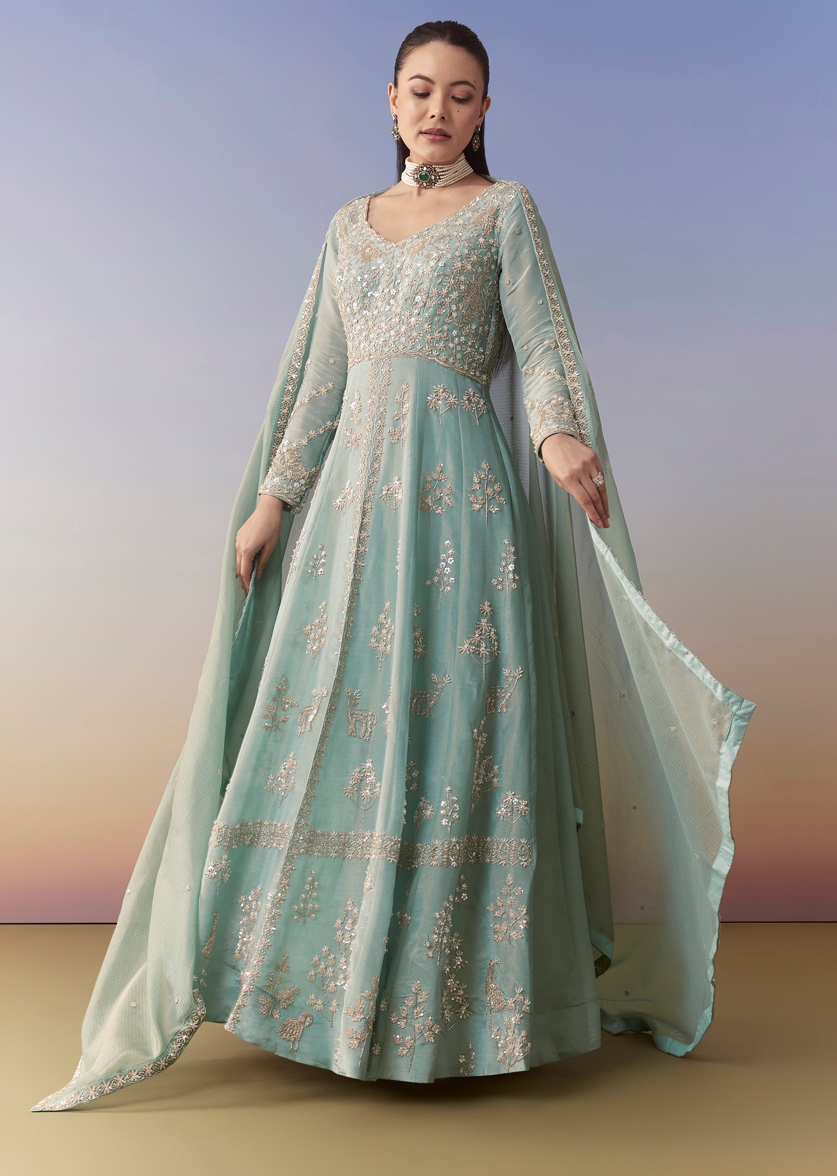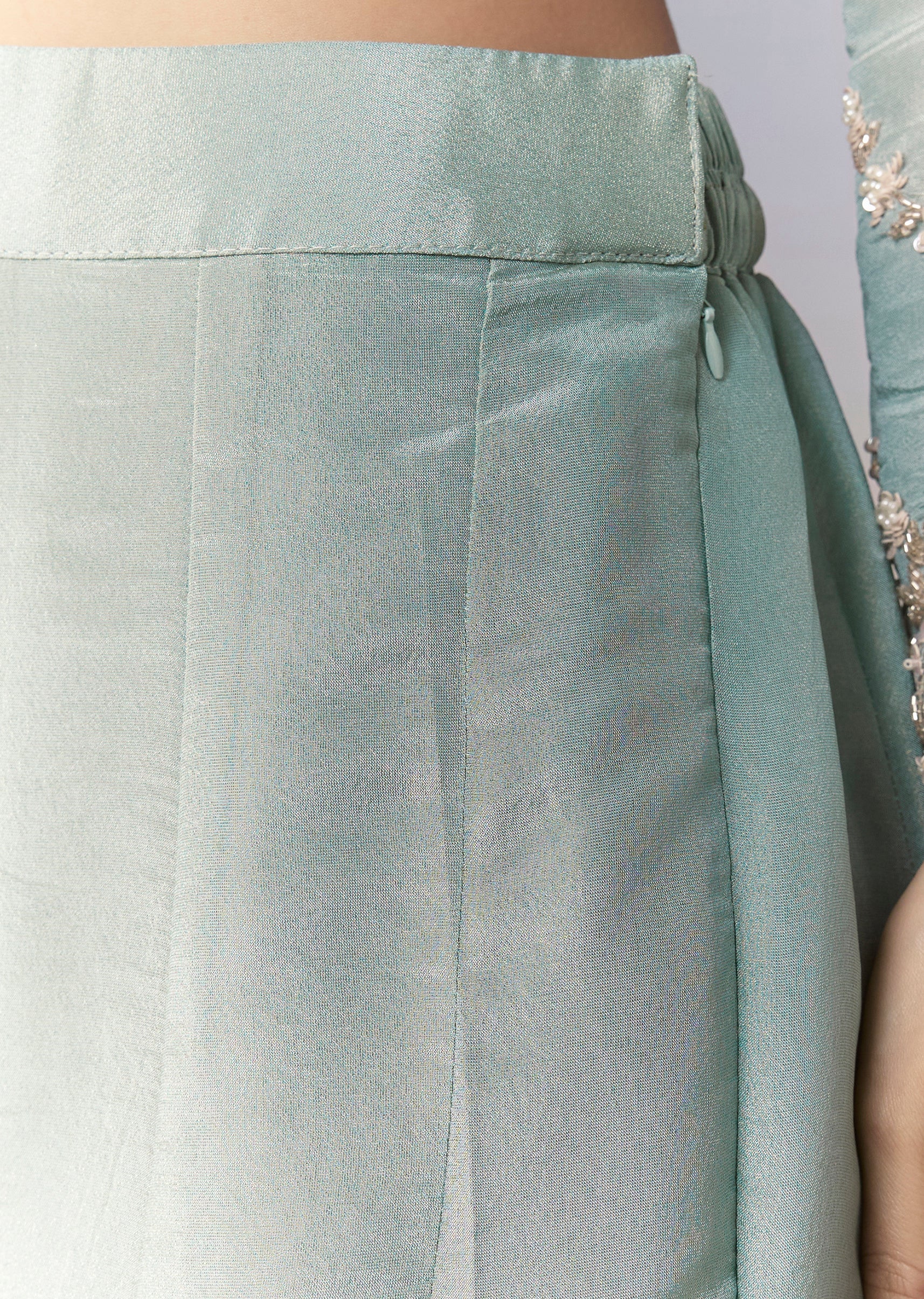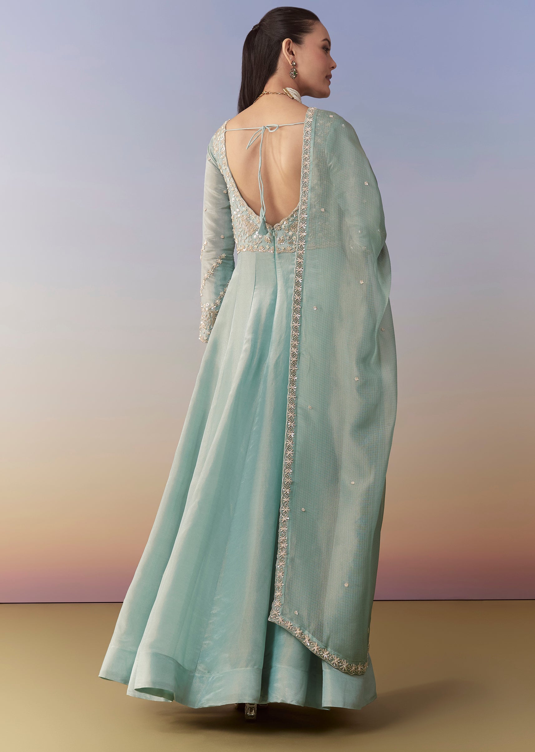 Step into graceful elegance with this blue front-slit anarkali set, adorned with cutdana and sequin work that adds a soft, luminous sparkle. Paired with a flowing palazzo and a matching... More Product Details
