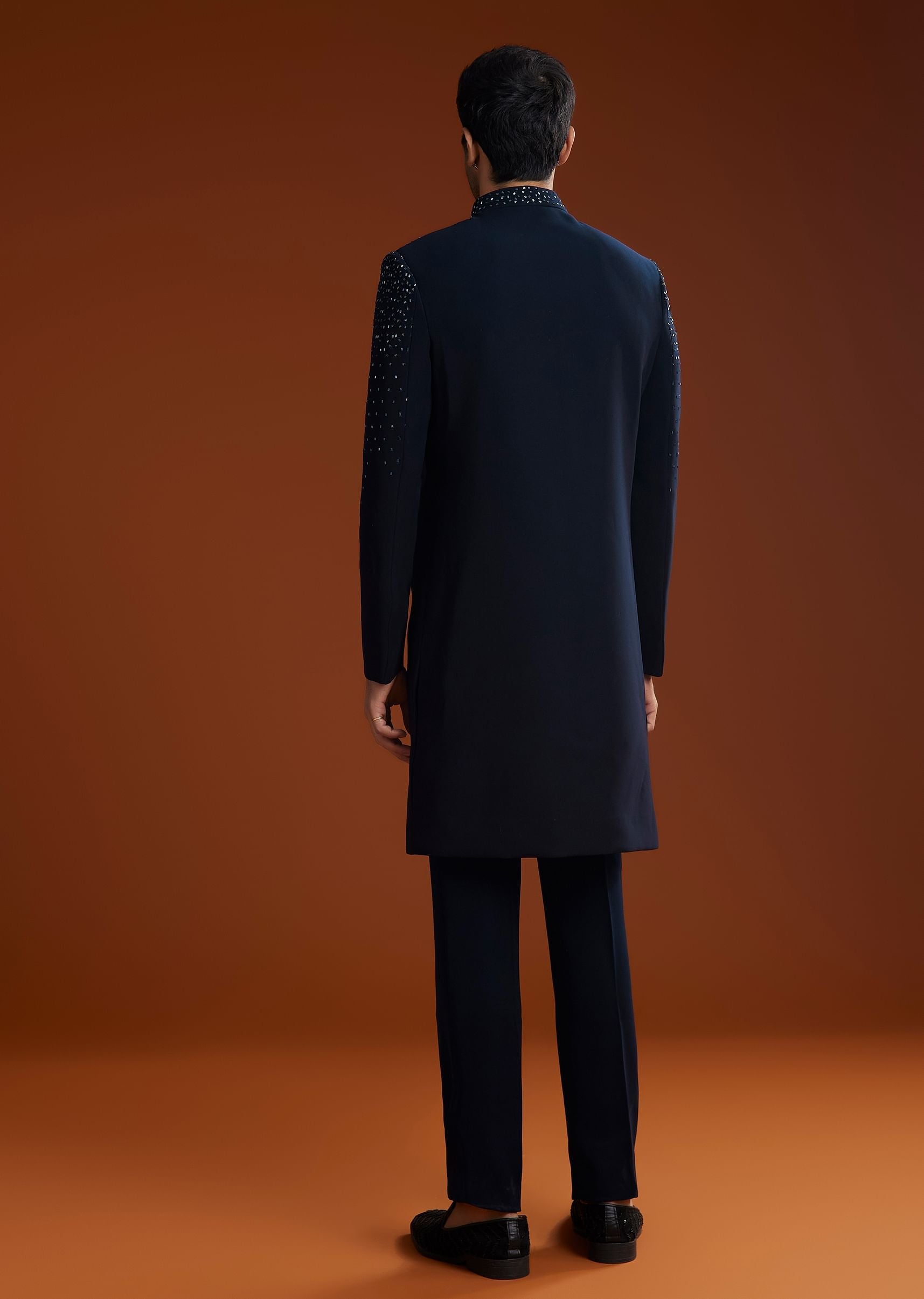 Blue Suiting Indo Jacket Set With Shimmering Embellishments