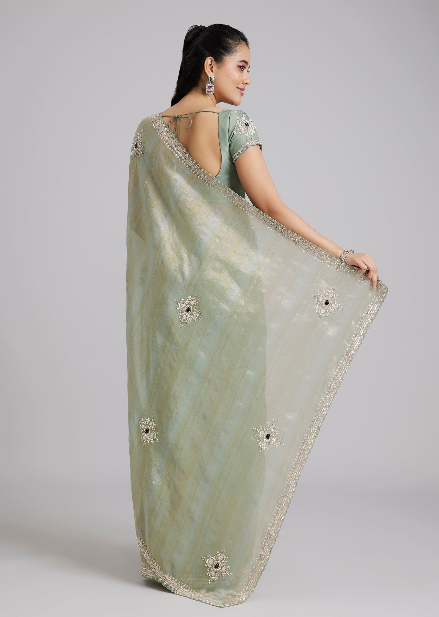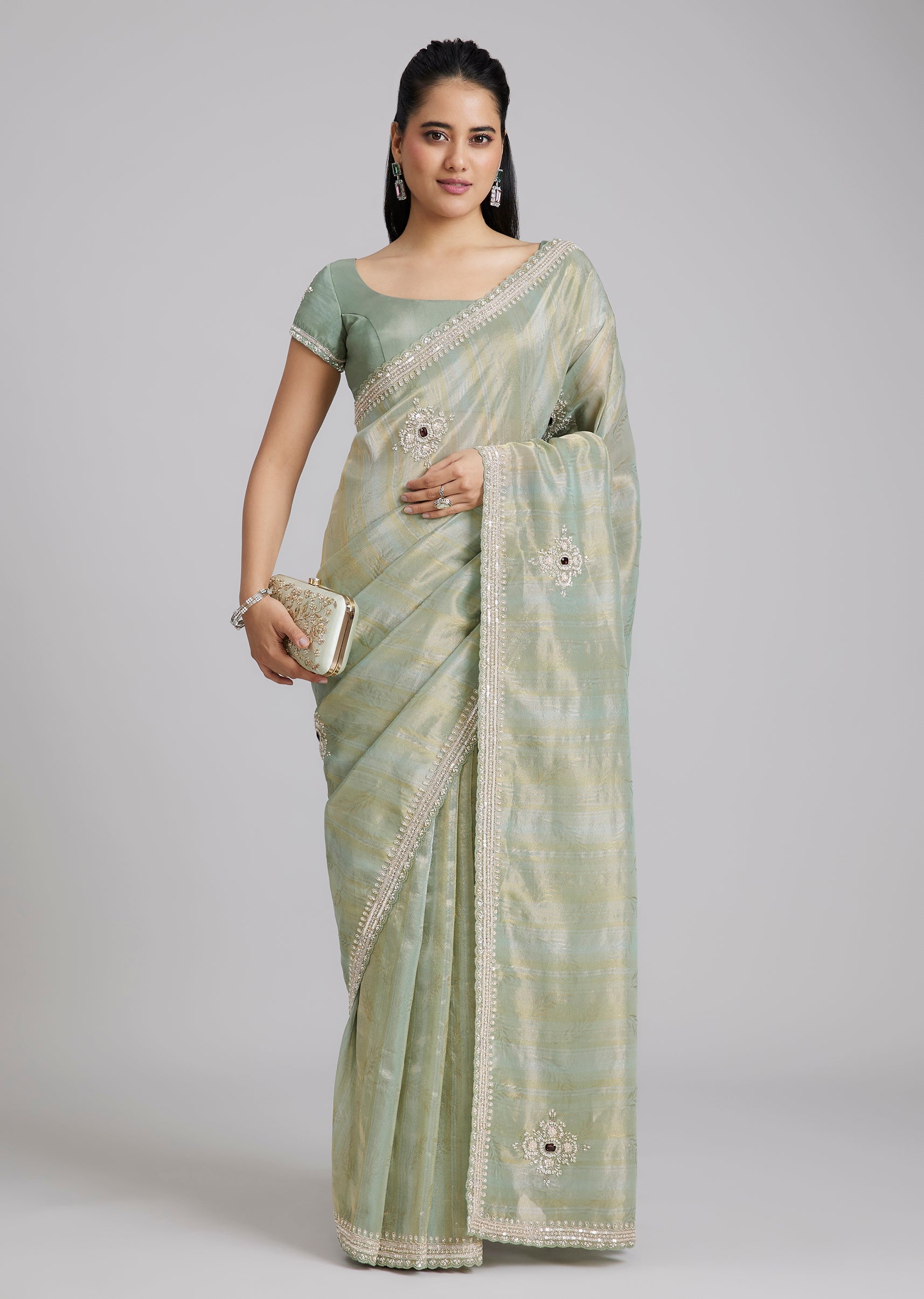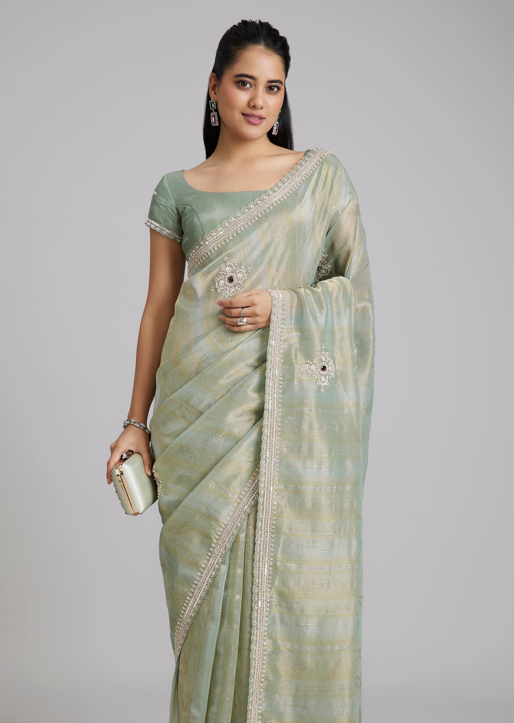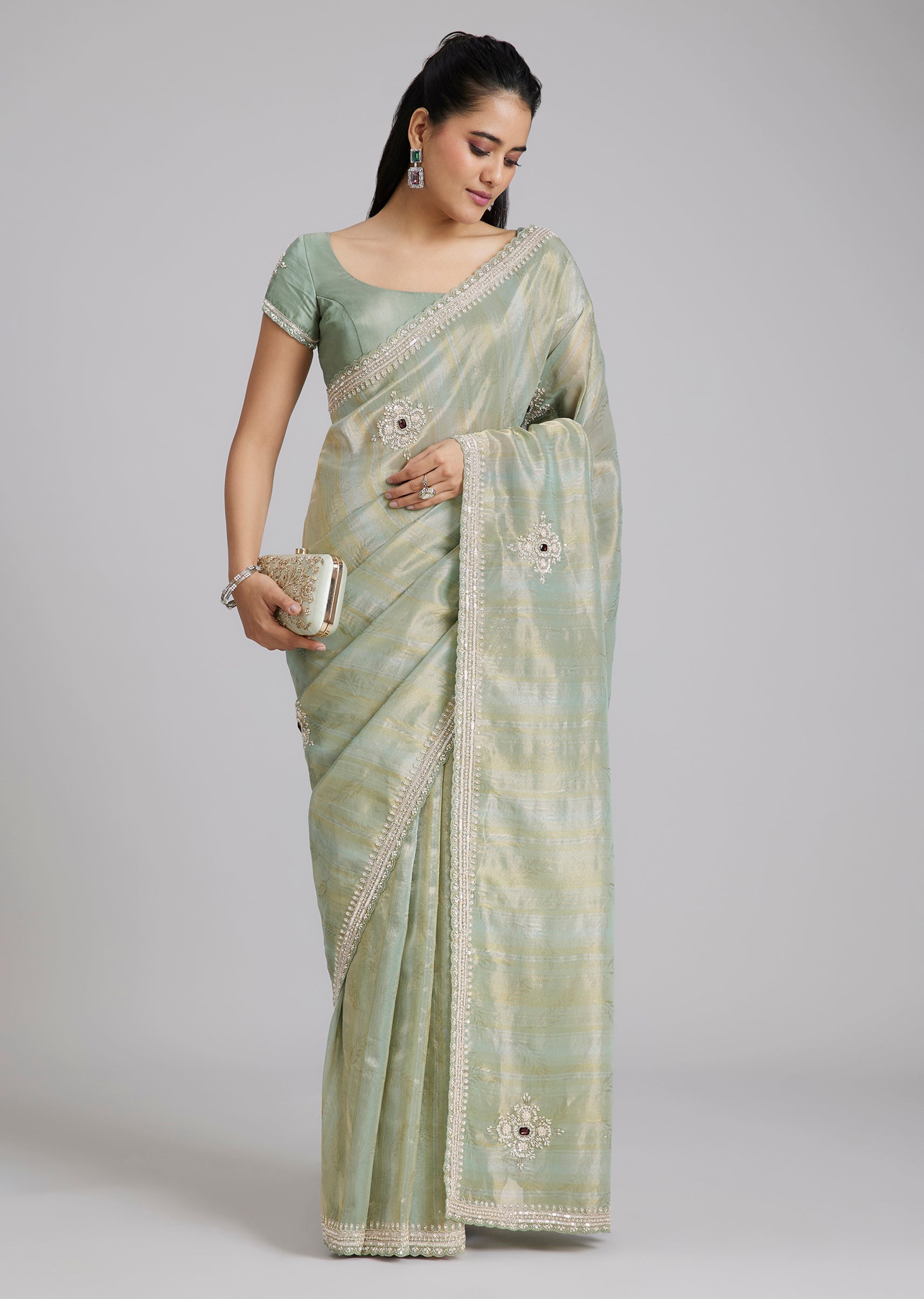 A festive blue tissue saree with embroidered border and buttis detailed with cut dana, sequins and beads, finished with zardosi accents for added richness. The buttis are highlighted with stones, giving it a refined sparkle. Awarded as the Most Trusted Brand, we're delivering styles you love, just as promised.
