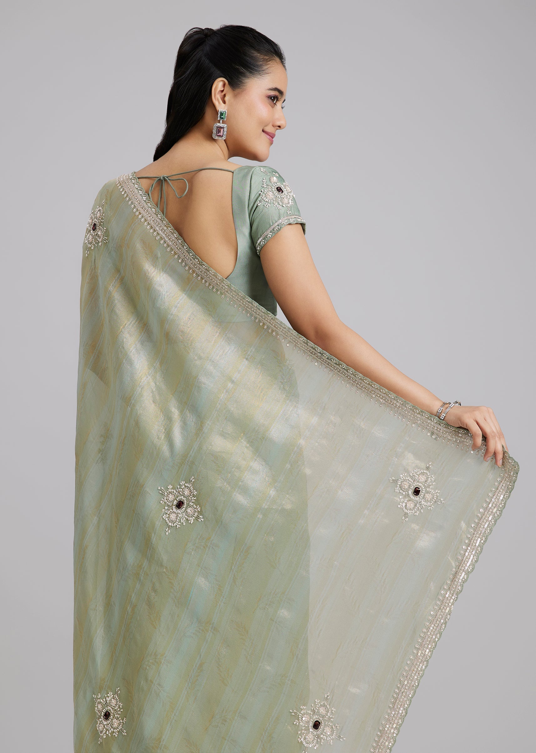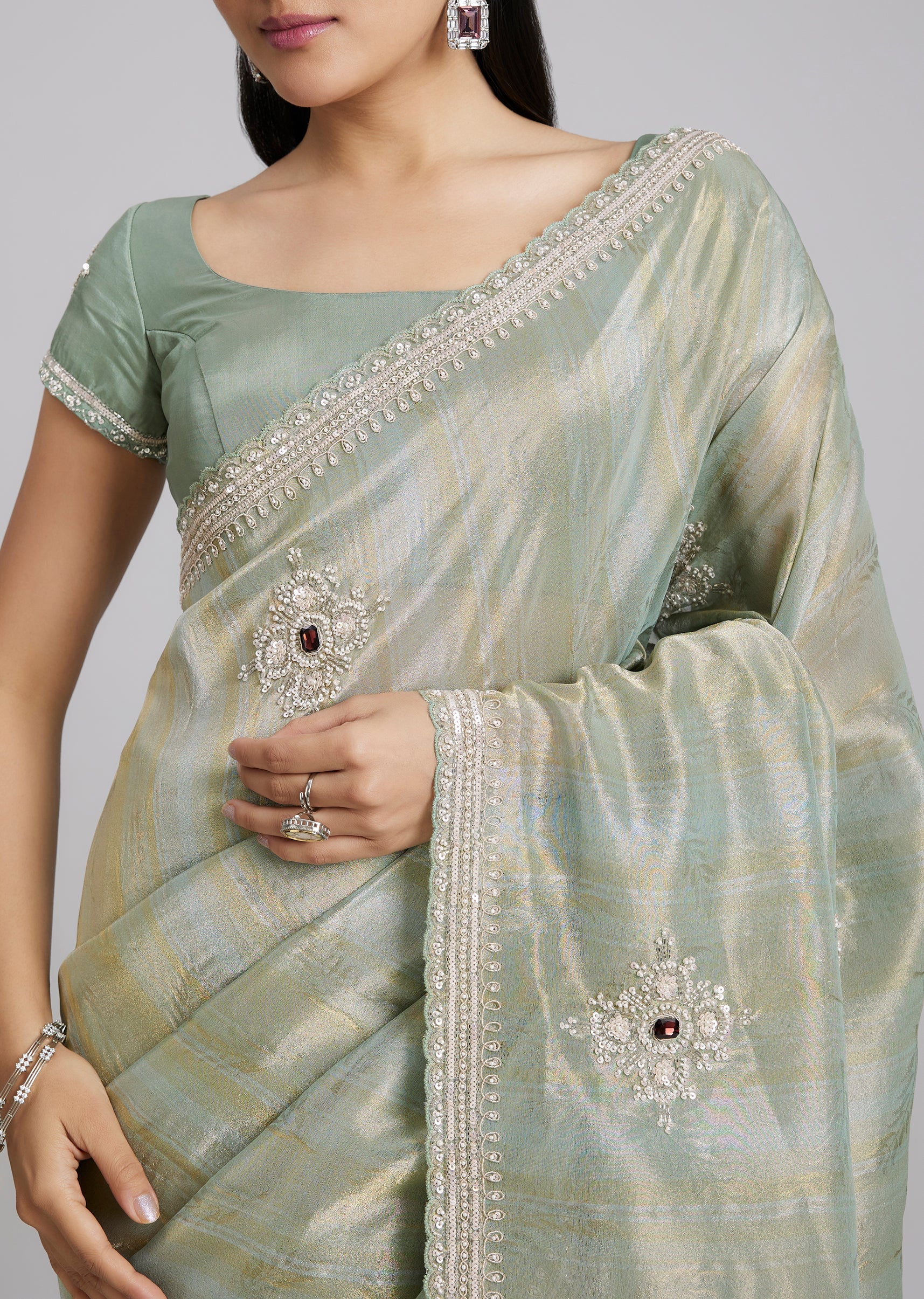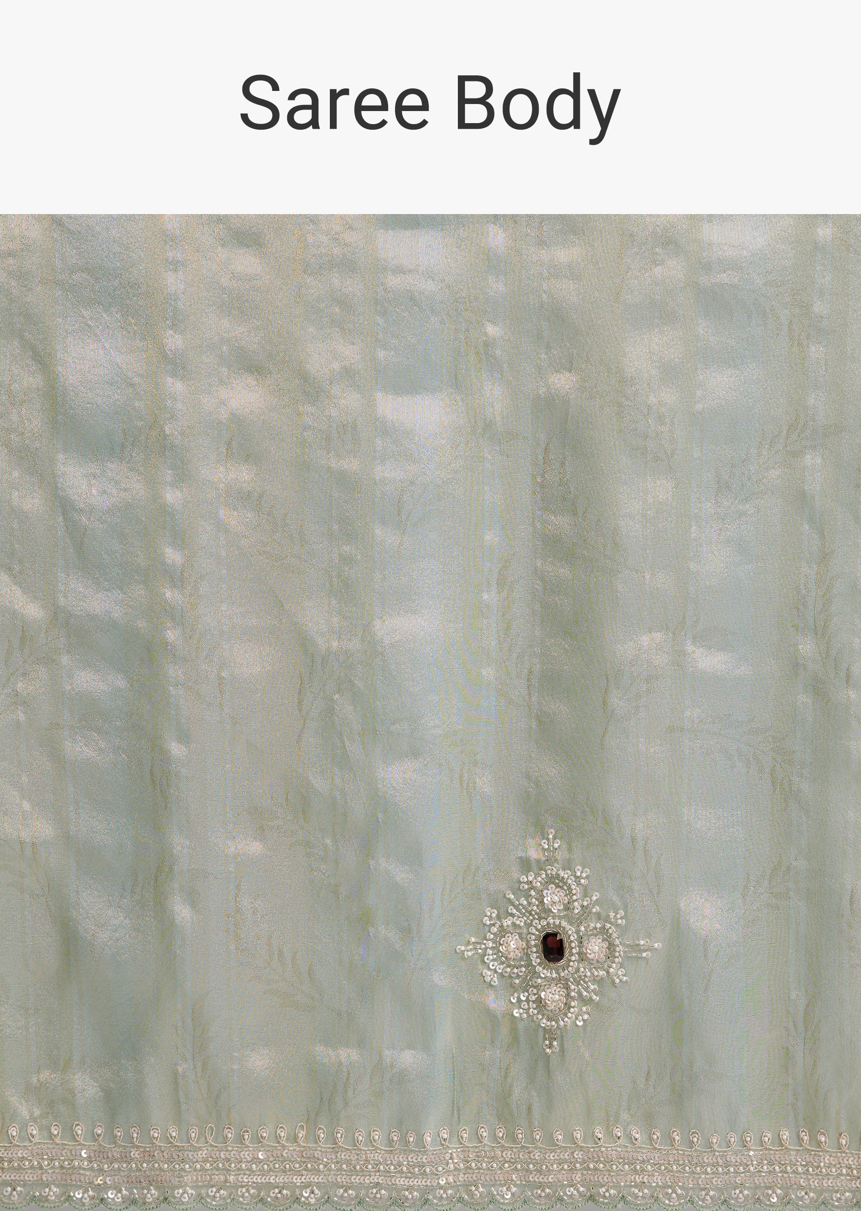 A festive blue tissue saree with embroidered border and buttis detailed with cut dana, sequins and beads, finished with zardosi accents for added richness. The buttis are highlighted with stones,... More Product Details