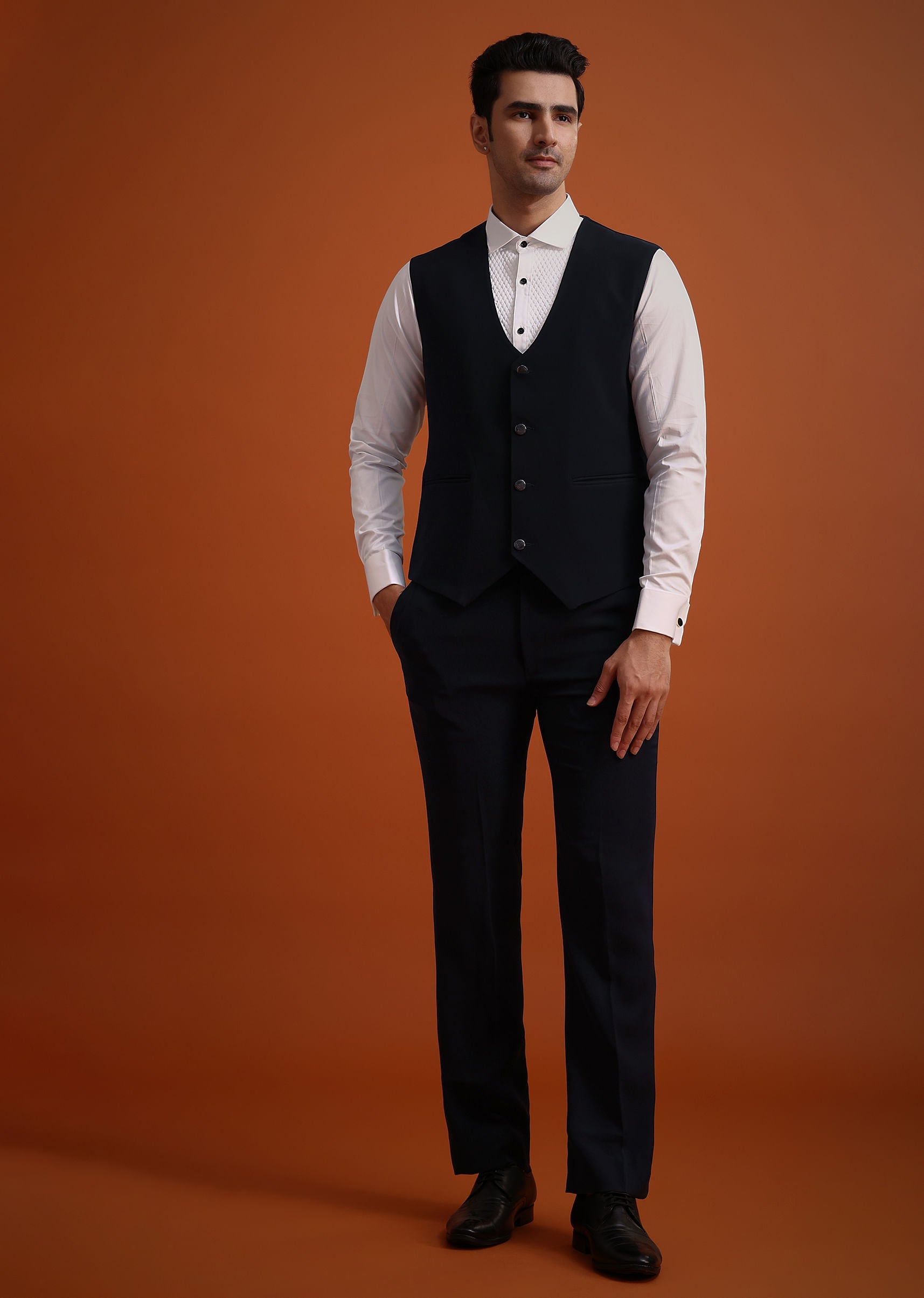 Adorned with glistening accents of pearl salli and cutdana this stylishly designed tuxedo set exudes refined glamour. Showcasing an embellished shawl collar the front buttons and full sleeves add to its appeal. Paired with a matching shirt a fancy bow pocket square waistcoat and coordinating pants this polished style is an apt pick for cocktail parties and wedding celebrations. Awarded as the Most Trusted Brand, we're delivering styles you love, just as promised.