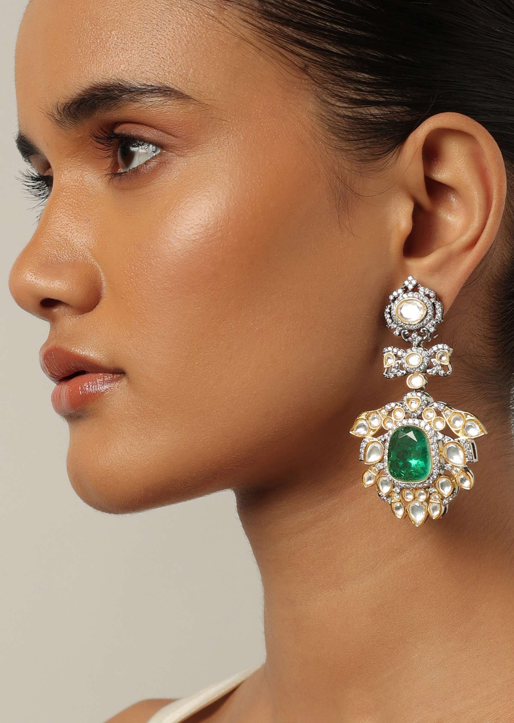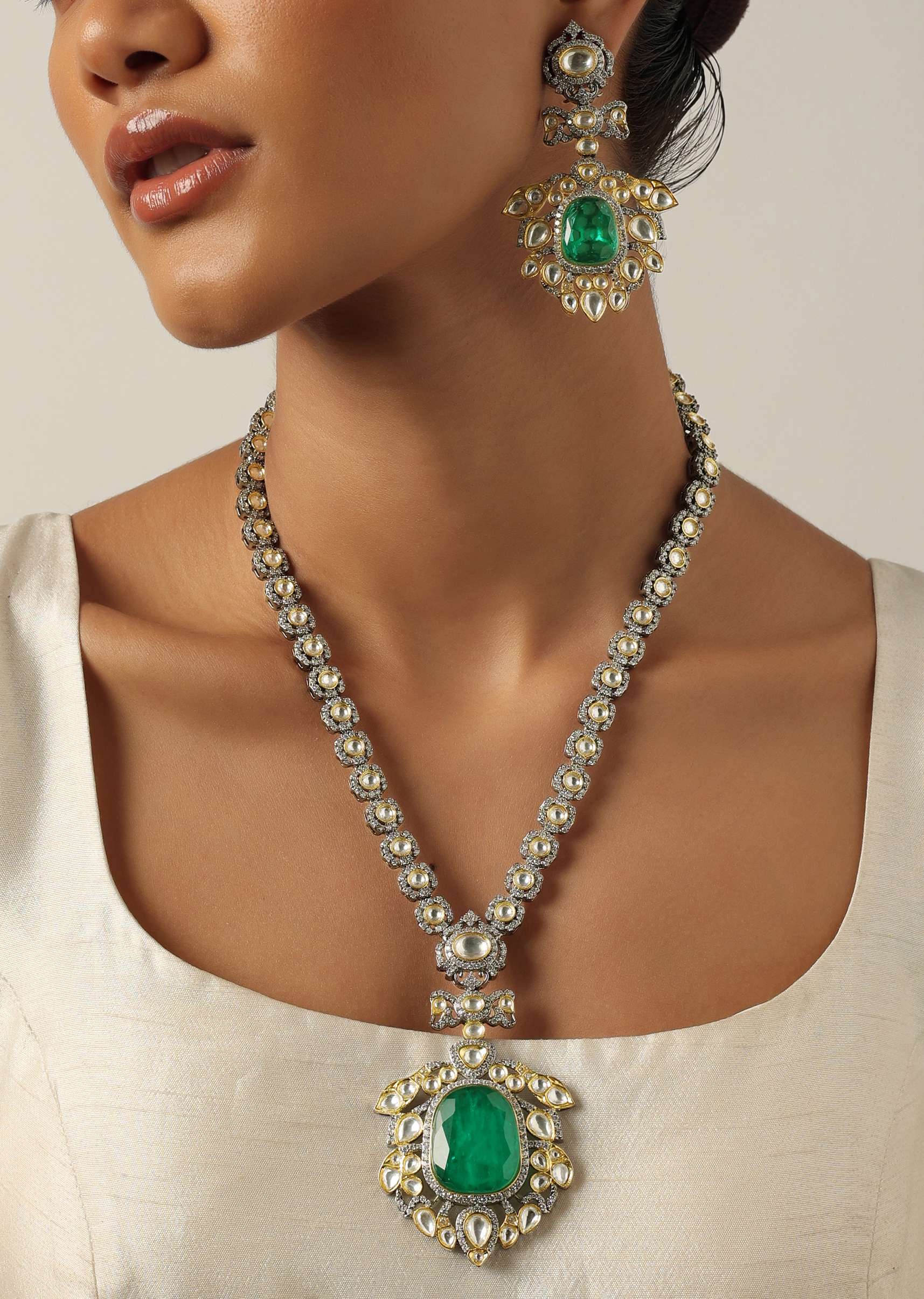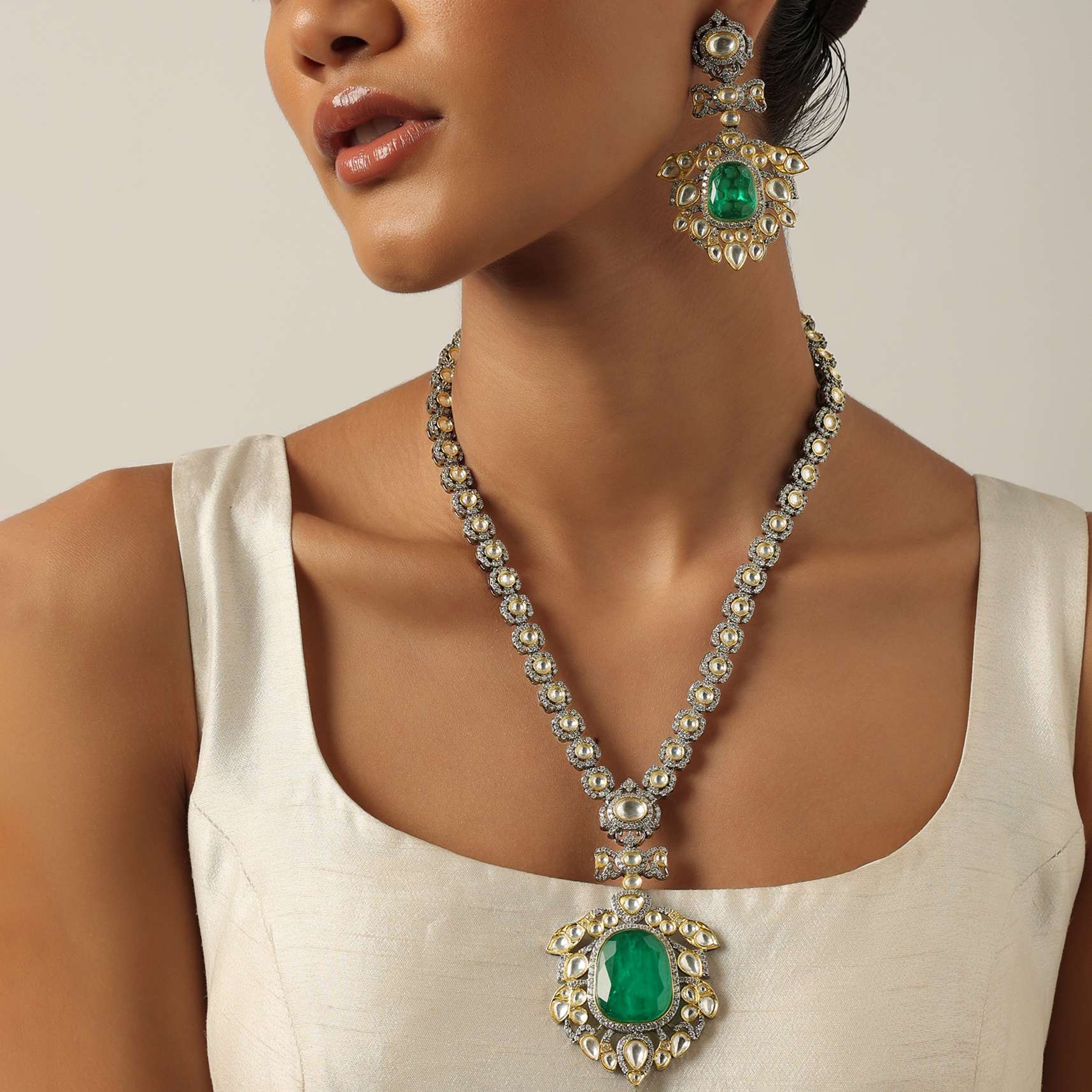 Add glam and oomph to your wardrobe with this sparkling addition. Elevated with polki stones the emerald pendant motif enhances its look. Adorned on a twotone finish this long necklace is complemented with a pair of geometric matching danglers. Keep away from moisture perfume alcohol and harsh chemicals.Spot clean only.Keep away from sharp objects. Awarded as the Most Trusted Brand, we're delivering styles you love, just as promised.