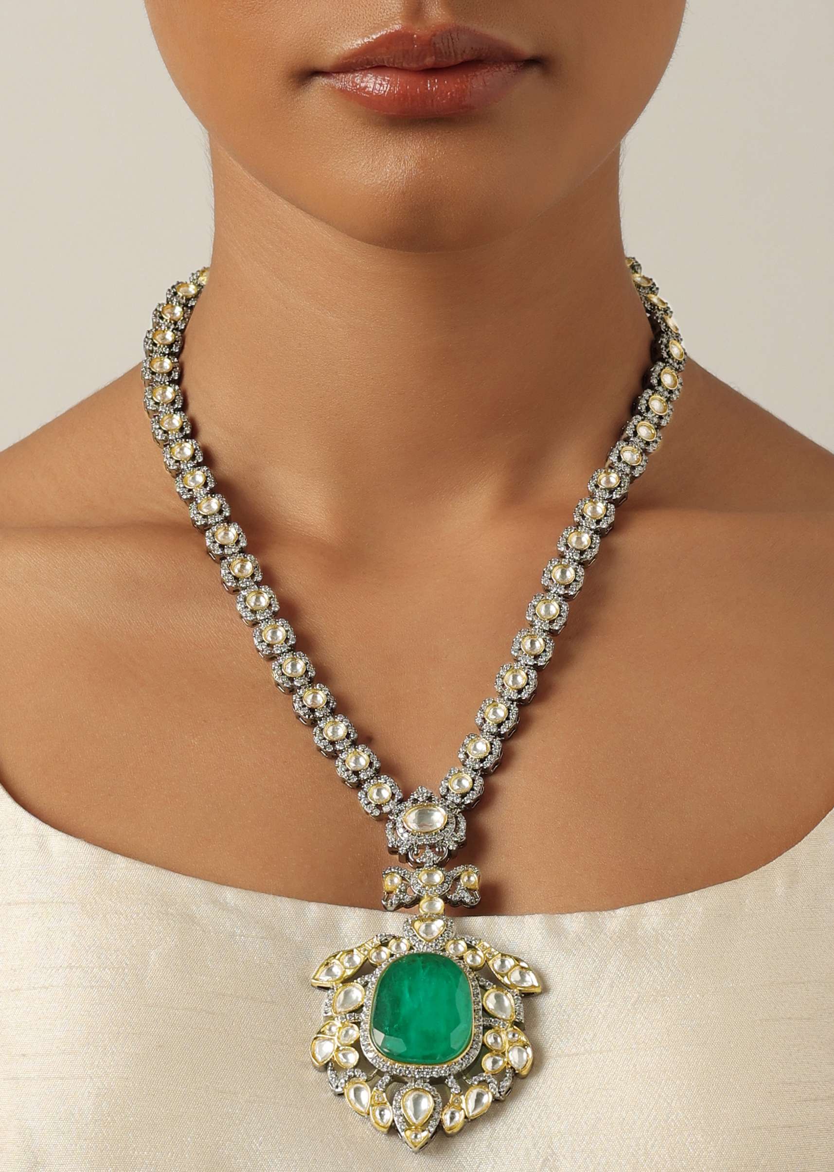 Add glam and oomph to your wardrobe with this sparkling addition. Elevated with polki stones the emerald pendant motif enhances its look. Adorned on a twotone finish this long necklace... More Product Details