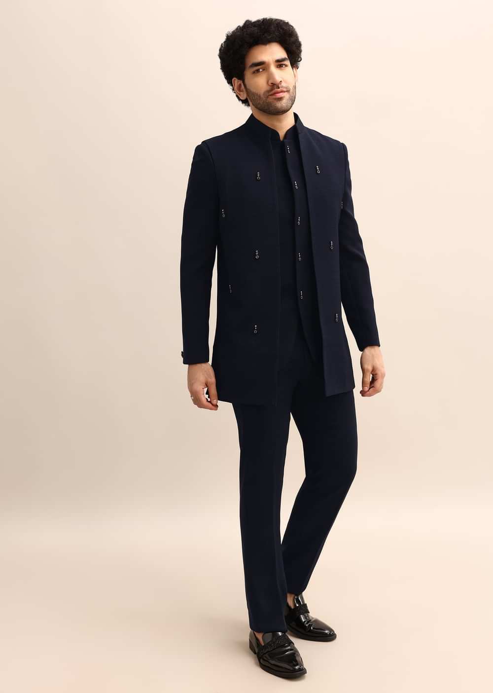 Command attention in regal elegance. This luxurious blue jacquard Jodhpuri suit drapes like a dream, boasting a sophisticated sheen, making you look like a dreamy prince. The 3 piece Jodhpuri suit is accompanied by a trouser, and a bandi completing a timeless ensemble perfect for wedding grandeur or reception revelry.Button design, shape, and size may vary as per availability. Awarded as the Most Trusted Brand, we're delivering styles you love, just as promised.