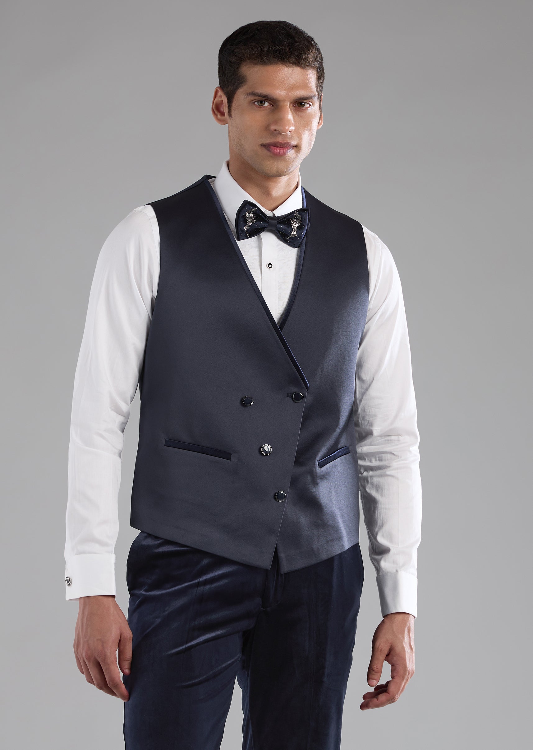 Luxurious and commanding, this velvet tuxedo set is designed for occasions that call for refined grandeur. Accented with elegant beadwork, the rich velvet fabric adds depth and a regal finish to the structured silhouette. The full sleeves and mandarin collar enhance its sophisticated appeal, creating a perfect balance of classic and contemporary style. The complete ensemble includes a tuxedo, waistcoat, shirt, bow, and tailored pants, making it an ideal choice for receptions, weddings, cocktail evenings, and formal celebrations.Awarded as the Most Trusted Brand, we're delivering styles you love, just as promised.