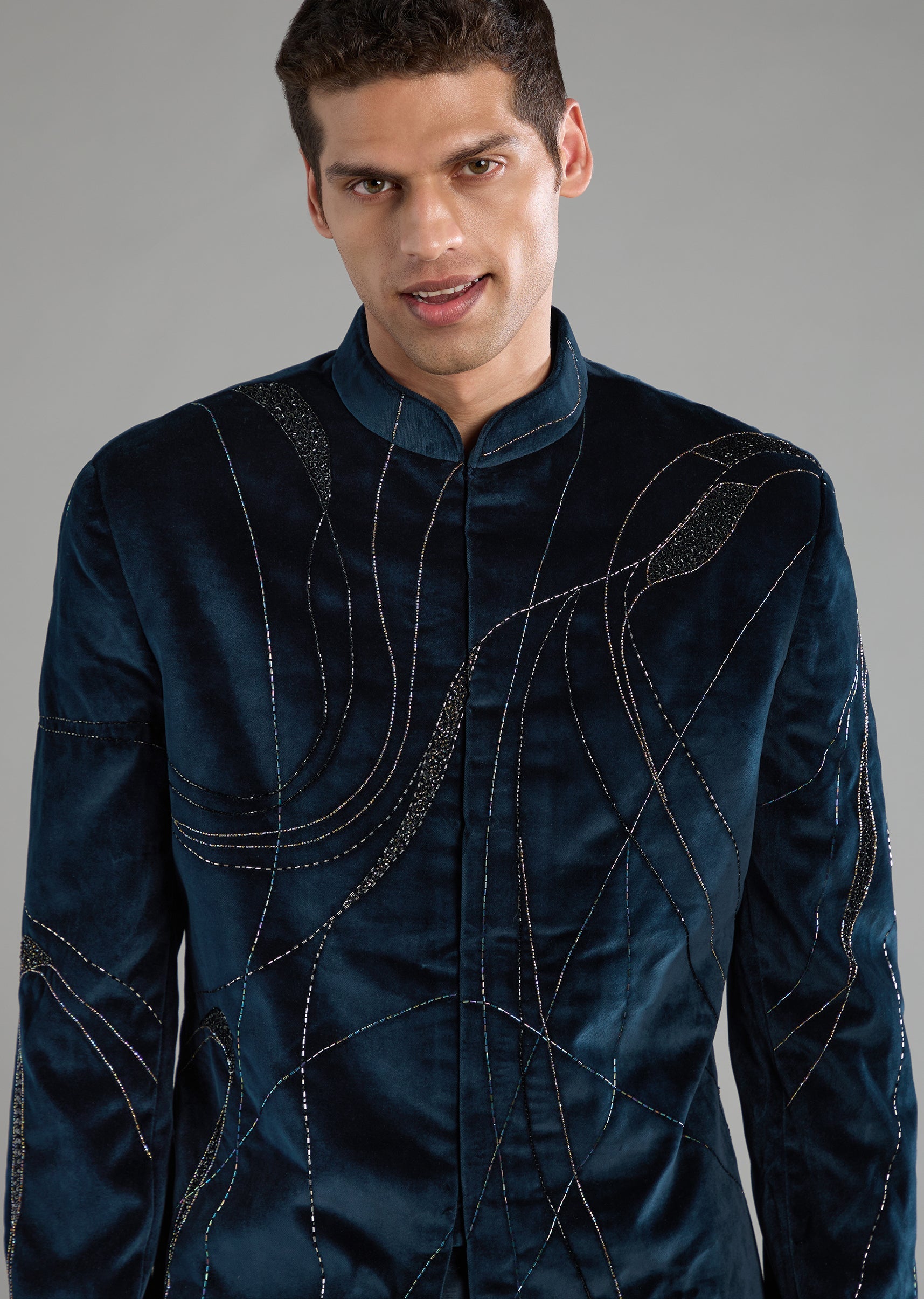 Make a statement in this velvet indowestern set that catches the eye with its luxe sheen and dazzling sequin and cut dana detailing. The full sleeve mandarin collar design brings... More Product Details