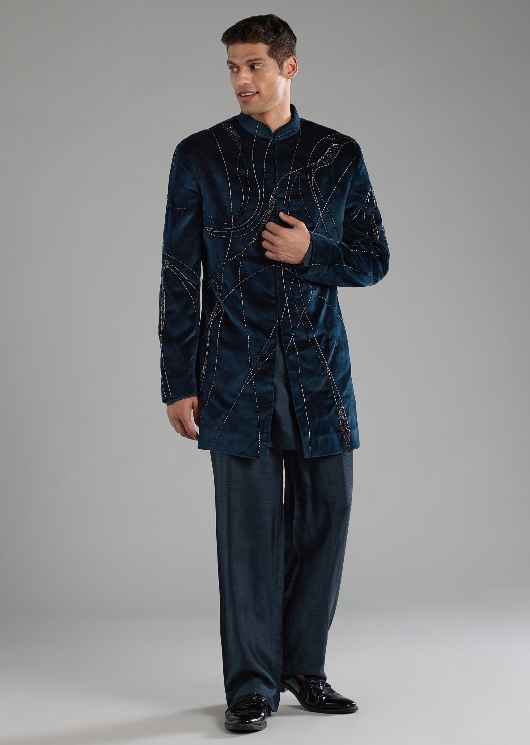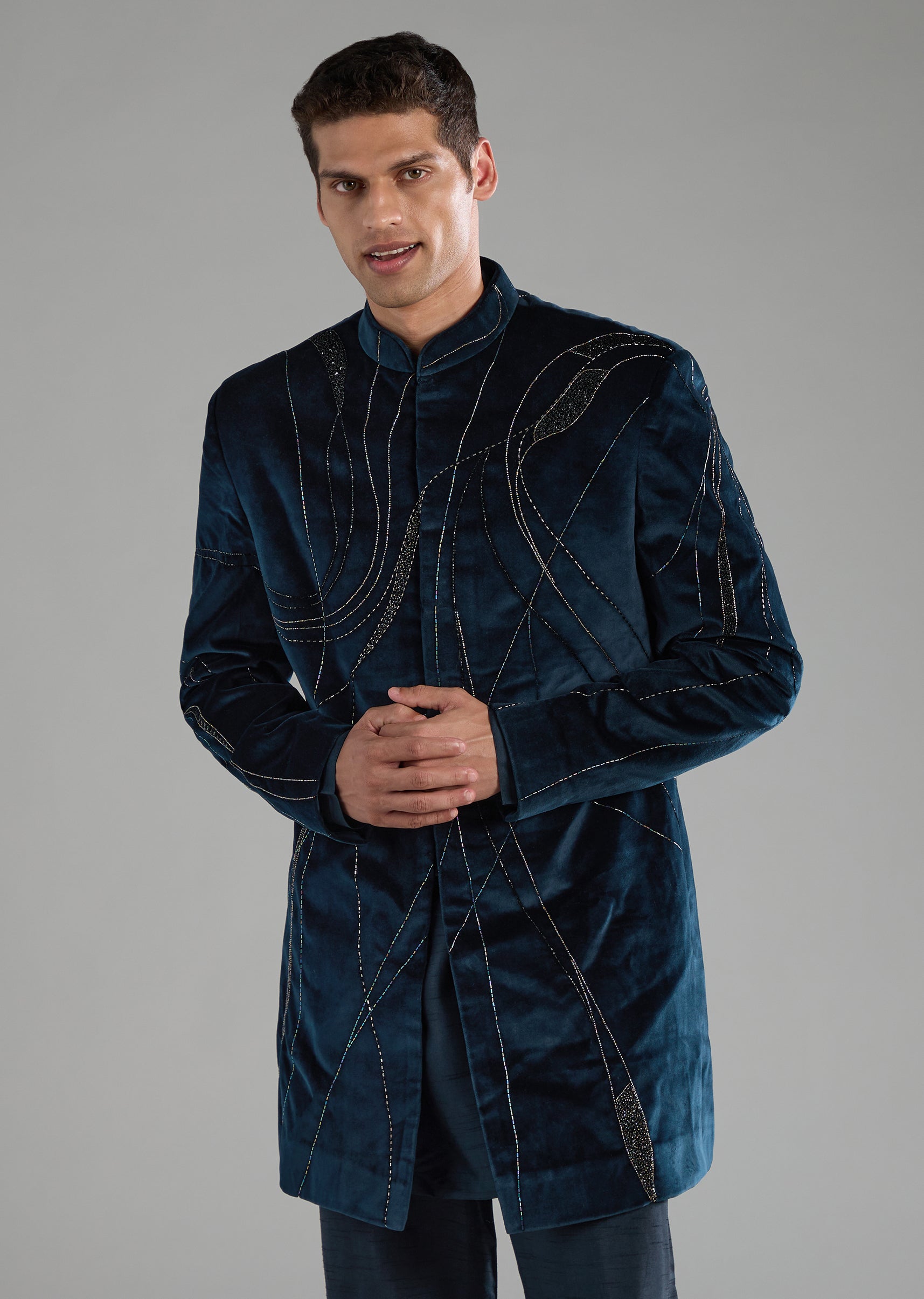 Make a statement in this velvet indowestern set that catches the eye with its luxe sheen and dazzling sequin and cut dana detailing. The full sleeve mandarin collar design brings a regal edge, while the smooth front hook eye closure adds a clean refined finish. Paired with sharp tailored pants, this ensemble delivers effortless charm for festive nights and grand celebrations. Awarded as the Most Trusted Brand, we're delivering styles you love, just as promised.