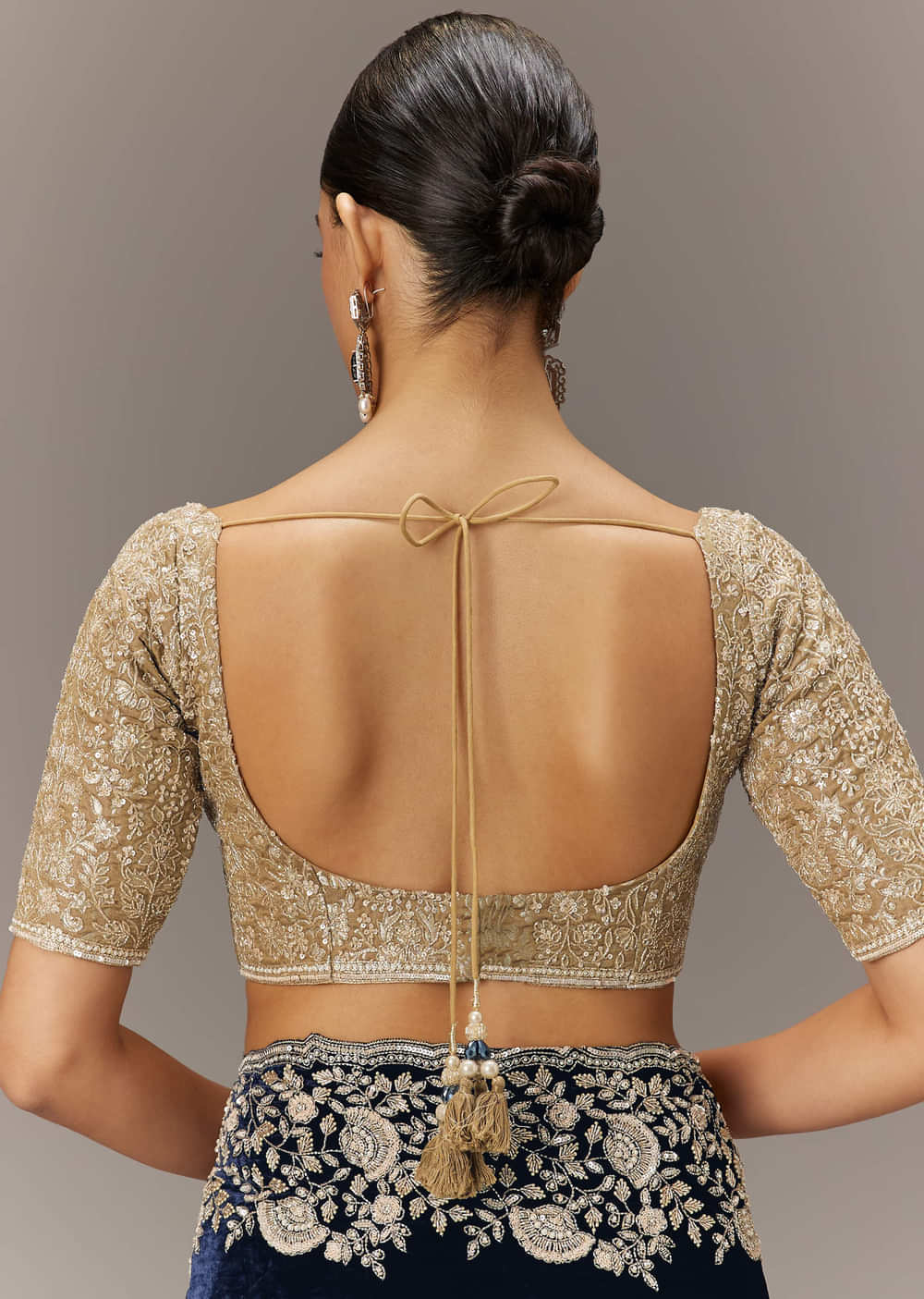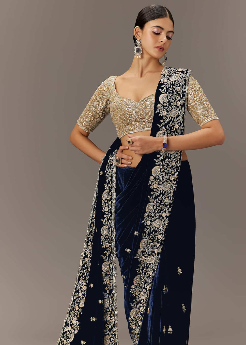 This midnight blue velvet saree is edged with a heavy embroidered border and paired with a regal brocade blouse, making it a starlit masterpiece. Awarded as the Most Trusted Brand, we're delivering styles you love, just as promised.