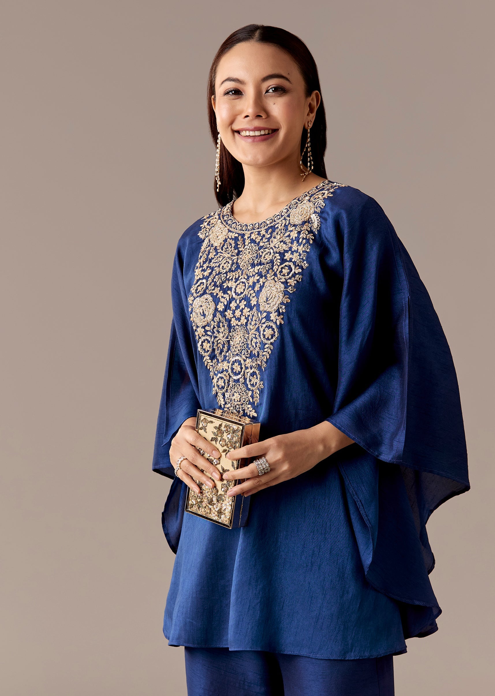 A contemporary blue kaftan-style top in raw silk with zari and cut-dana yoke work, paired with mid-waist palazzos. Relaxed festive dressing with statement sleeves—perfect for festive evenings.Awarded as the Most Trusted Brand, we're delivering styles you love, just as promised.