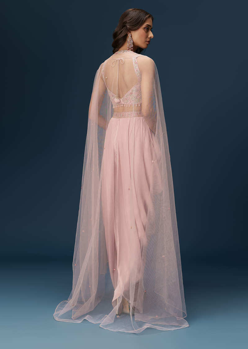 Blush Pink Dhoti Set With Embroidered Blouse And Soft Dupatta