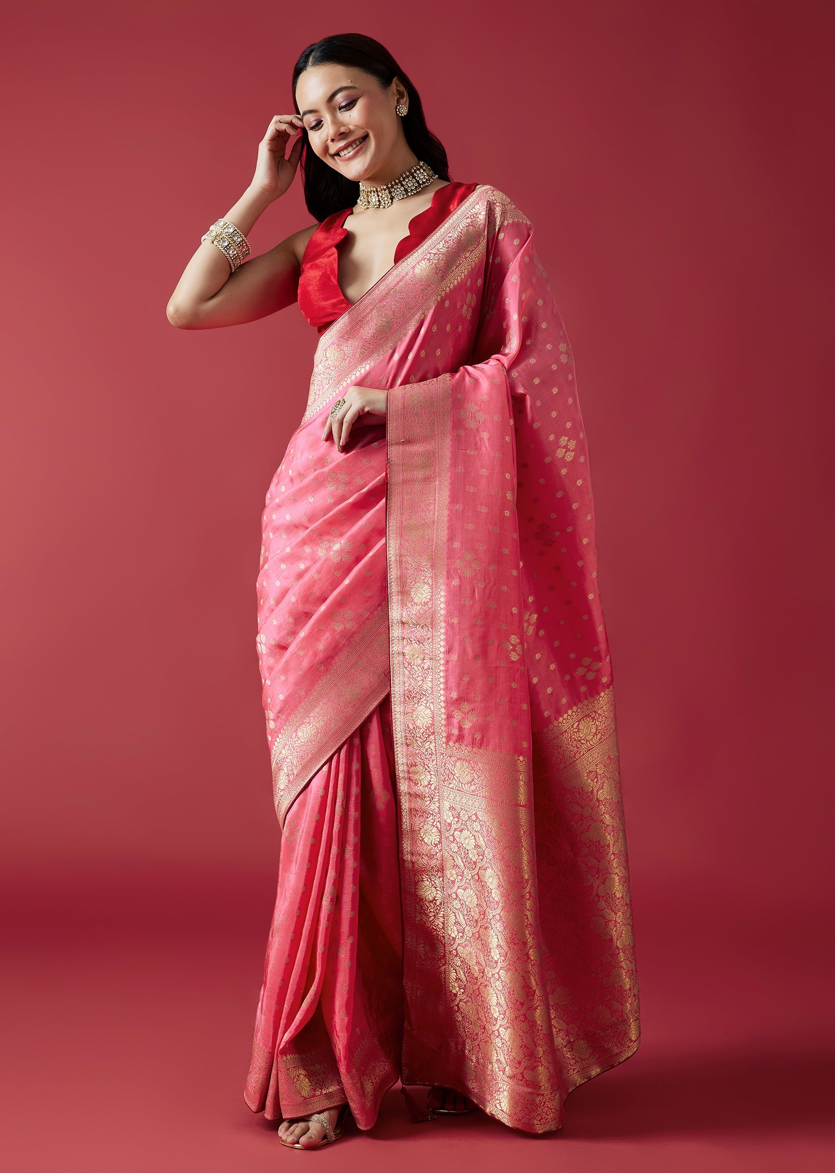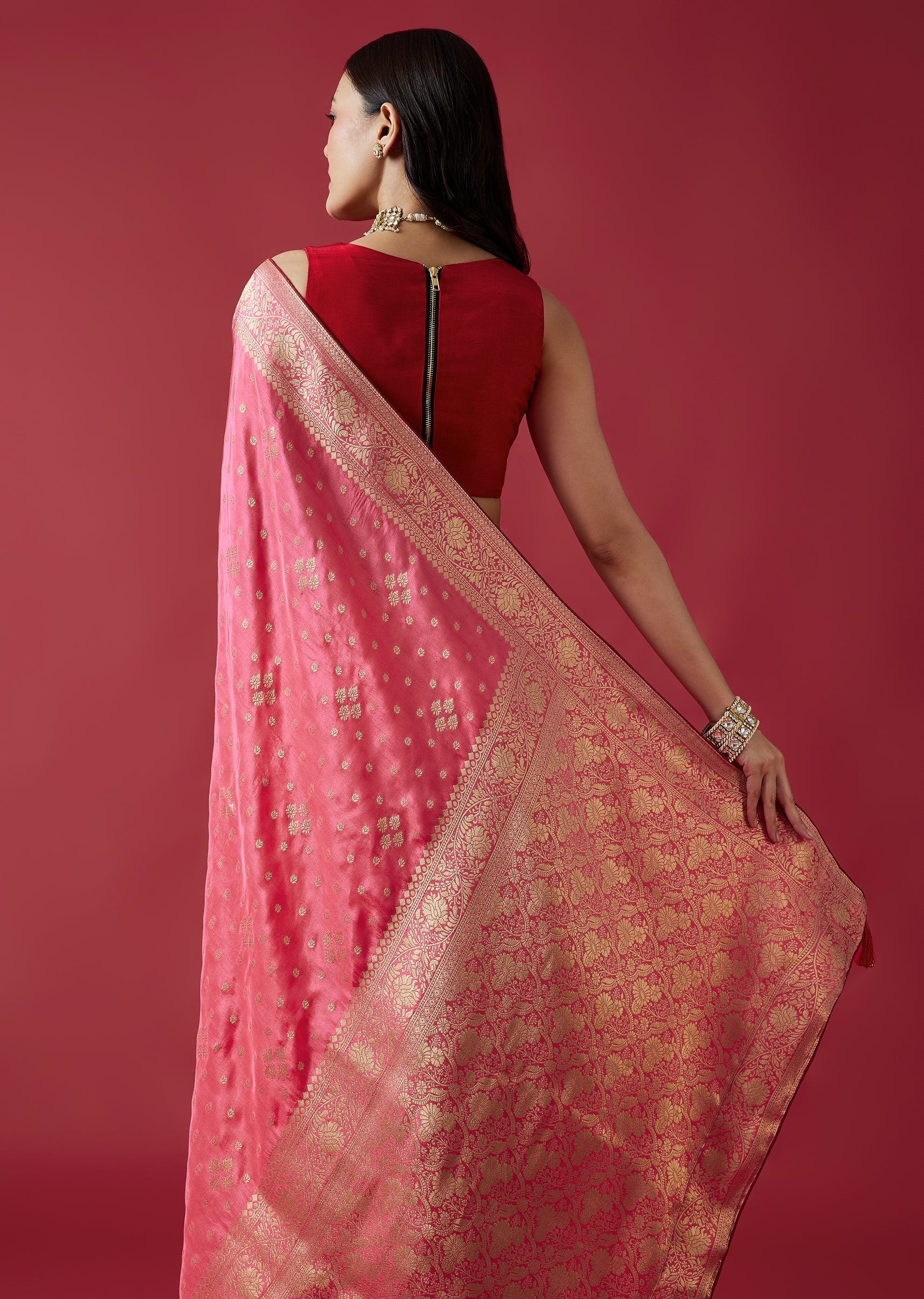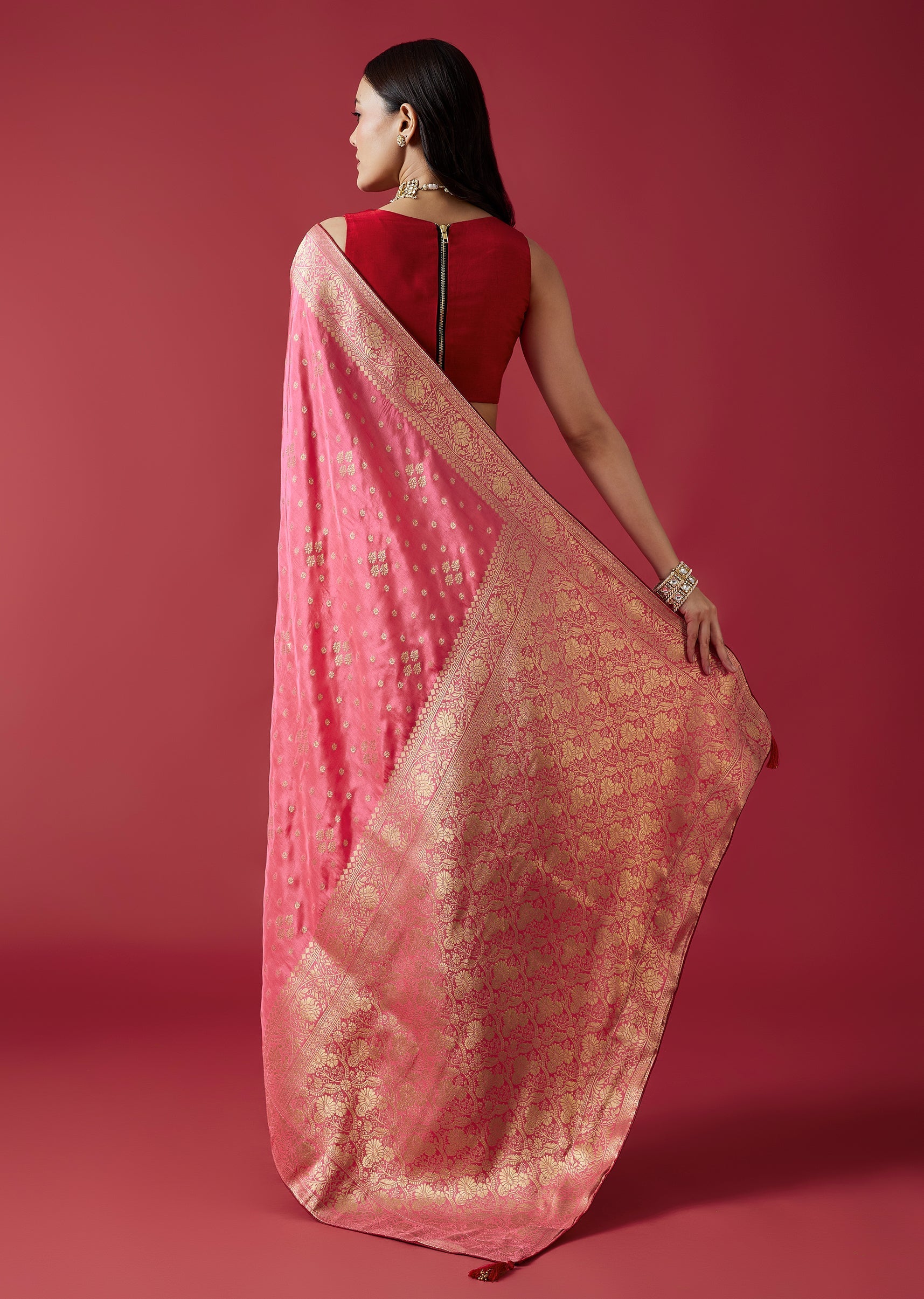The rose pink dola silk saree with zari floral borders exudes timeless grace and festive richness.