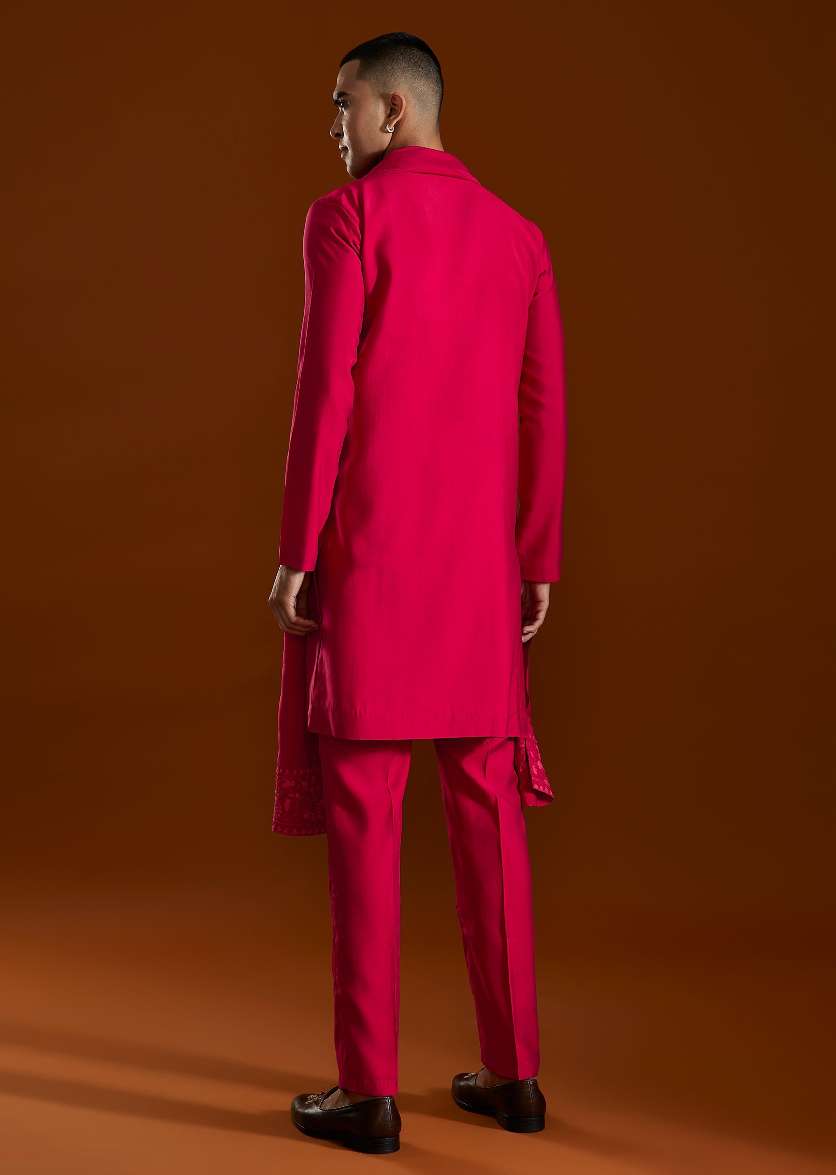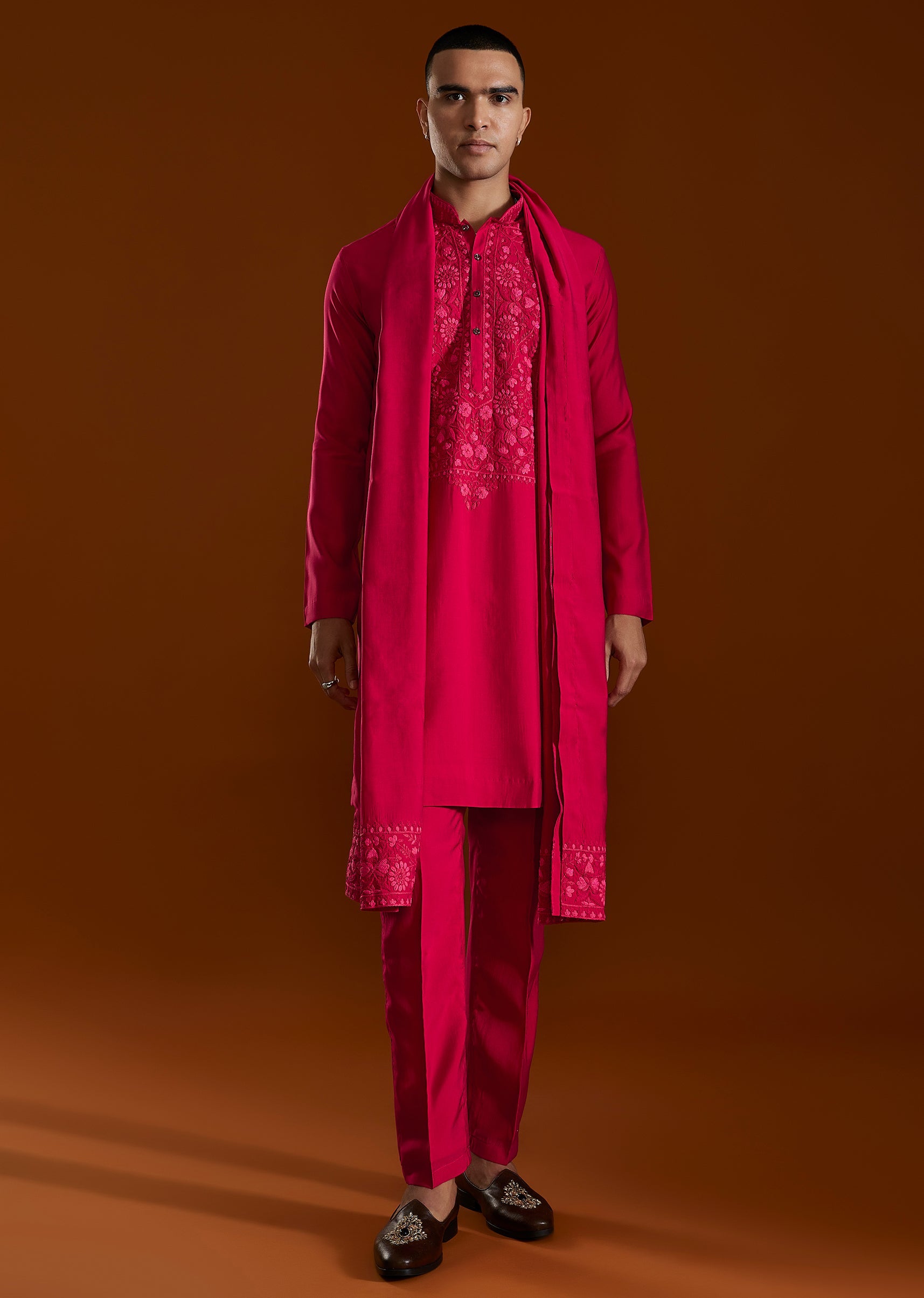 The pink embroidered kurta set complements the look with understated elegance and celebratory detail.
