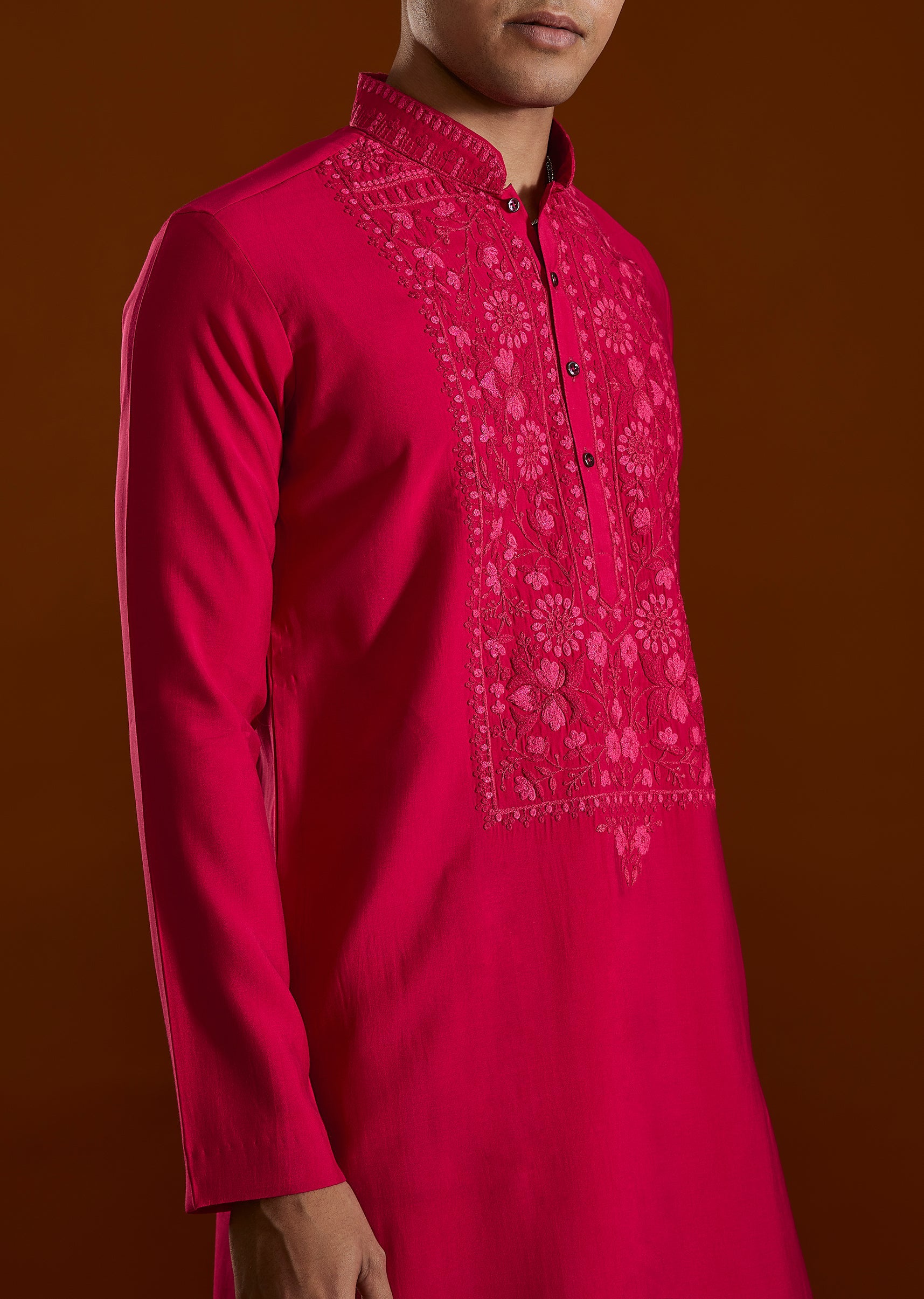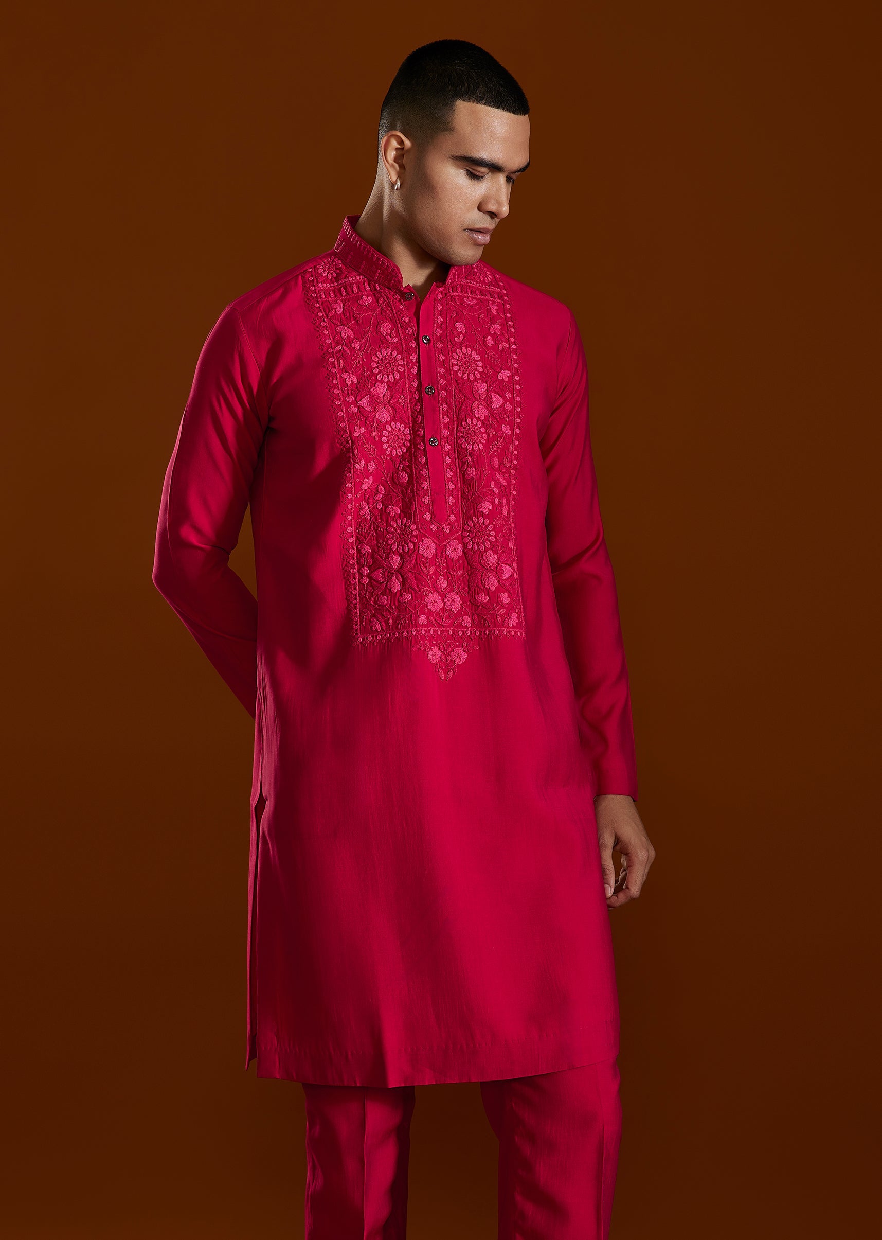 The pink embroidered kurta set complements the look with understated elegance and... More Product Details