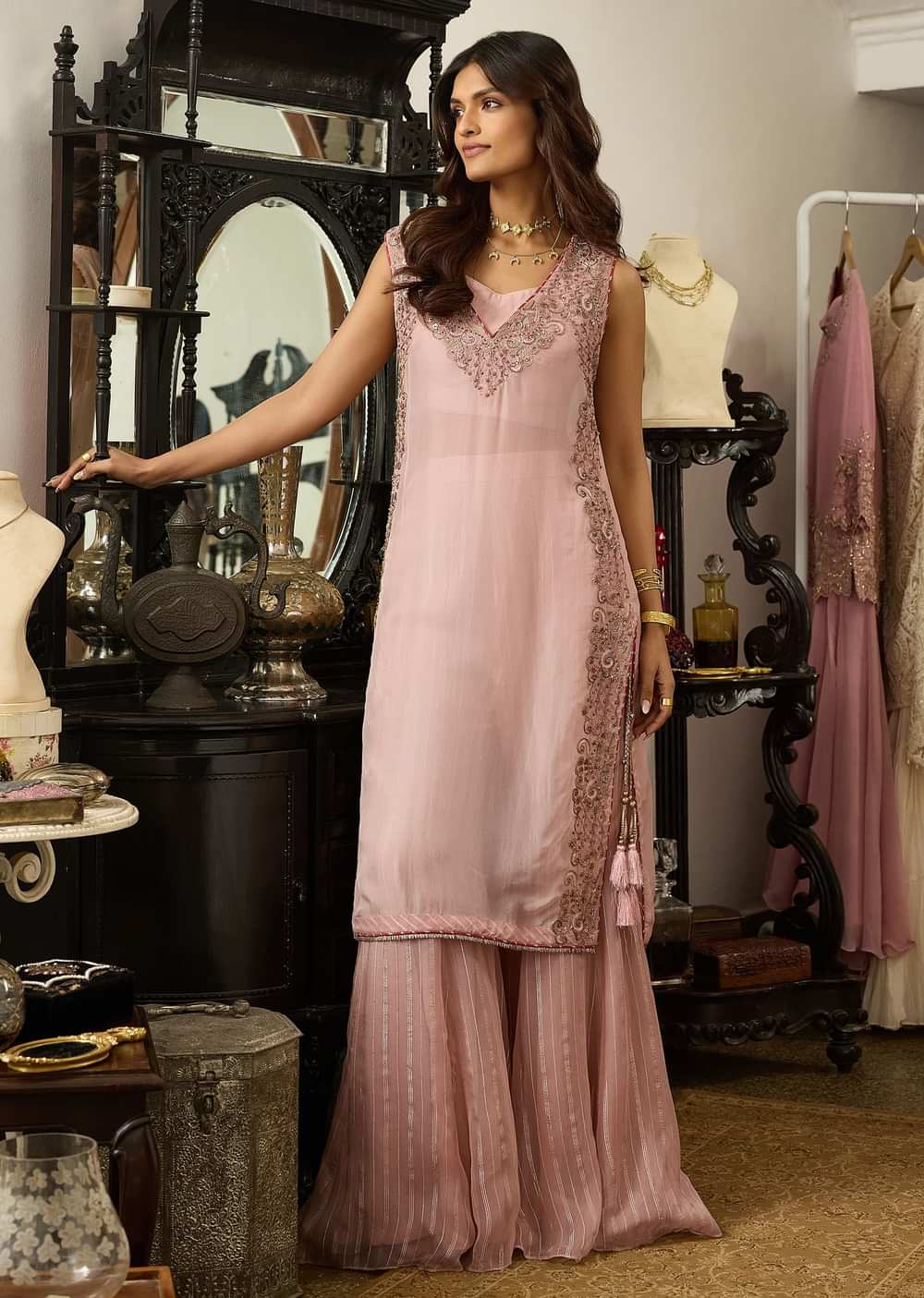 Blush Pink Organza Palazzo Set With Embroidered Kurta