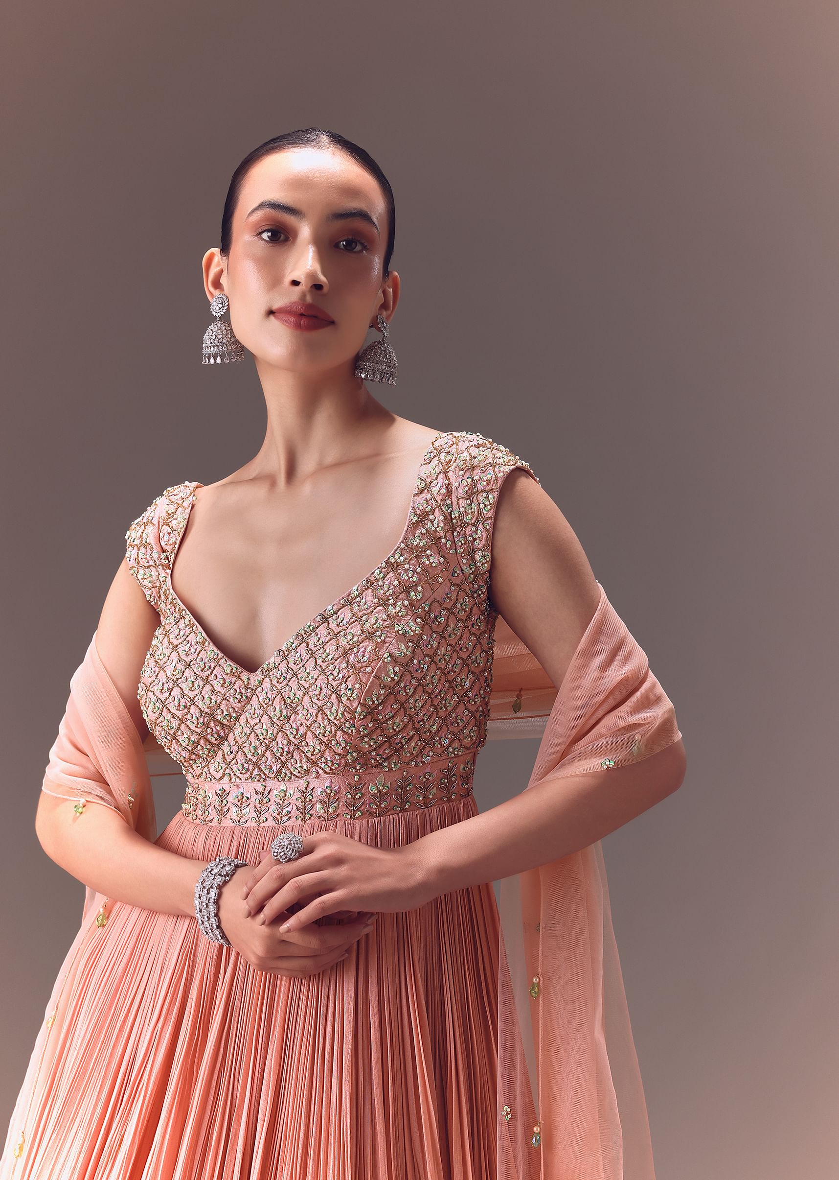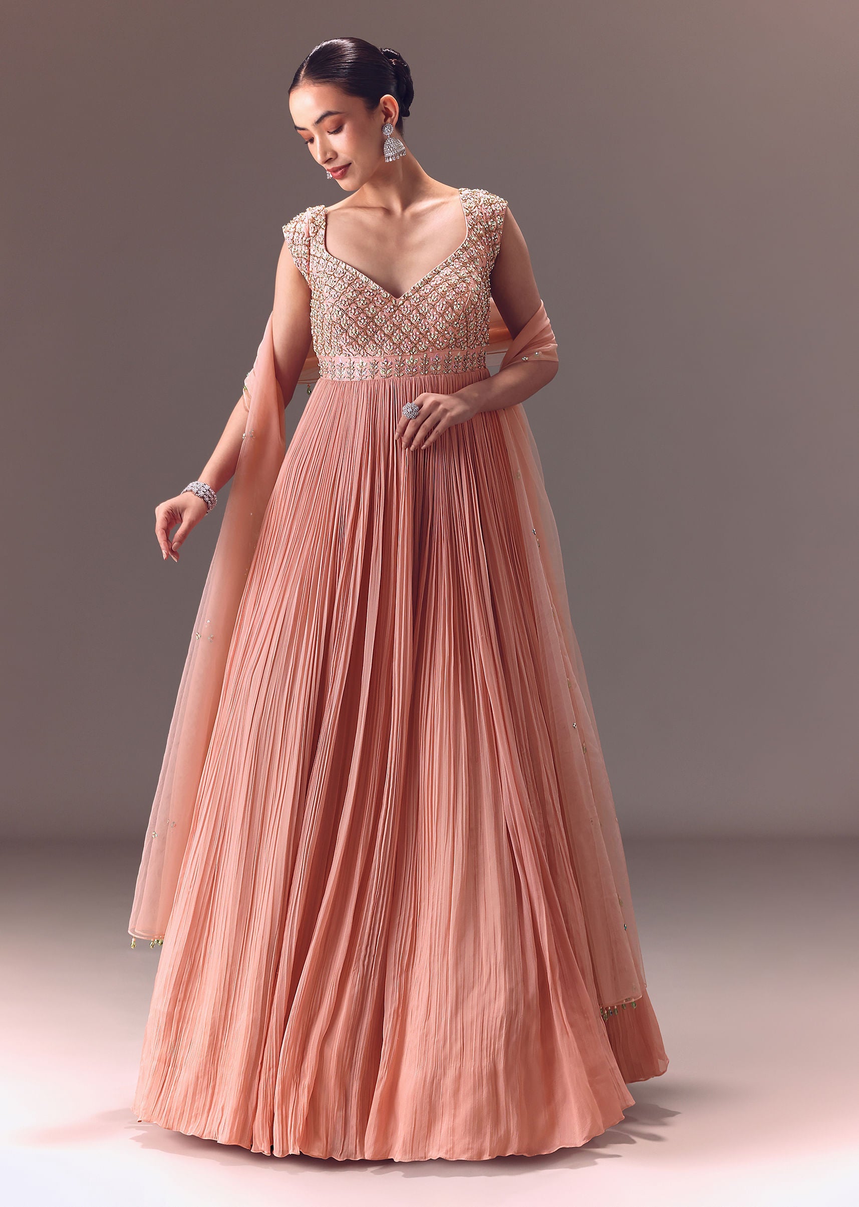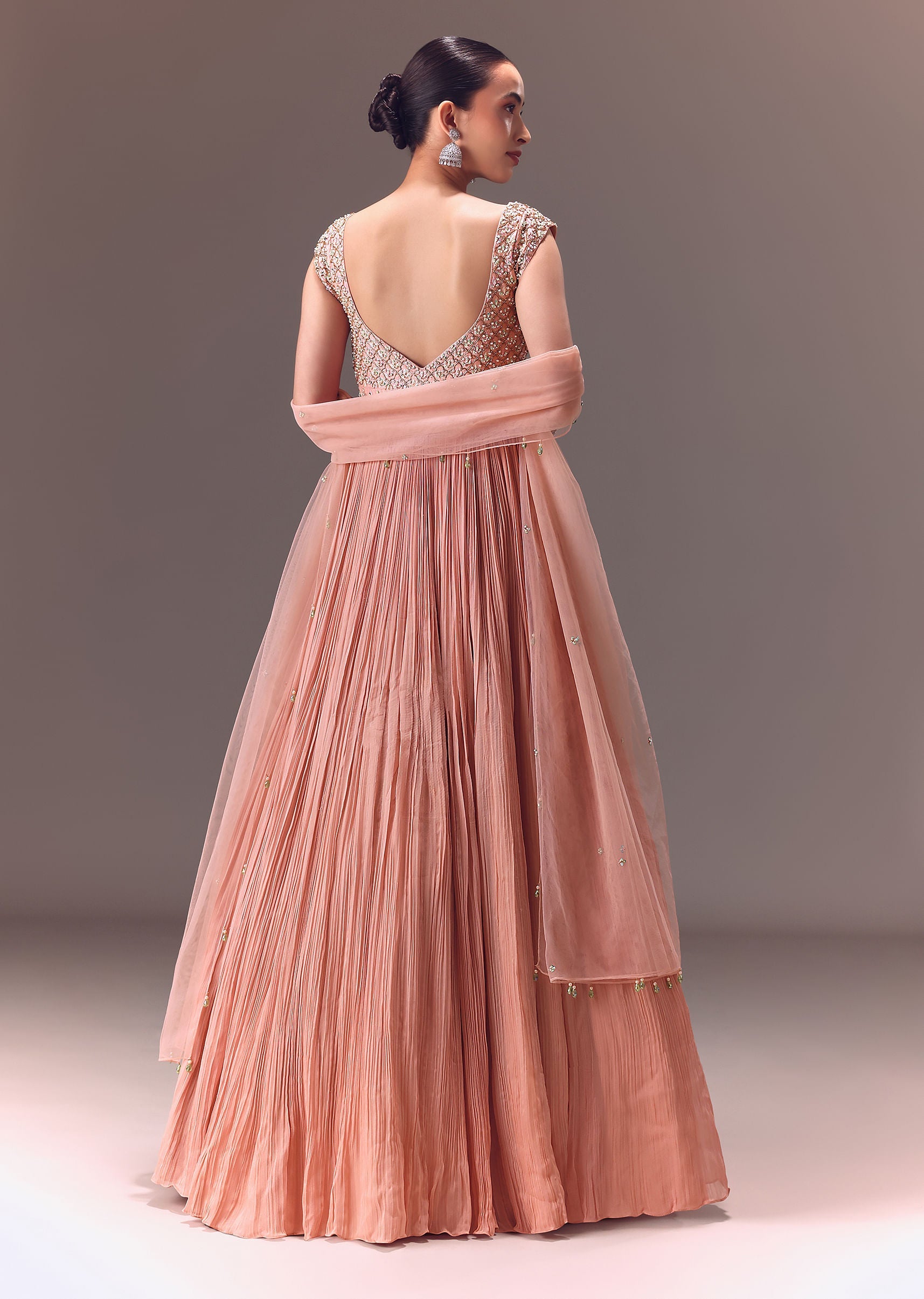 Blush Pink Ruched Anarkali Gown With Dupatta