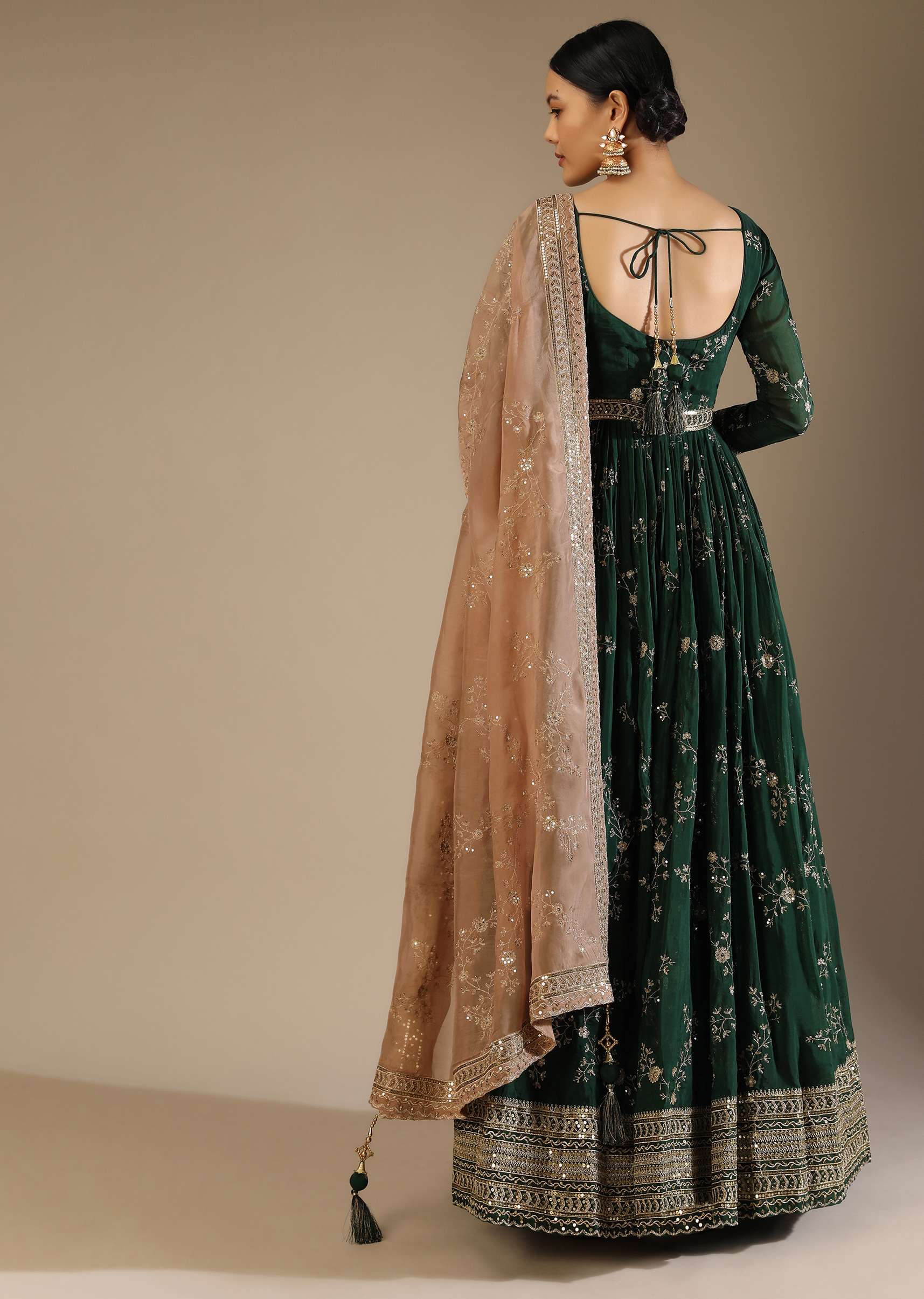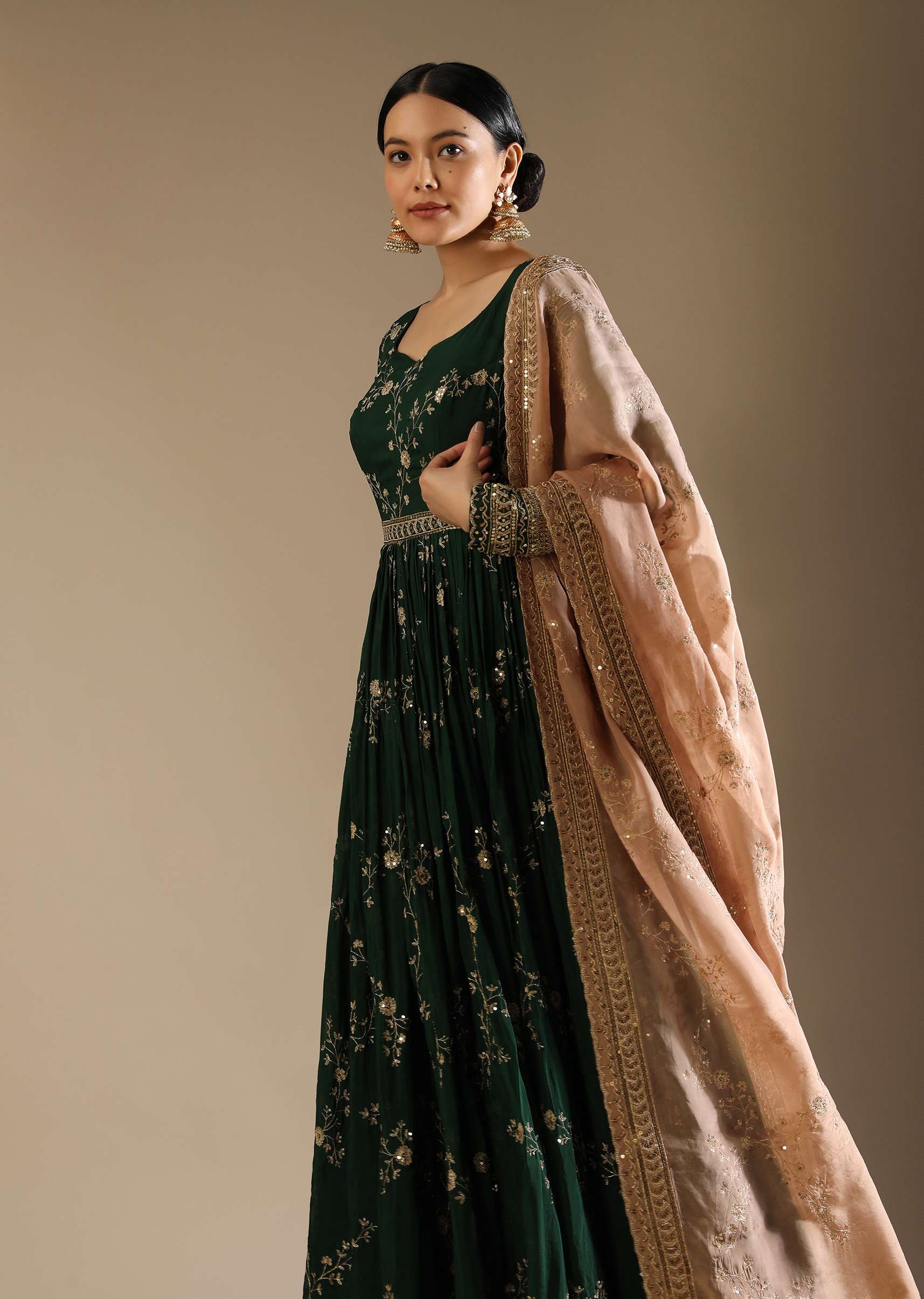 Bottle Green Anarkali Suit In Silk With Zari And Sequins Embroidered Floral Jaal And A Beige Organza Dupatta